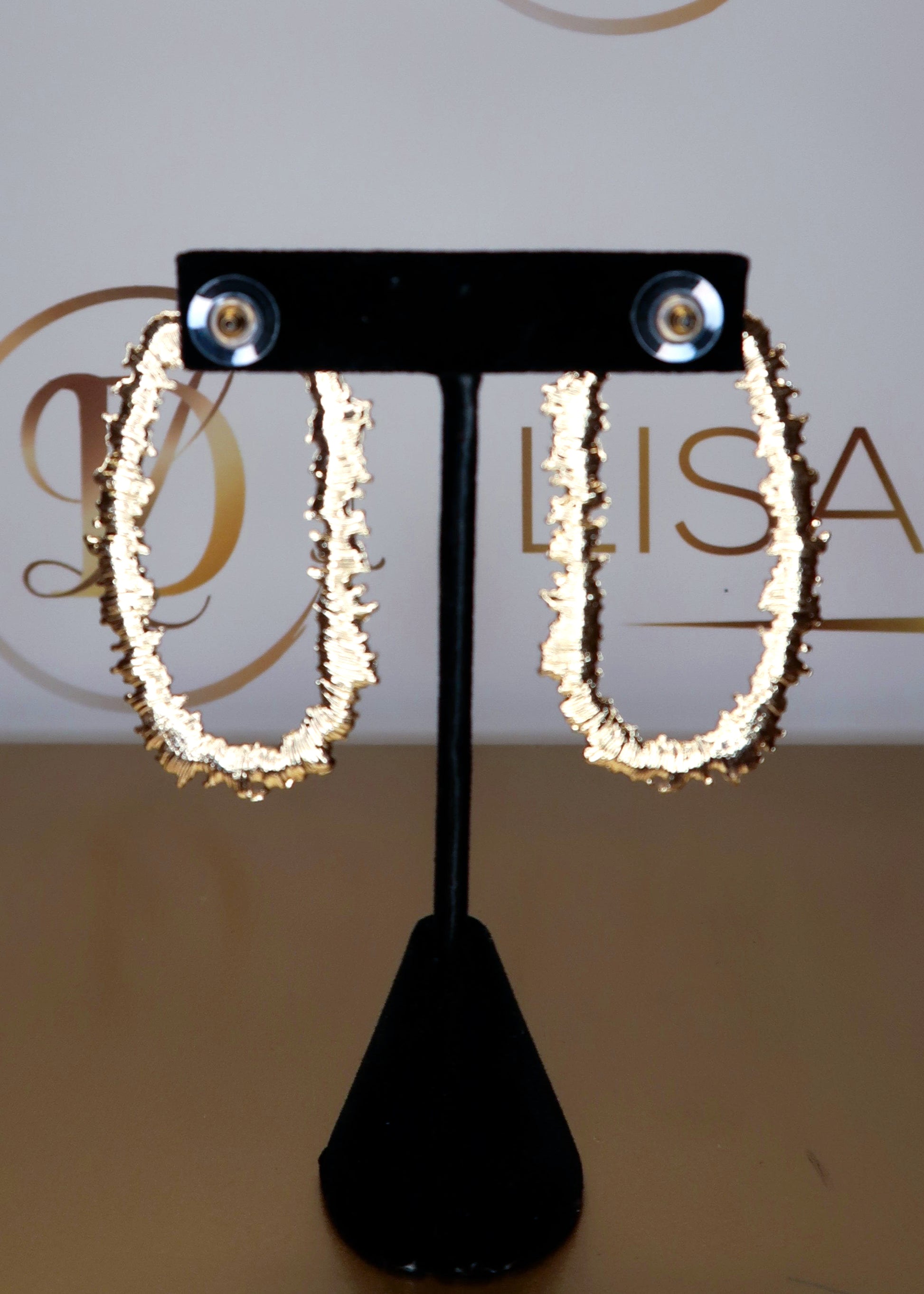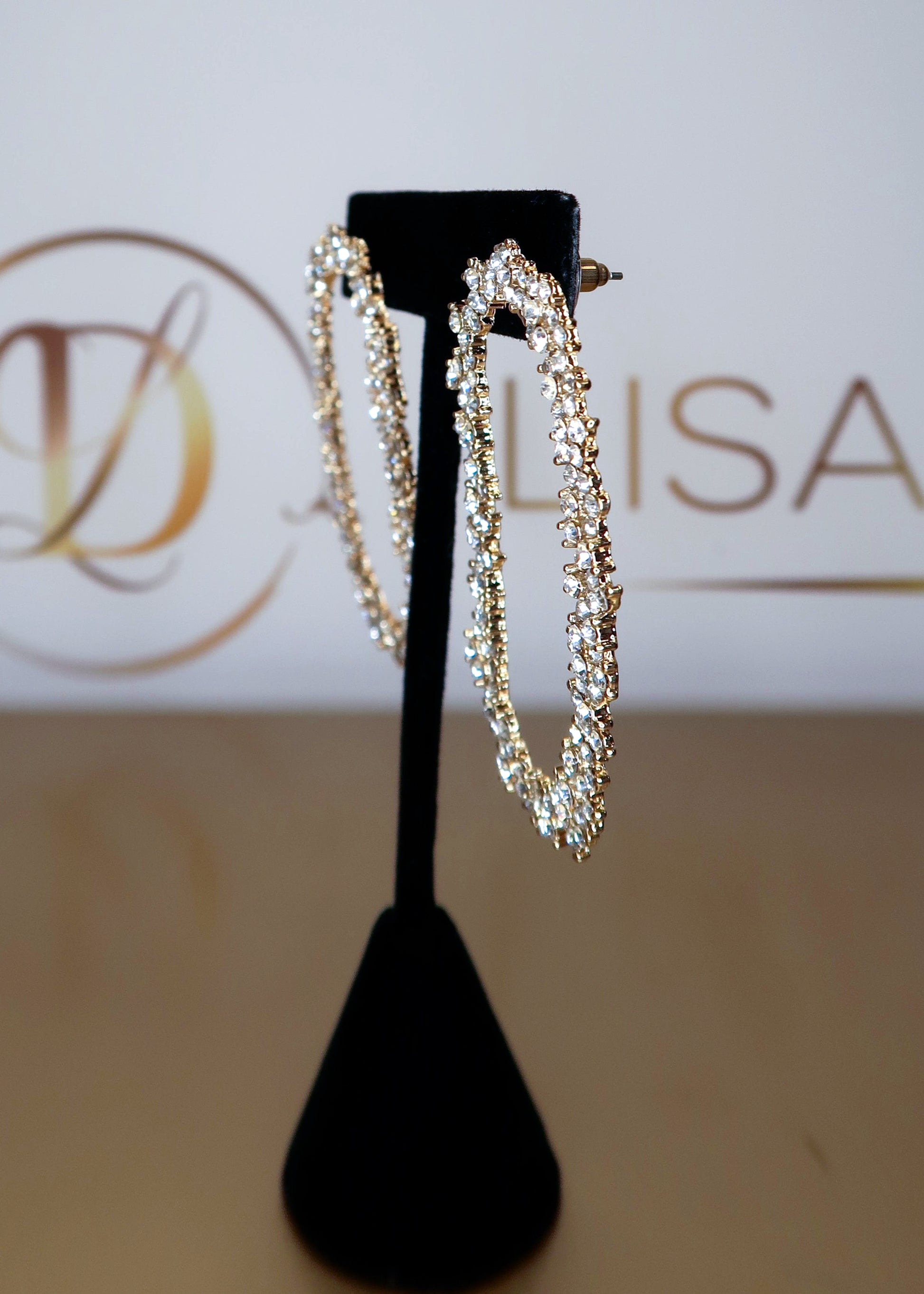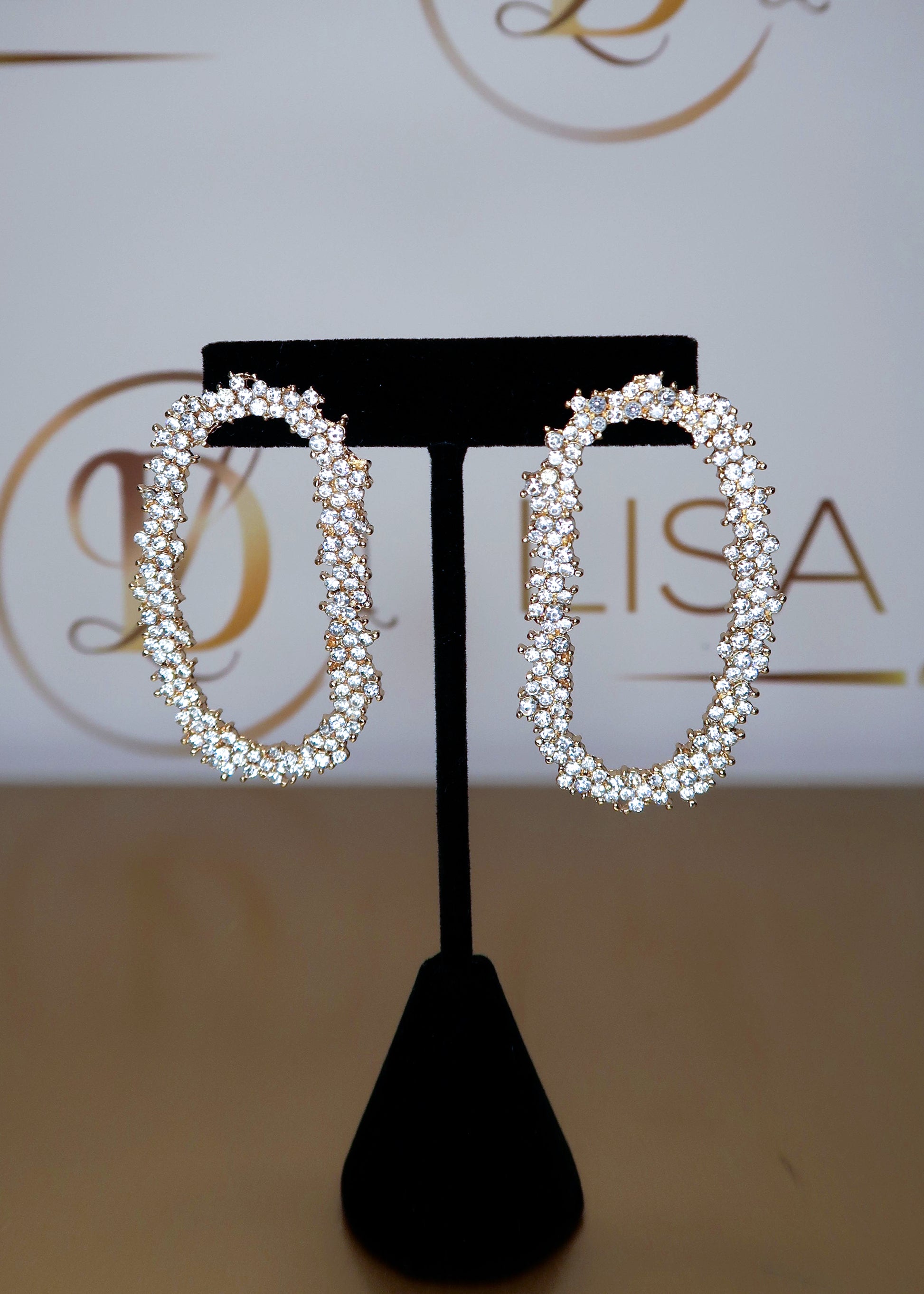 These 18K Gold Plated Oblong Earrings feature clear CZ crystals and are fixed on a post style back. Measure approx. 2 1/4" long and 1 1/4" wide.