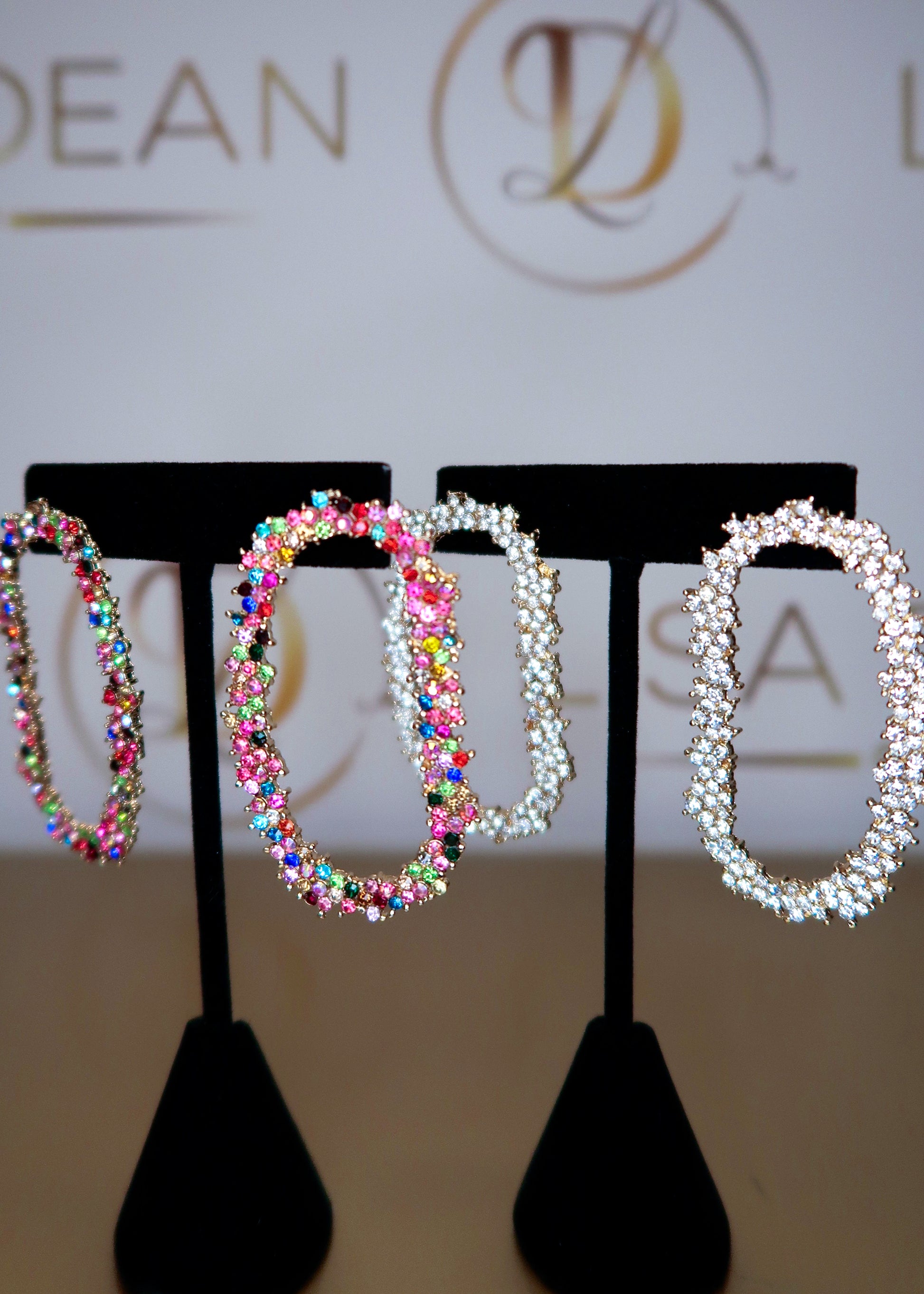 These 18K Gold Plated Oblong Earrings feature an array of multicolor CZ stones on a fixed post style back. Measure approx. 2 1/4" long and 1 1/4" wide.
