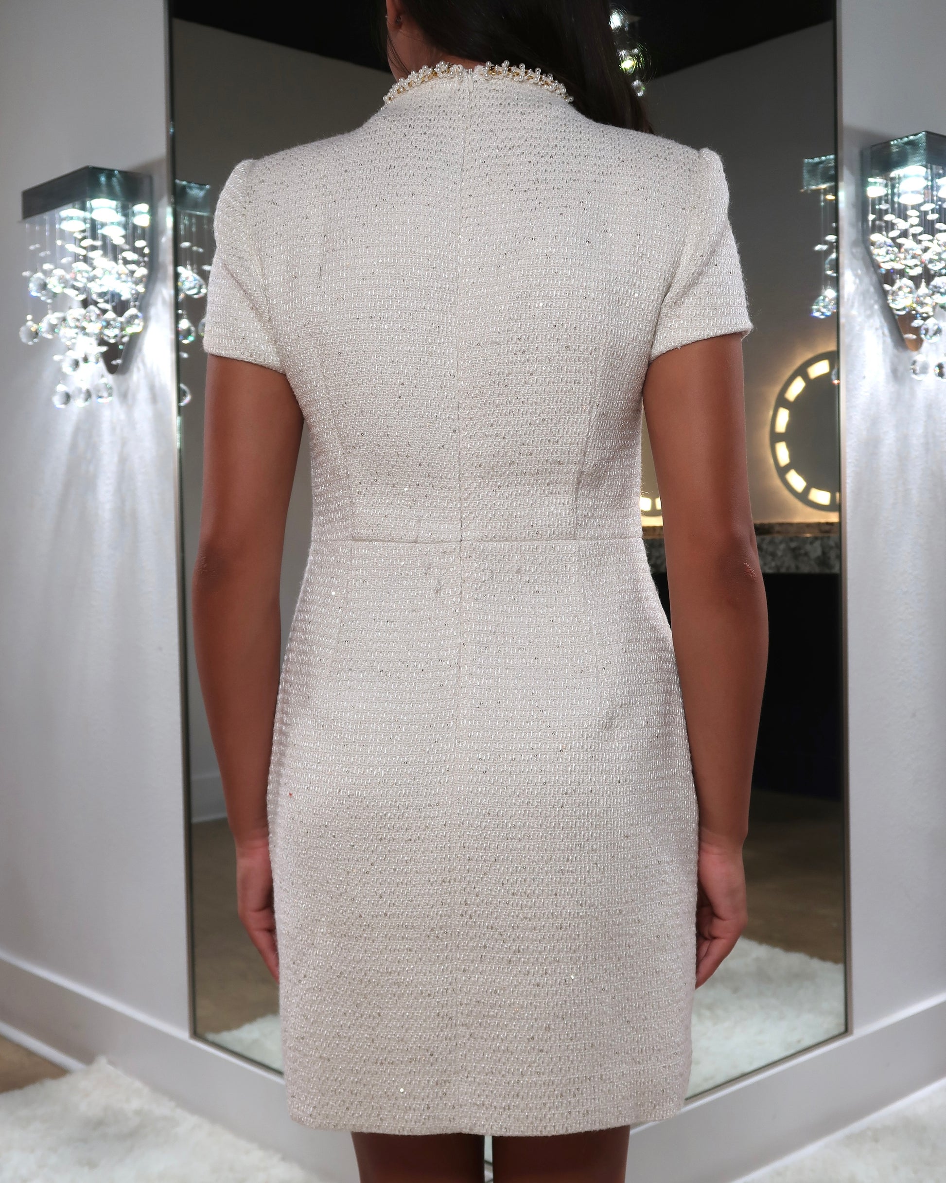 This refined women's tweed dress combines timeless elegance with modern sophistication. Crafted from premium-quality tweed fabric, it features a stylish half turtleneck design for a chic, polished look. Intricate beading adorns the neckline and two front pockets, adding a touch of luxury and meticulous craftsmanship. The short sleeves and above-the-knee length make it versatile for various occasions, from formal gatherings to daytime chic. The fitted waist enhances your silhouette, while the structured tweed texture offers durability and elegance.