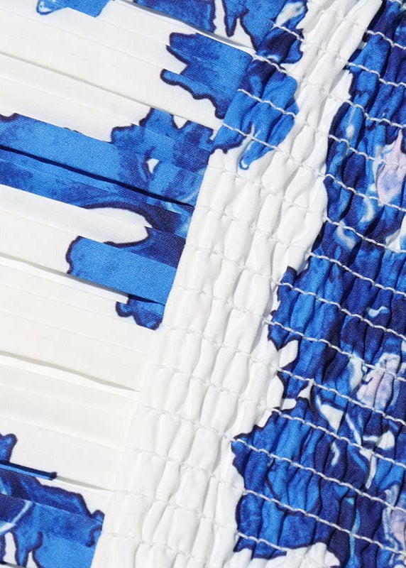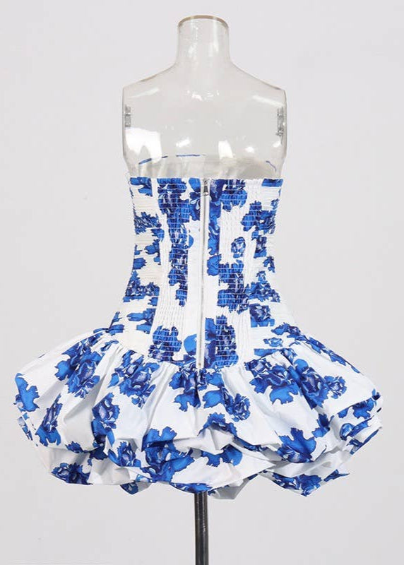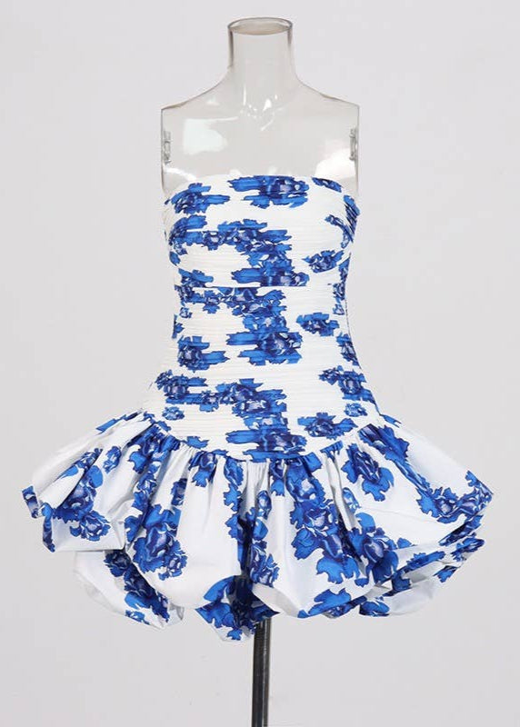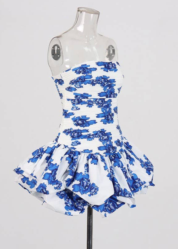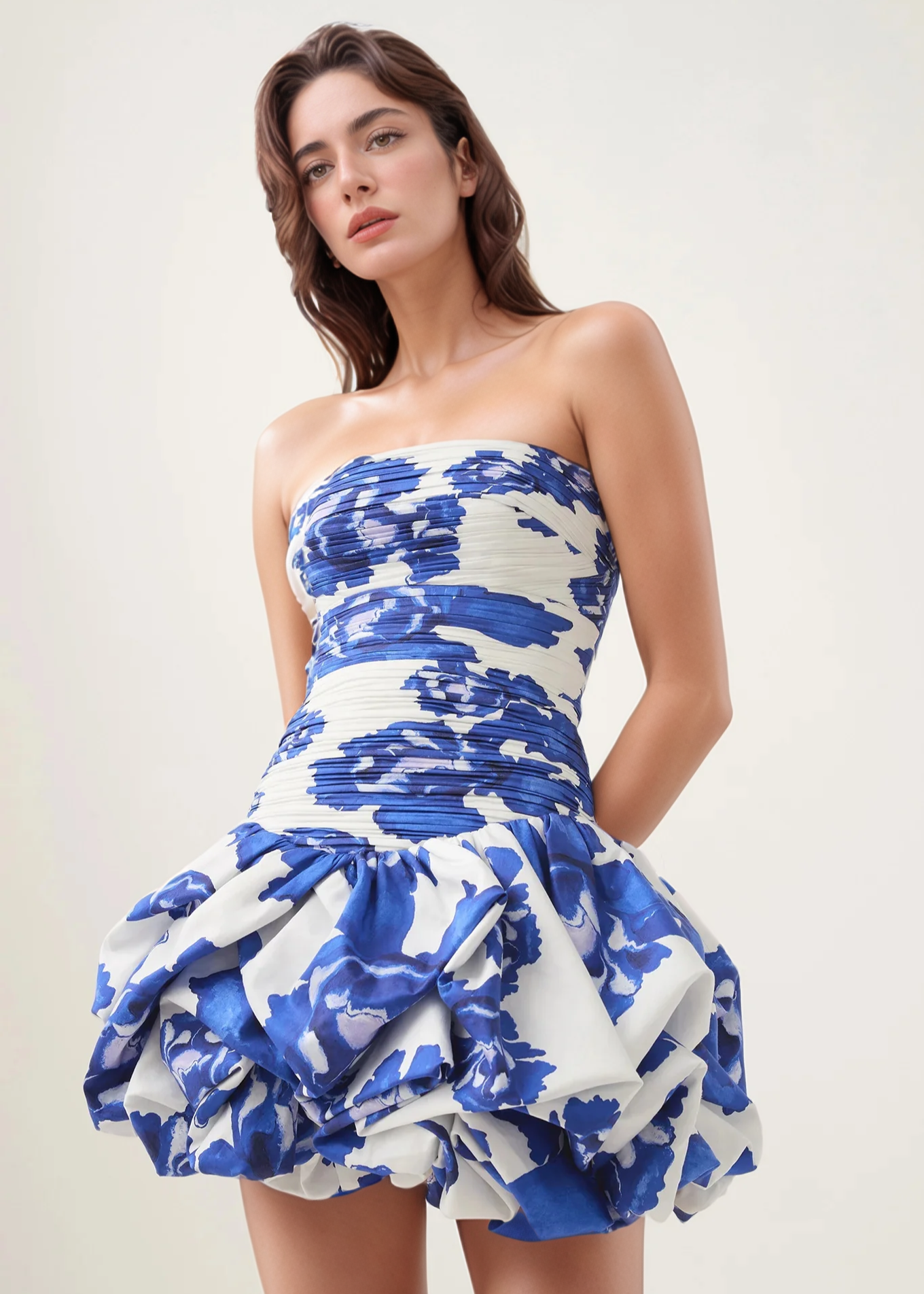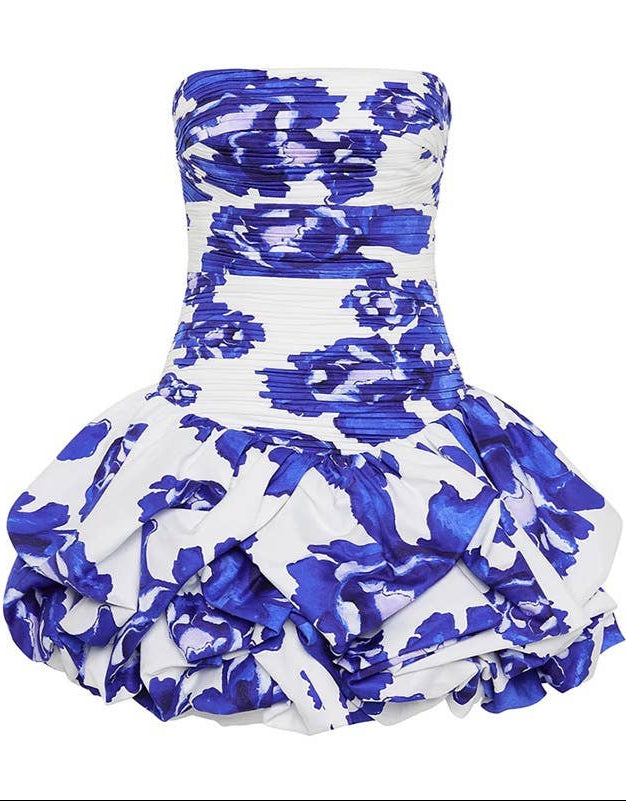 A Lisa Dean Exclusive, the Amalfi Drop Waist Mini speaks for itself! The pleated strapless tube top style bodice flows into a drop waist and is met with a voluminous layered bubble skirt. The vibrant blue floral print on a crisp white backdrop screams Italian Getaway! Features a partially smocked back and central back zipper to ensure the perfect fit and all day comfort.Â