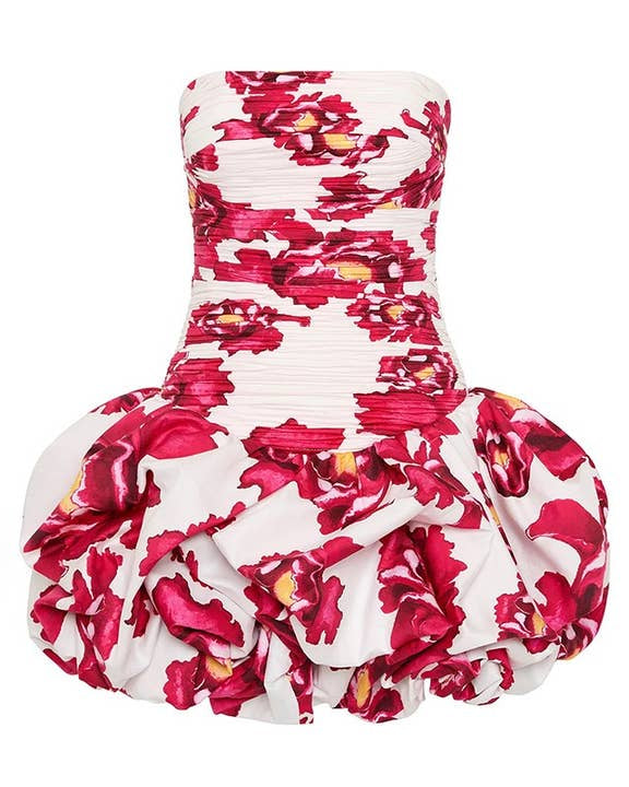 A Lisa Dean Exclusive, the Amalfi Drop Waist Mini speaks for itself! The pleated strapless tube top style bodice flows into a drop waist and is met with a voluminous layered bubble skirt. The vibrant red and pink tone floral print on a crisp white backdrop screams Italian Getaway! Features a partially smocked back and central back zipper to ensure the perfect fit and all day comfort.Â