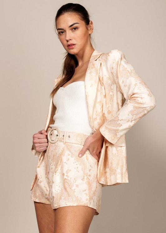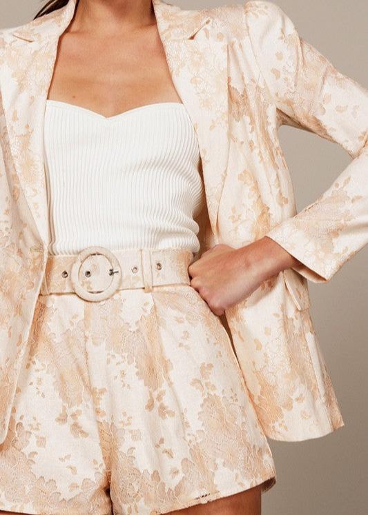 The Bailey Set is a tailored look with a comfortable fit! The lace burn-out style jacquard features a complimenting blush lining on both shorts and blazer. The blazer jacket boasts a padded shoulder and subtle puff sleeve to compliment the feminine figure, faux pockets, and a single front button closure. The relaxed fit shorts feature a pleat for subtle volume, invisible back zipper, and a matching functional belt.Â