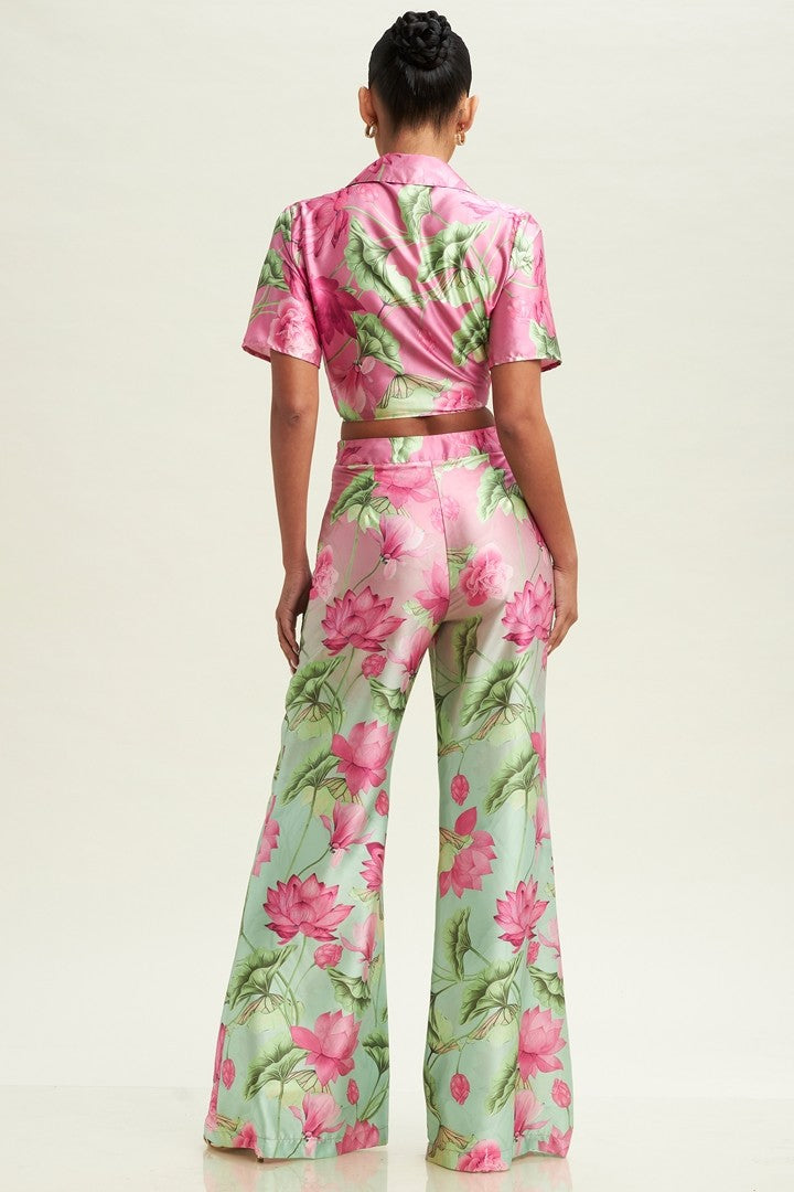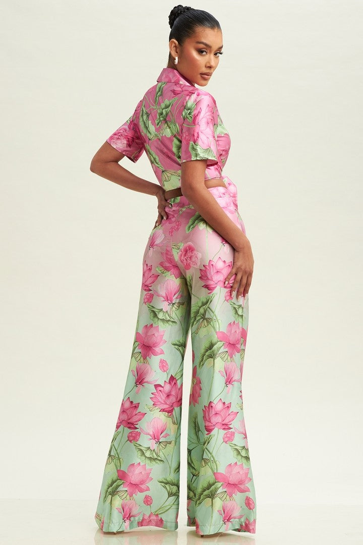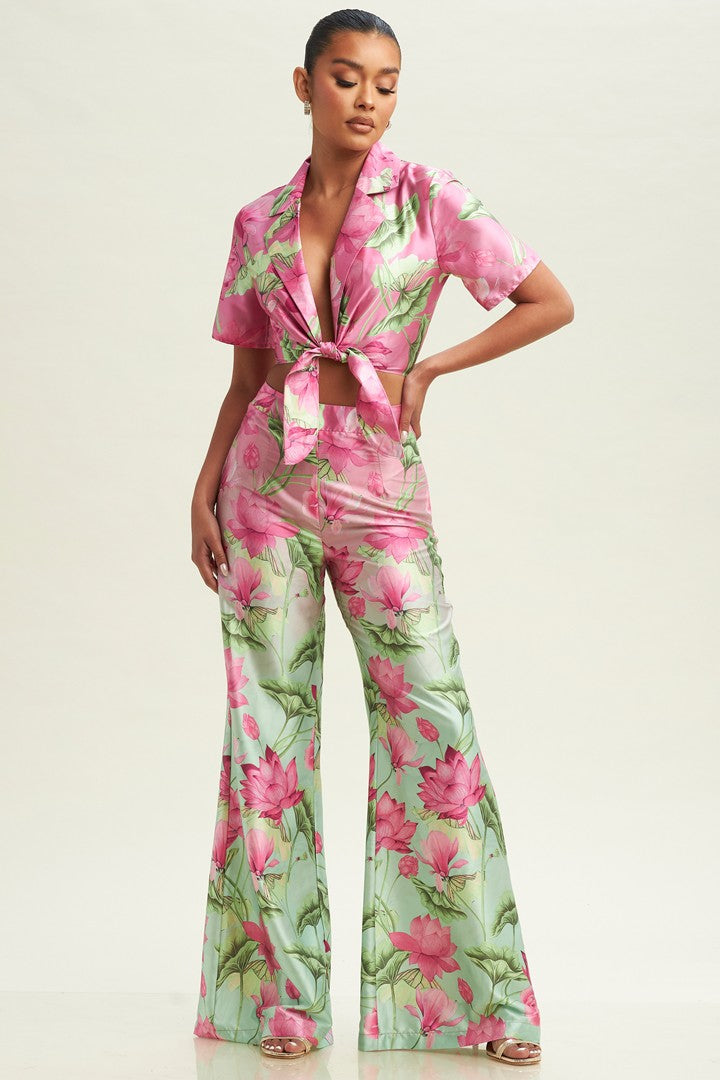 This set is perfect for a vacation or everyday wear! This set features a front tie top with matching flare pants. This set has a green and pink floral pattern. The pants have a side invisible zipper.