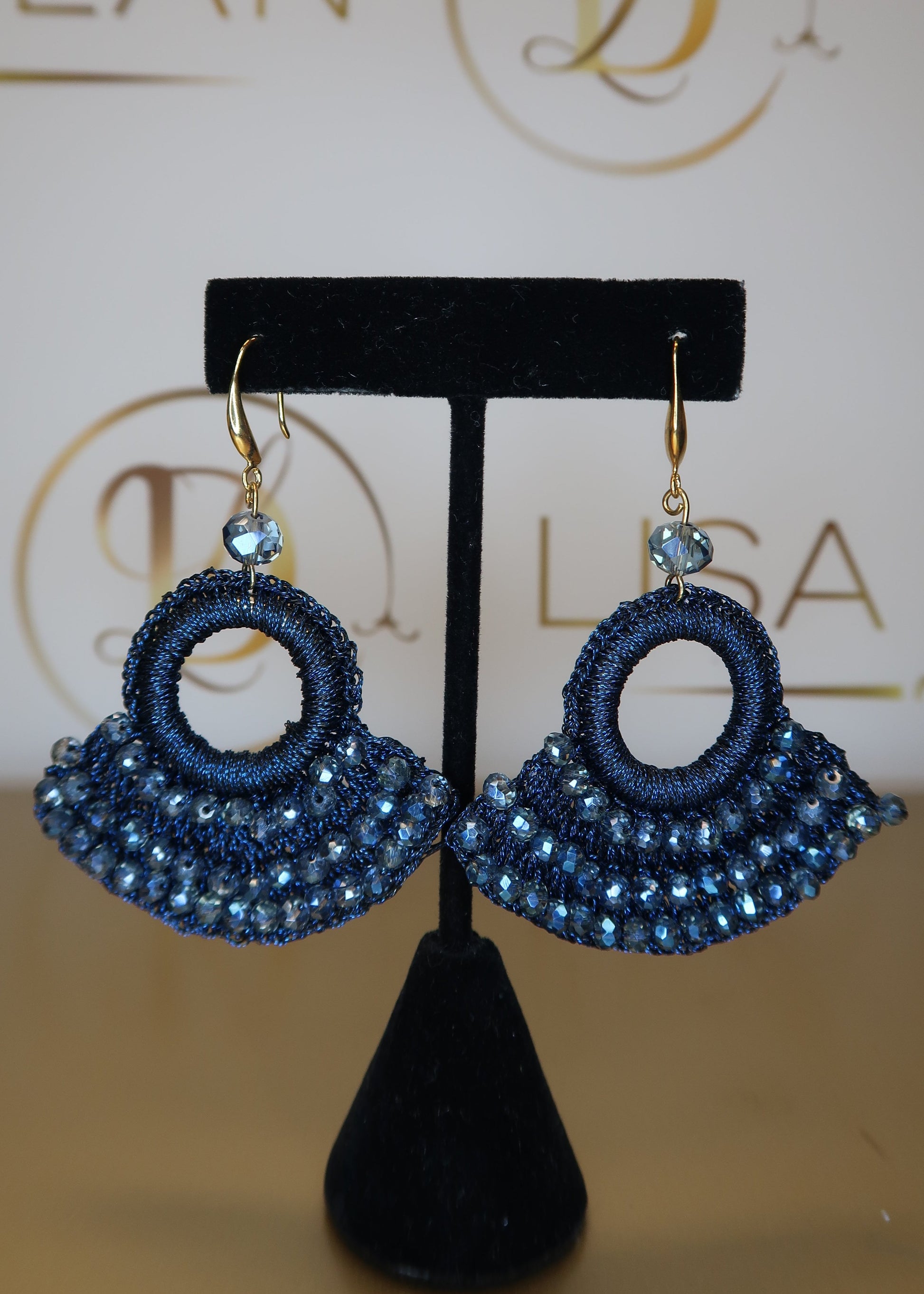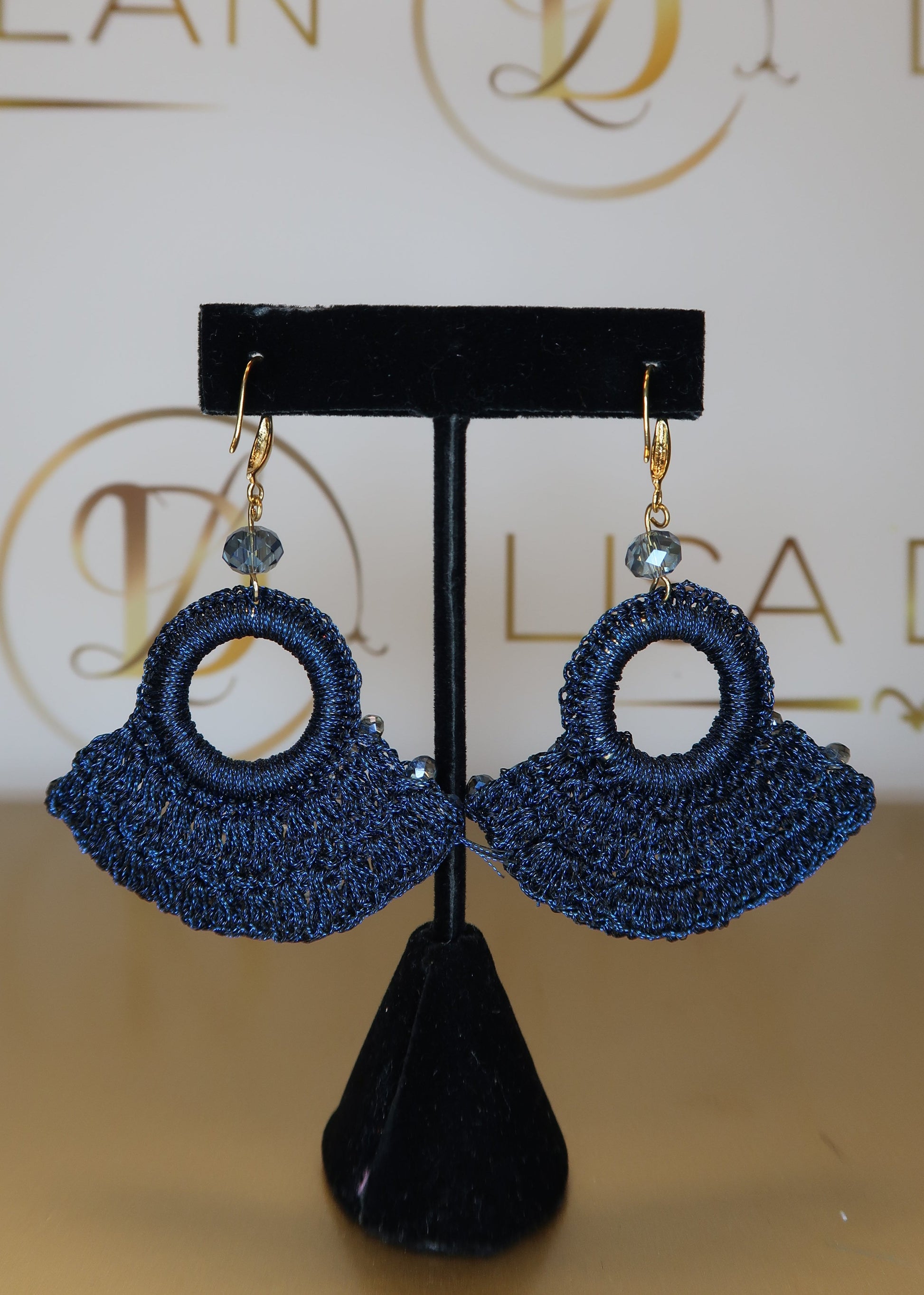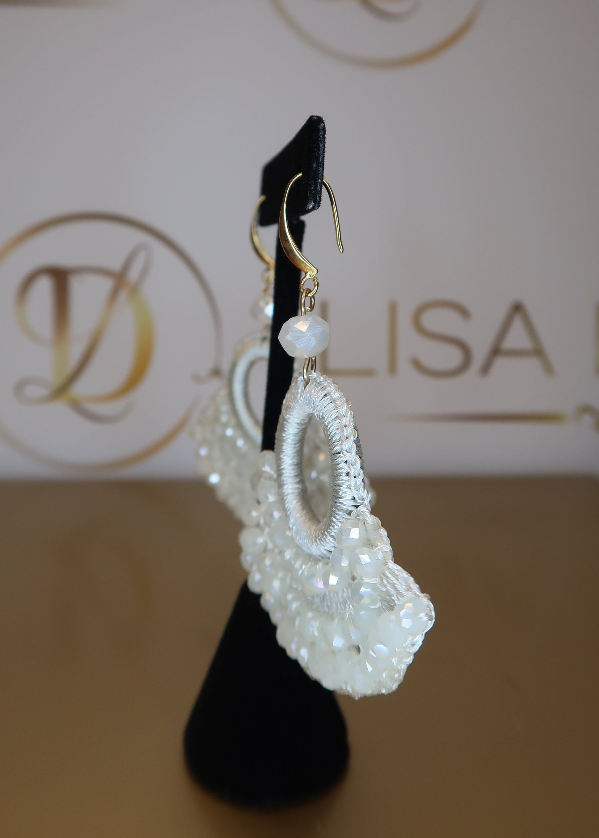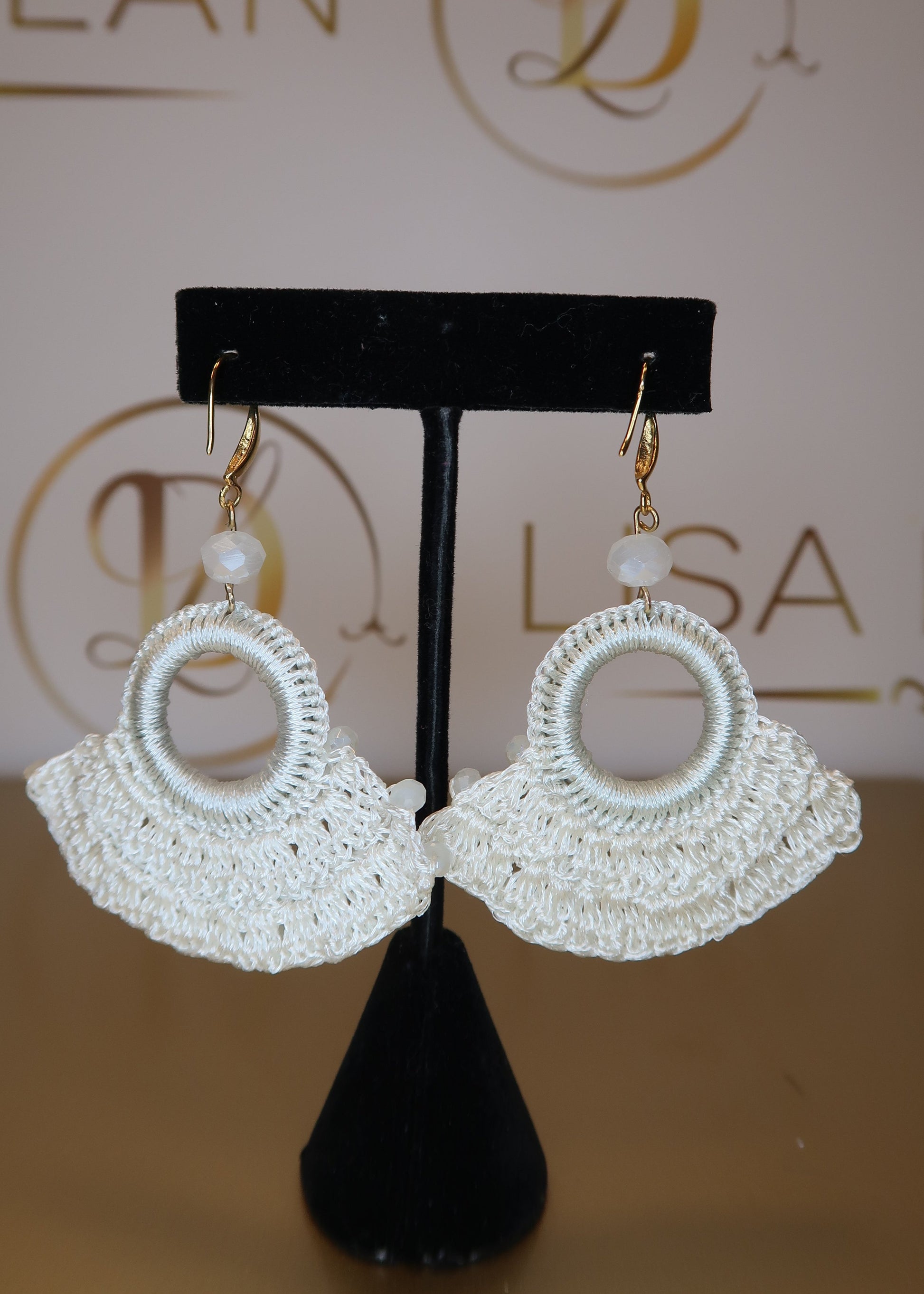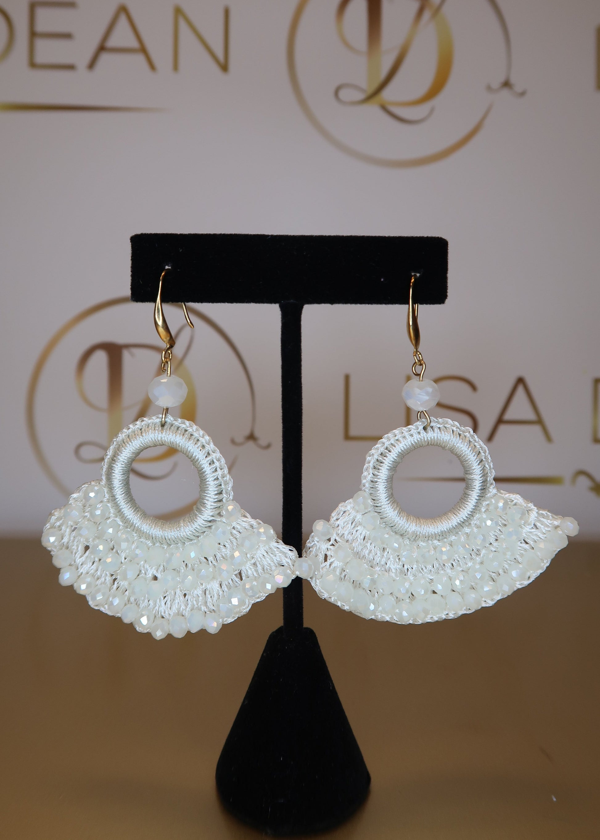 Available in both White and Navy, these lightweight chandelier statement earrings have coordinating beads woven into the crochet and are mounted on gold color hook backings.