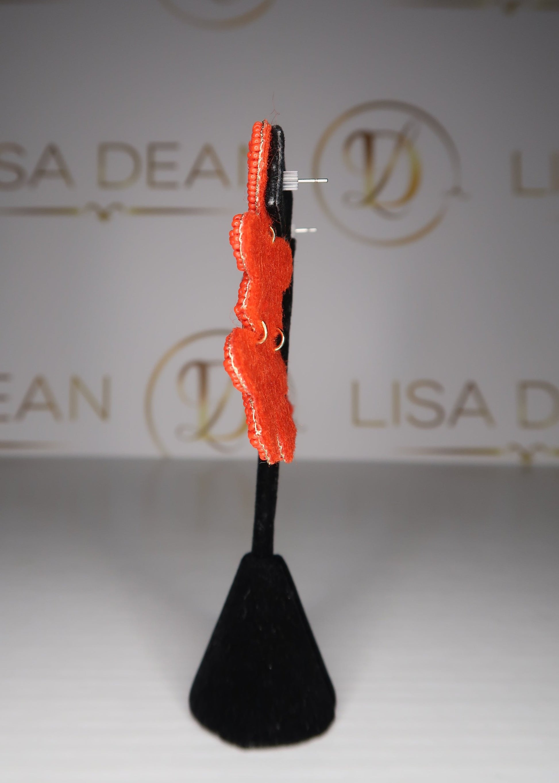 Fall in love with these gorgeous scarlet red heart and bow earrings! Lightweight seed beads with gold thread outlines on a felt backed post.