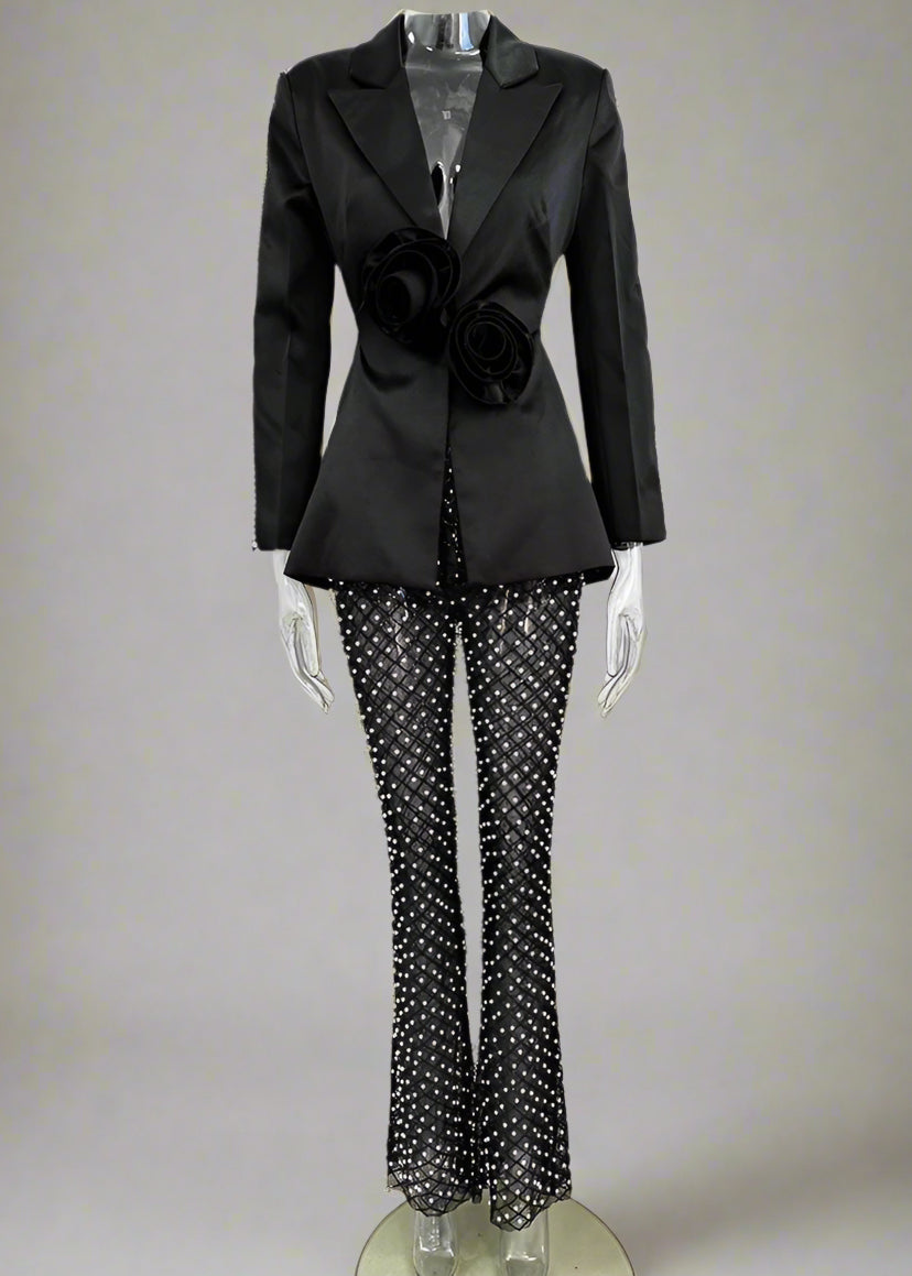 Illusion beaded mesh unlined pants with a satin suit top and cut out low back! Blazer provides coverage on pants, but you can always add a nude or coordinating underwear!