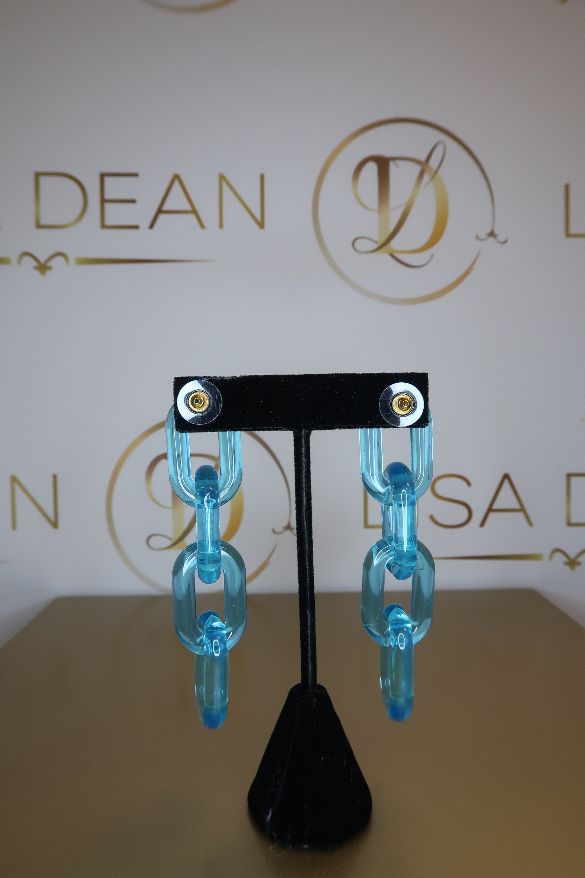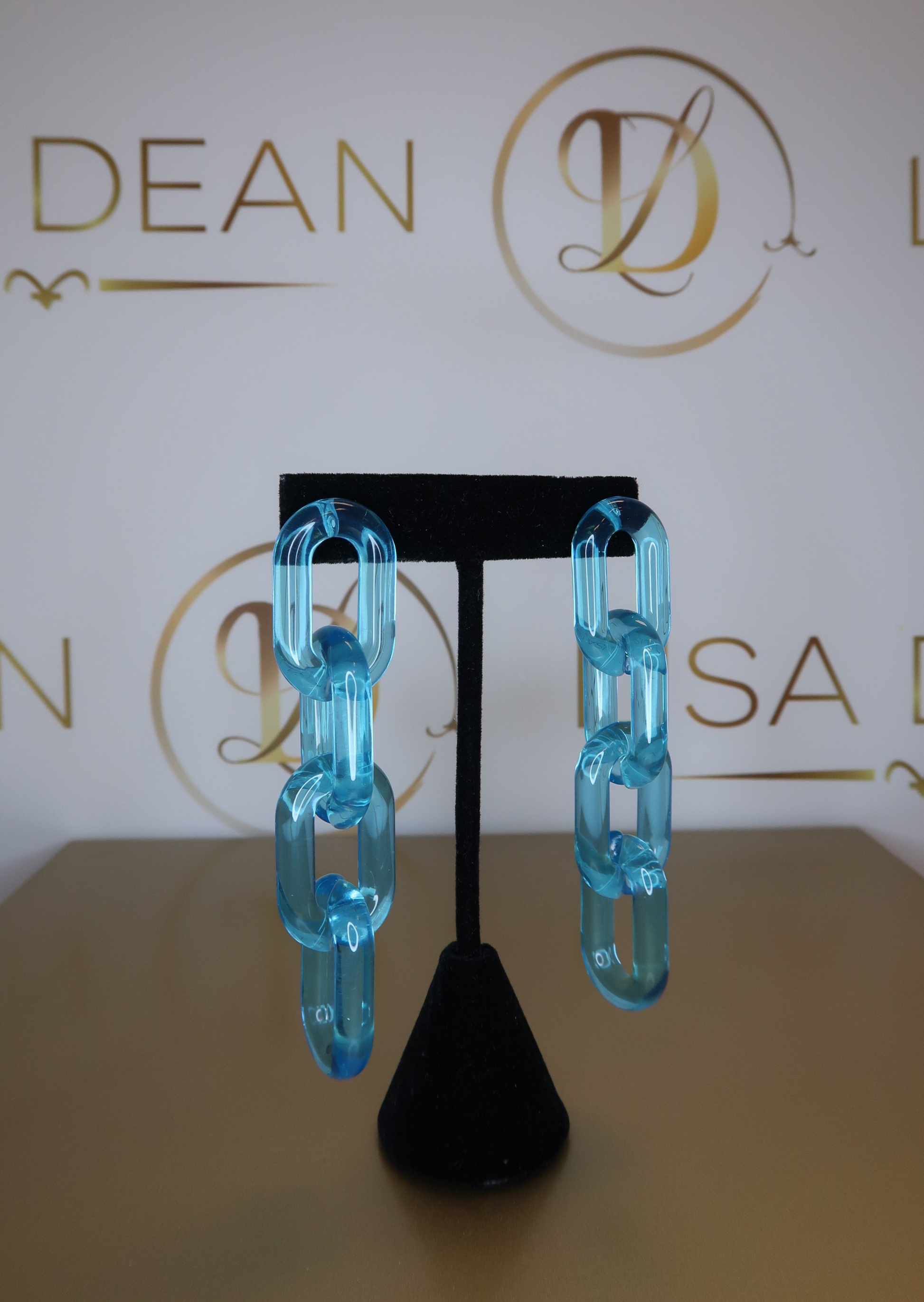 These drop chain link earrings have a blue transparent color. They have a post backing.