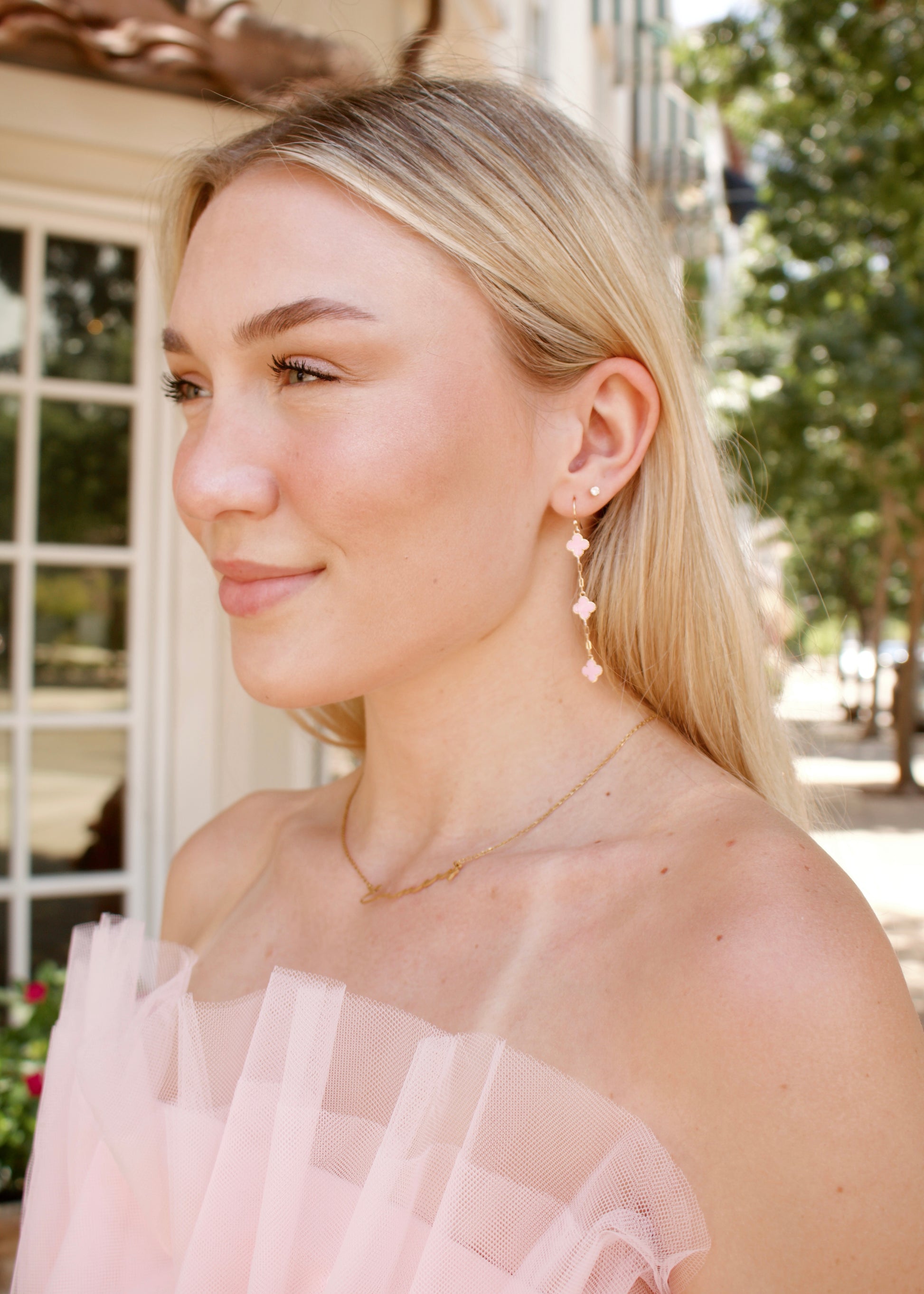 This mini is so feminine and airy but still makes a statement! This fully lined dress is complete with an invisible back zipper! Style this as is or add a pair of our pink clover earrings and maybe even a belt for some extra sparkle.