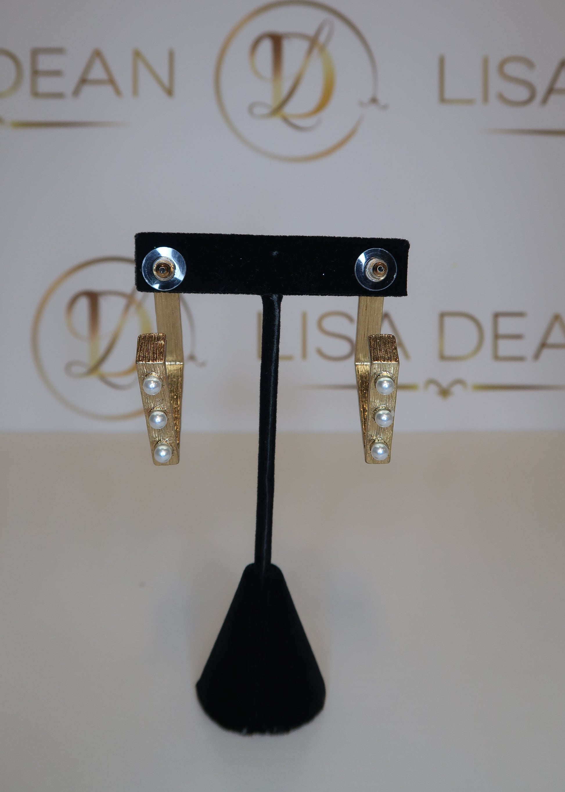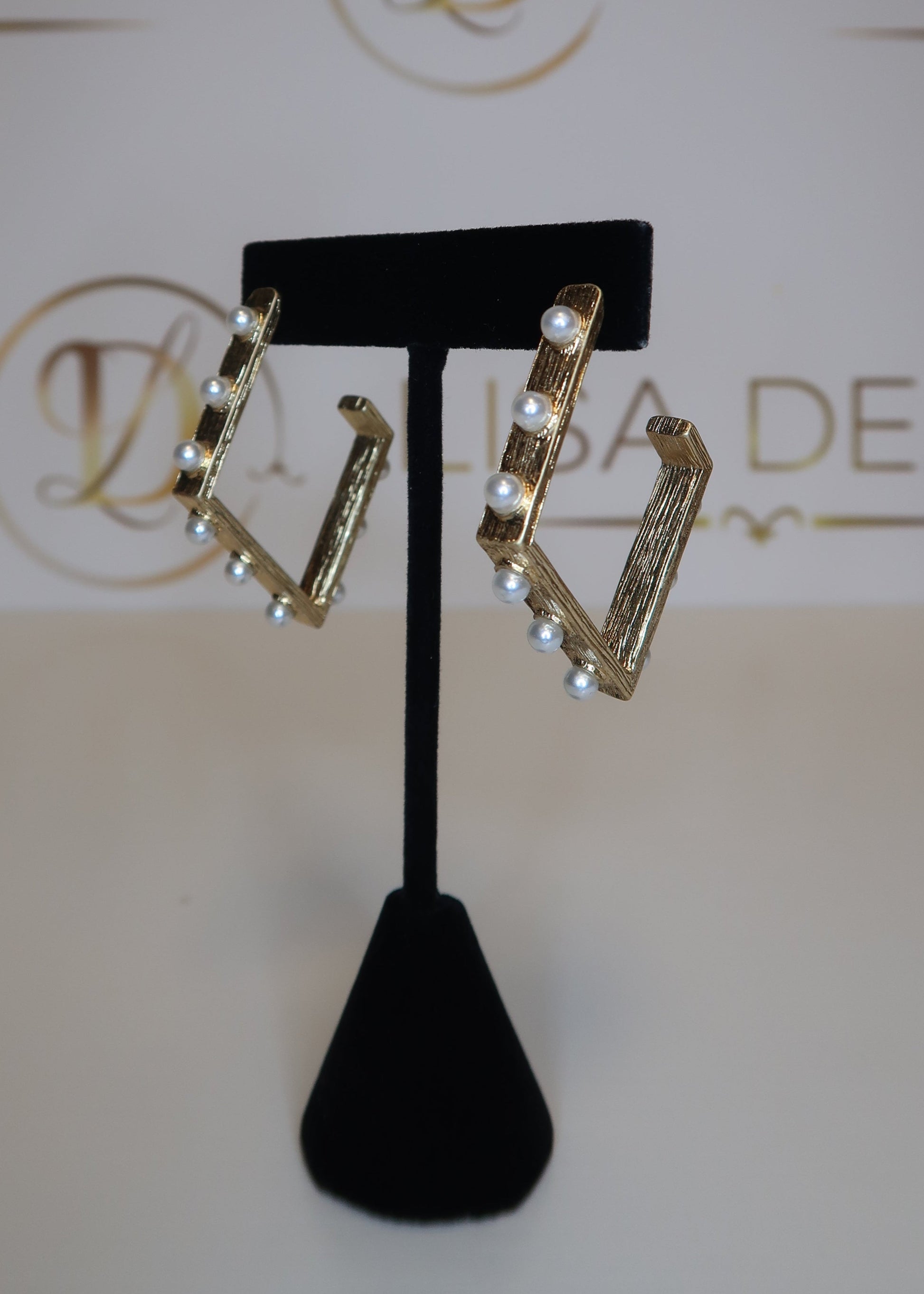 Add a touch of glam with these brushed gold diamond shaped hoops with pearl studs on a post back. Approx. 1 3/4" in length.