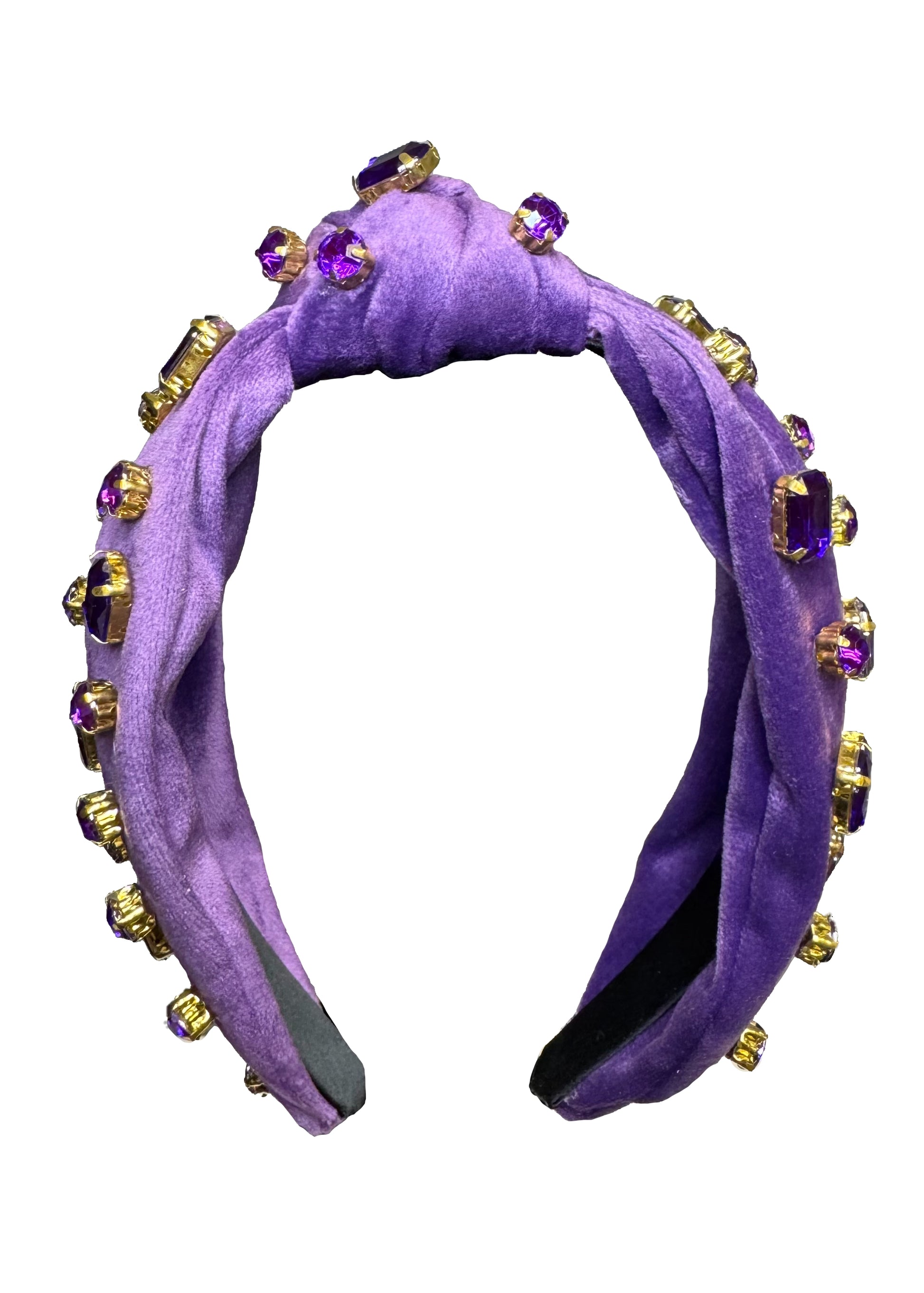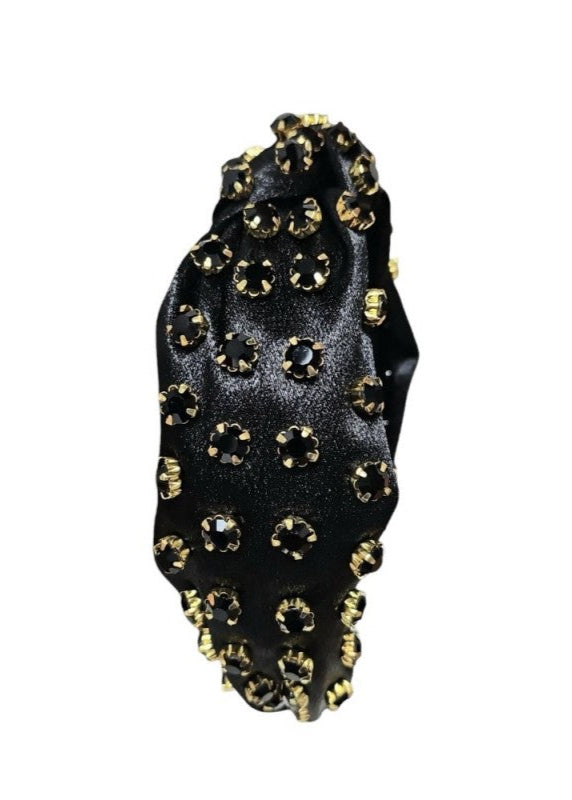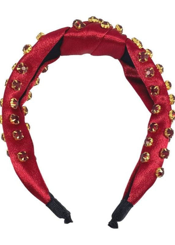 Burgundy Satin Knot Headband with matching burgundy rhinestone embellishments. (pictured in black for side view)