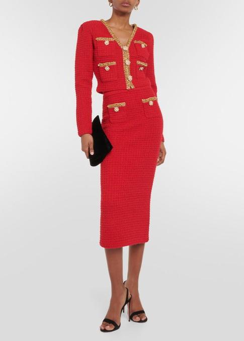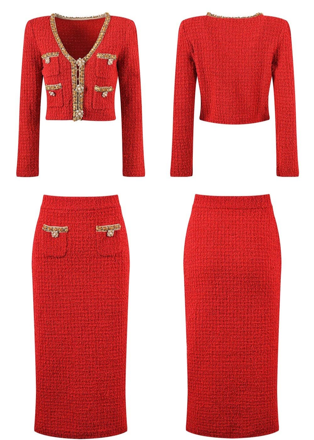 A Lisa Dean Exclusive || Elevate your wardrobe with the Cara Set, a lightweight luxury wool beaded cardigan top and midi skirt. Crafted from premium wool, this knitted suit is perfect for the cooler months. The top boasts an eye-catching beaded V-neck that adds a touch of elegance to the slim-fit design and an be styled closed as a top or open as a cardigan, while the skirt offers a comfortable mid-length cut, ensuring style without sacrificing warmth. Both pieces feature intricate detailing and are designed to offer versatility and sophistication to any wardrobe.