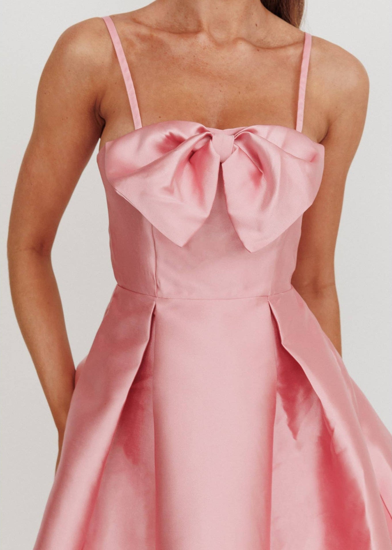 A gorgeous twist on a classic! The fit and flare silhouette of the Charlie Mini adds a flirty touch and is complimented by a sassy structured fabric with a metallic sheen and oversized bow.