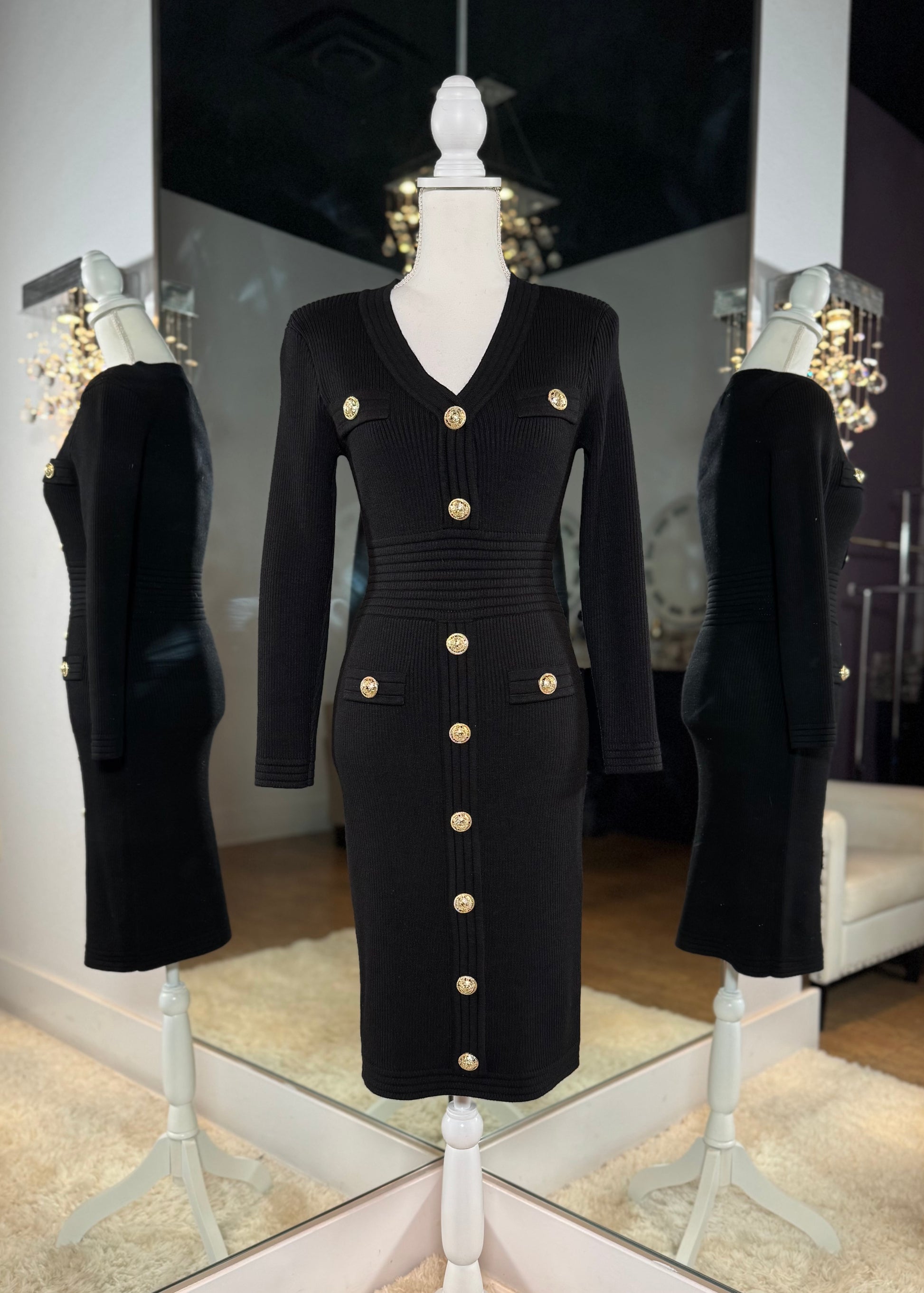 A Lisa Dean Exclusive || A classic chic look! This tailored knit dress screams quiet luxury and is a must have! Thick knit fabric hugs your in all the right places, shoulder pads give structure, and gold button details add a touch of glam!