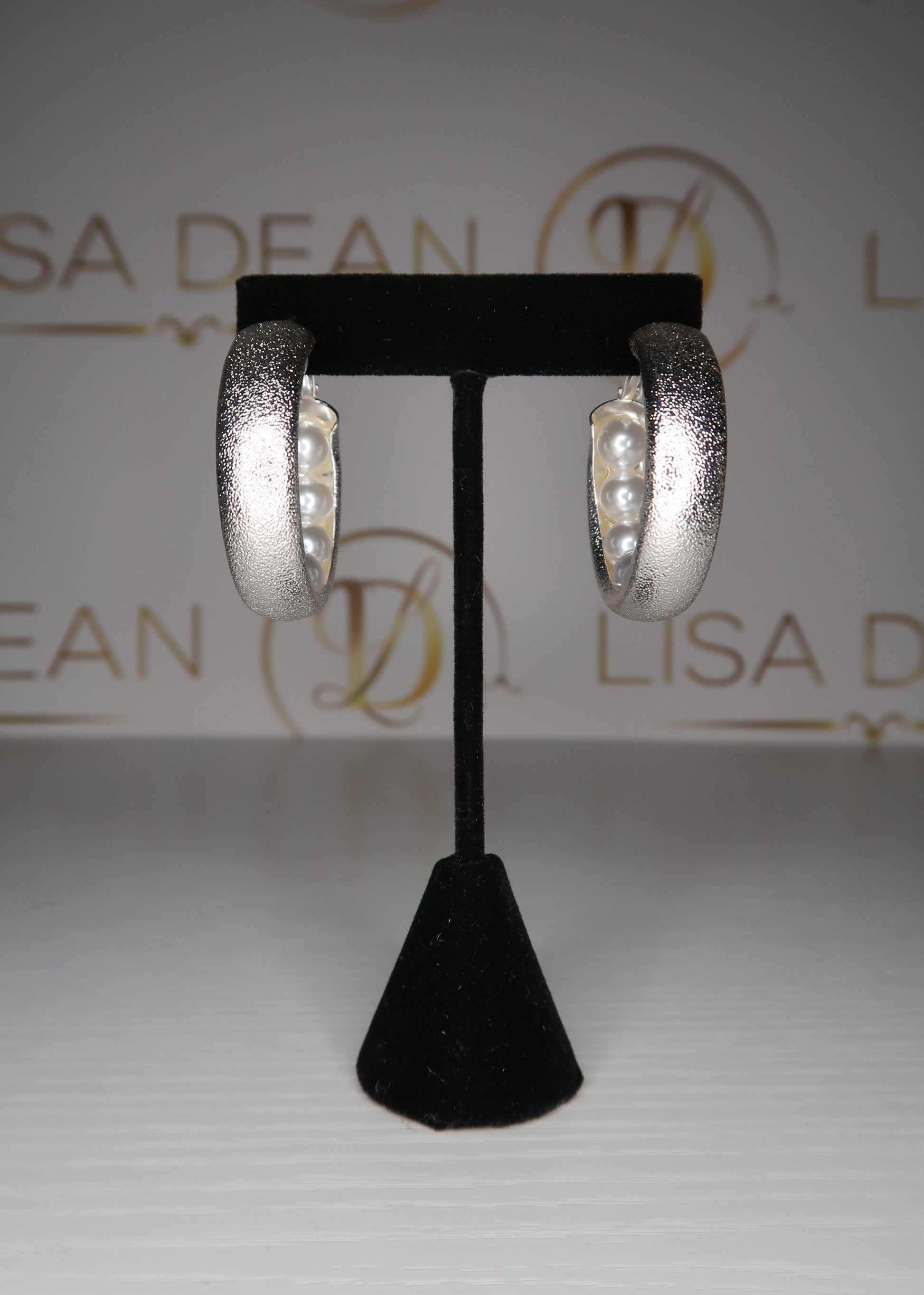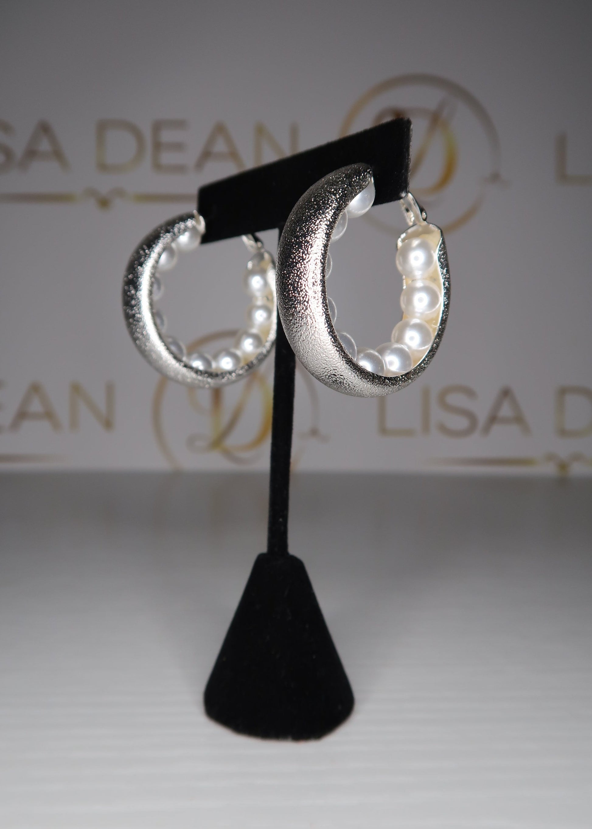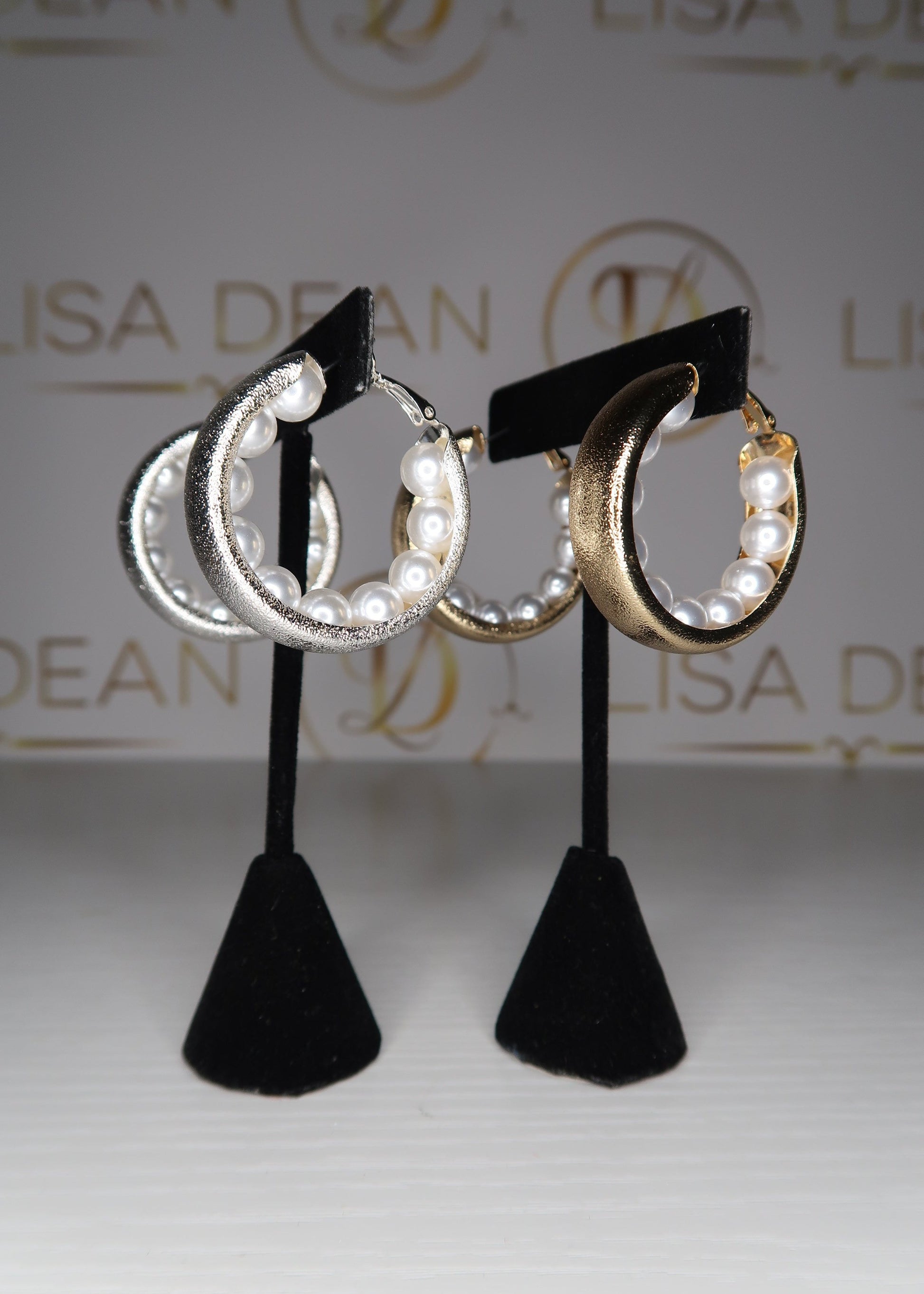 Available in Gold and Silver, these brushed metal hoops are lined with pearls and mounted with a clasp closure. Approx. 1.5" diameter.