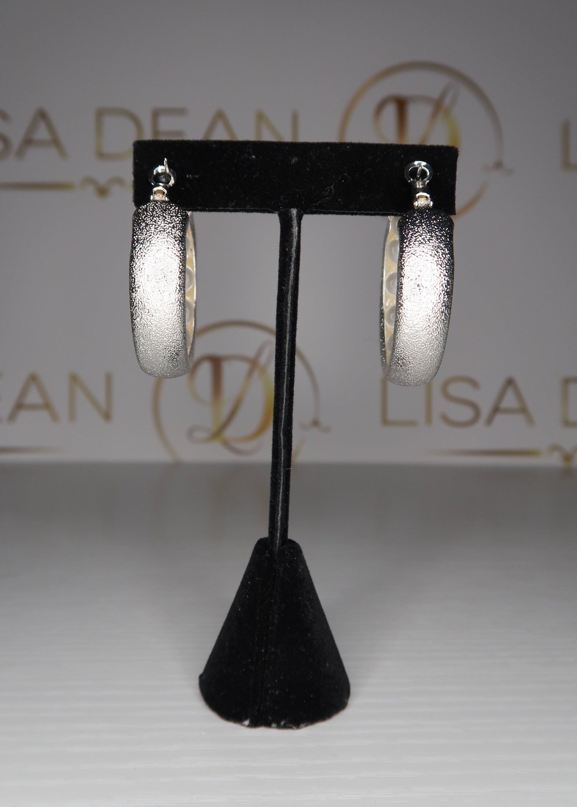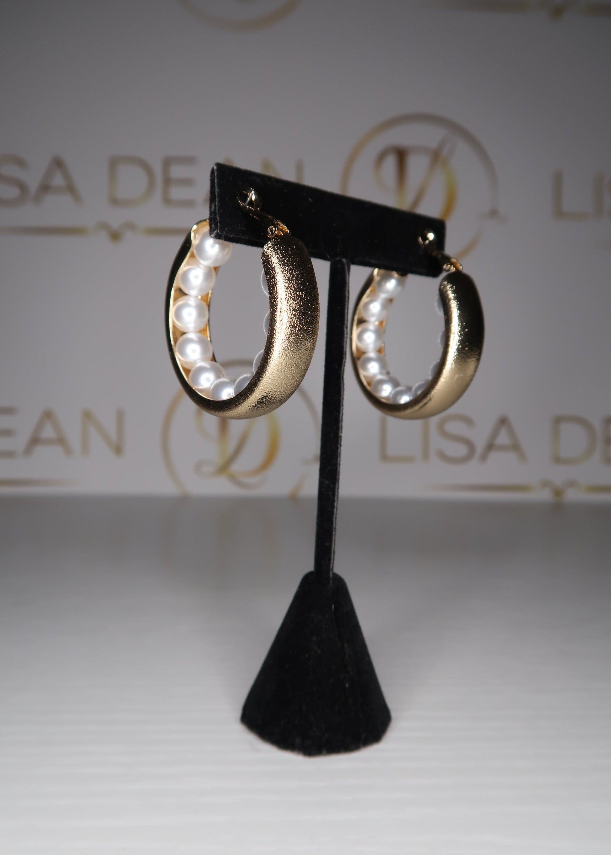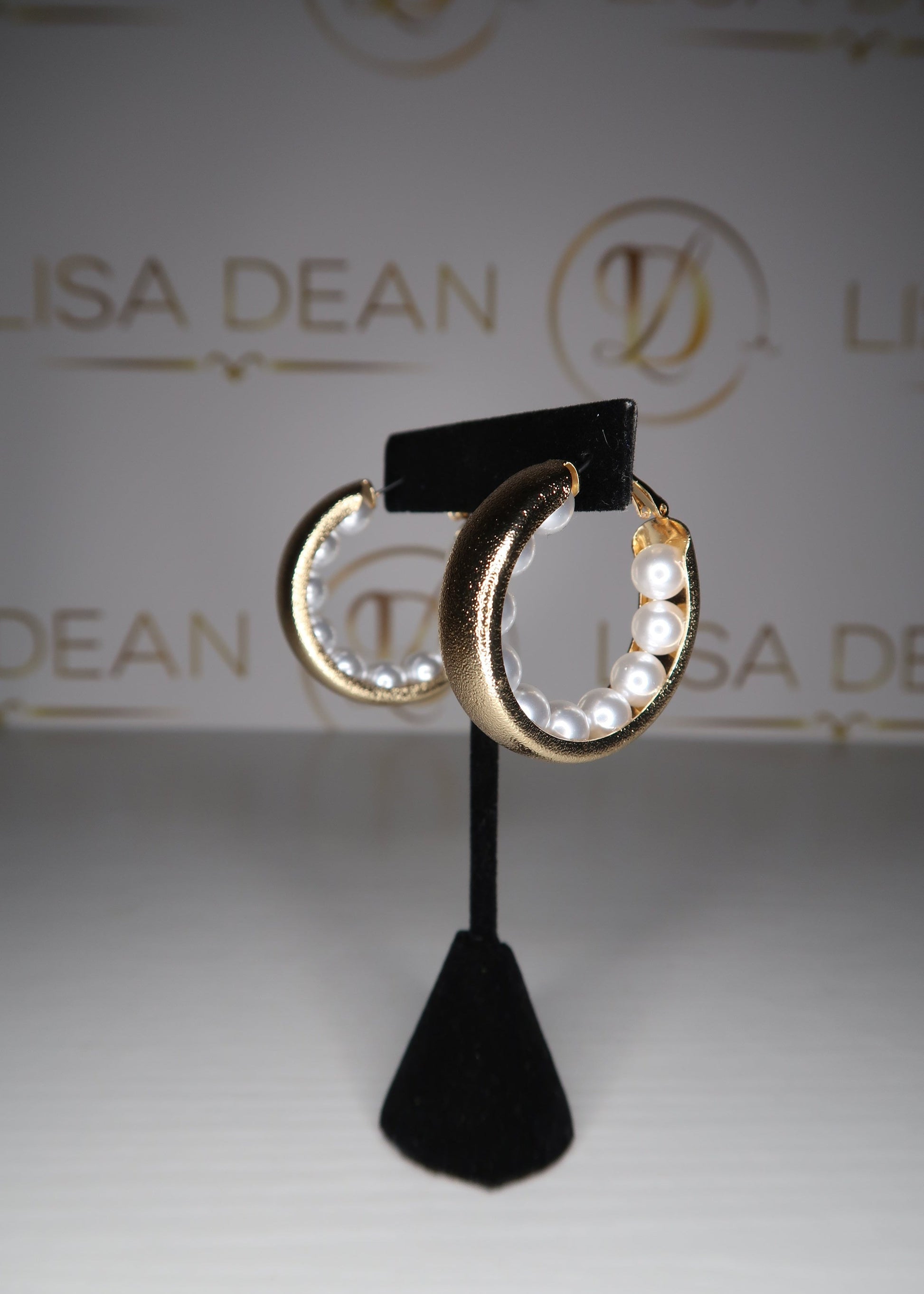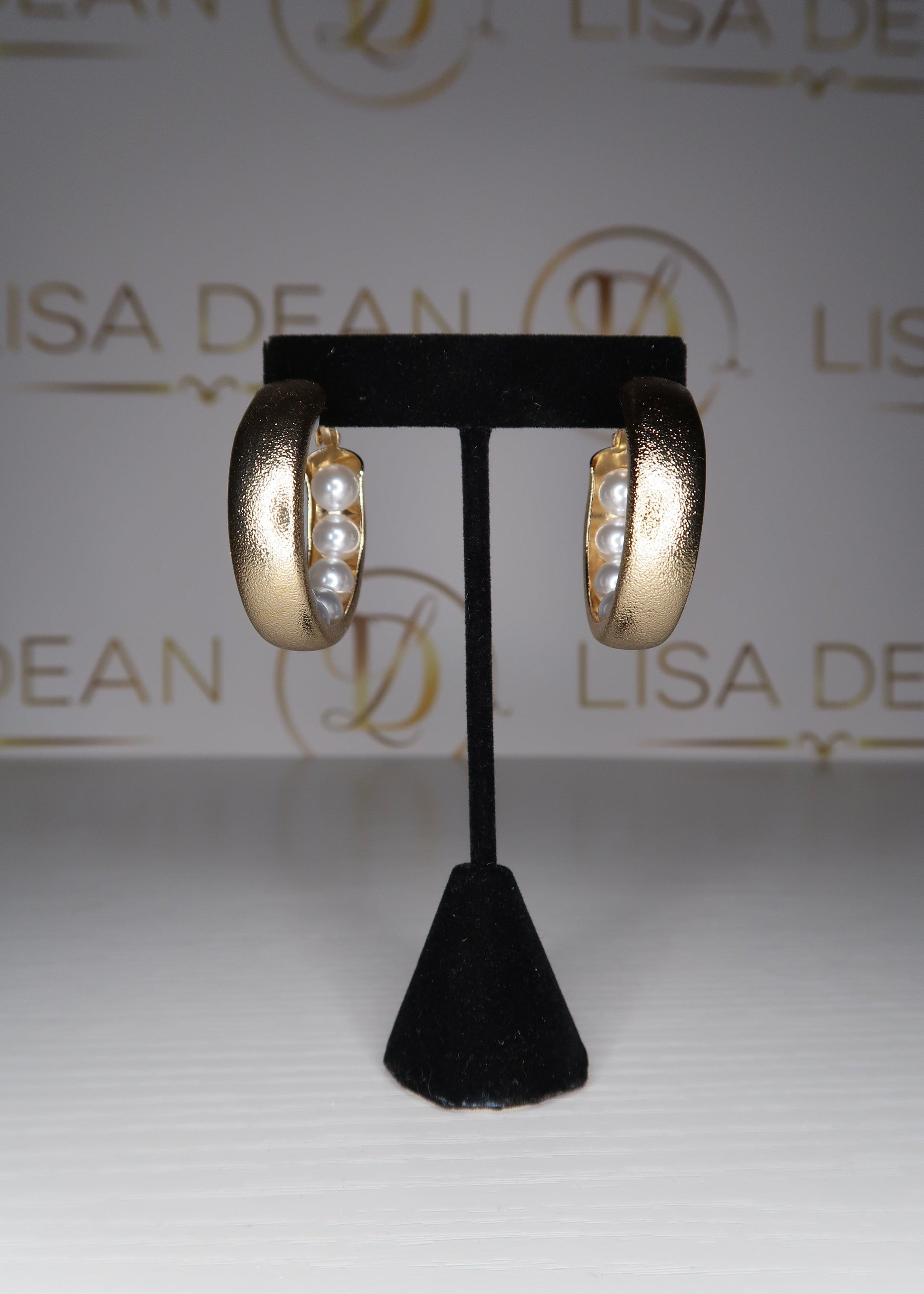 Available in Gold and Silver, these brushed metal hoops are lined with pearls and mounted with a clasp closure. Approx. 1.5" diameter.