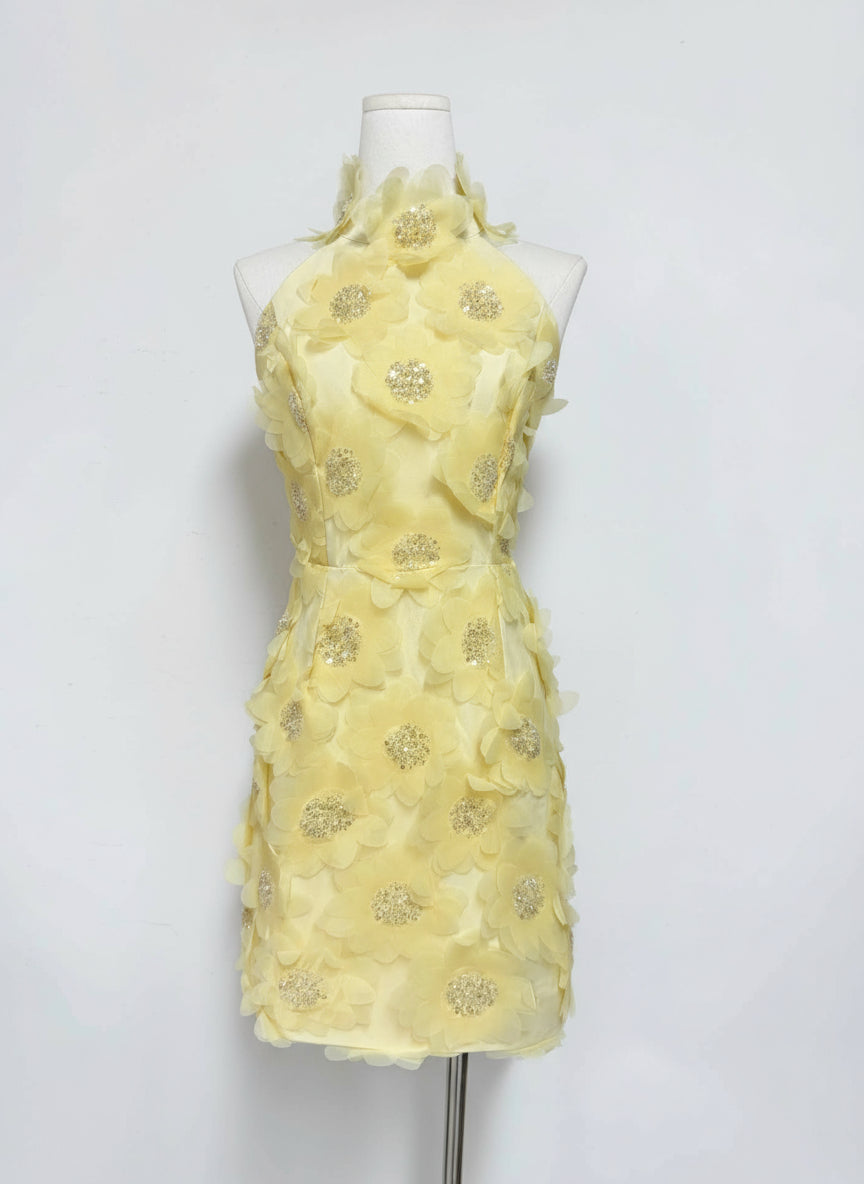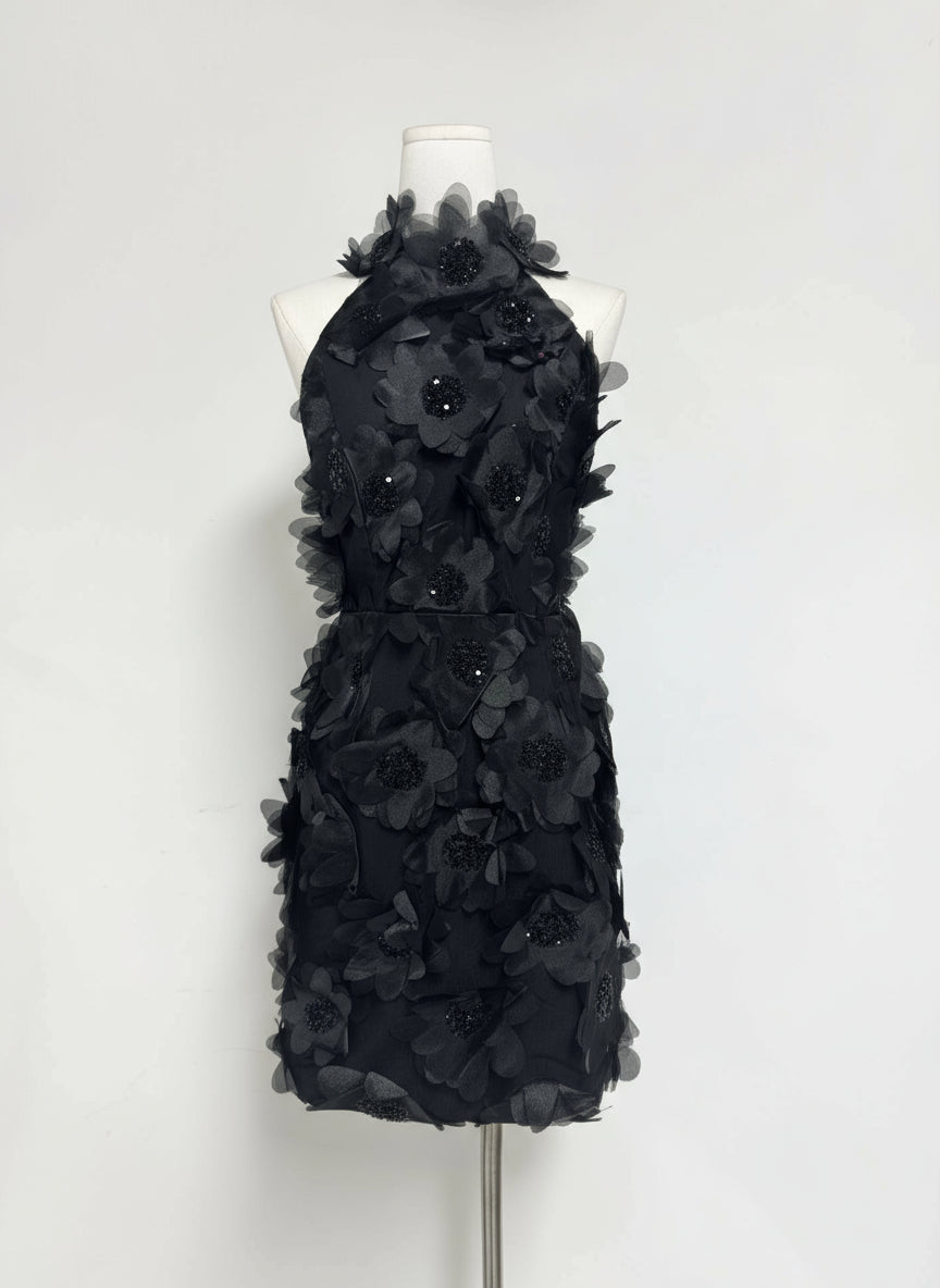 This halter neck mini dress, combines retro flair and classic elegance. Shimmering sequins and dimensional floral appliqués add texture. A backless cut lends a bold, flirty touch, balanced by the refined neckline and fitted silhouette.