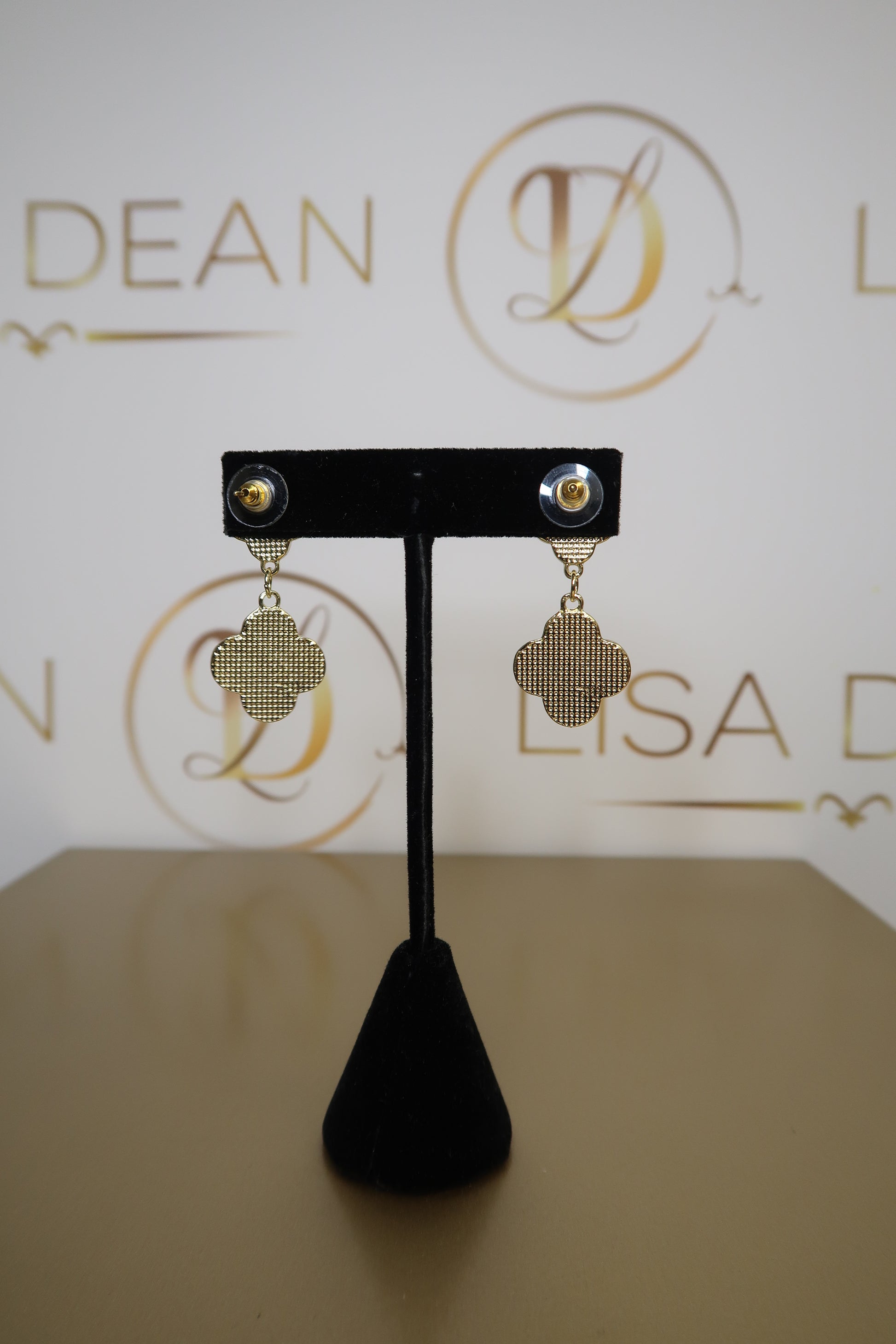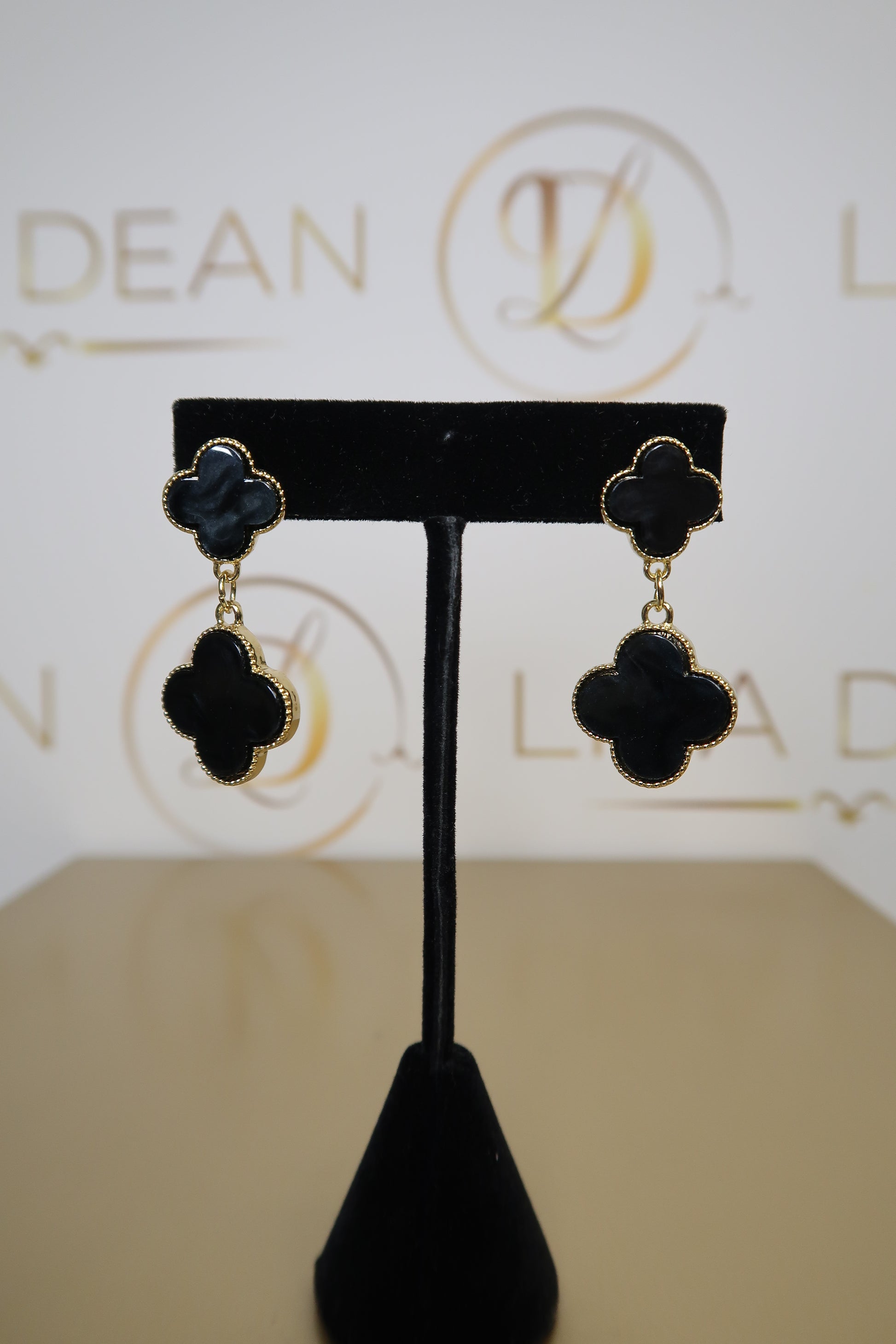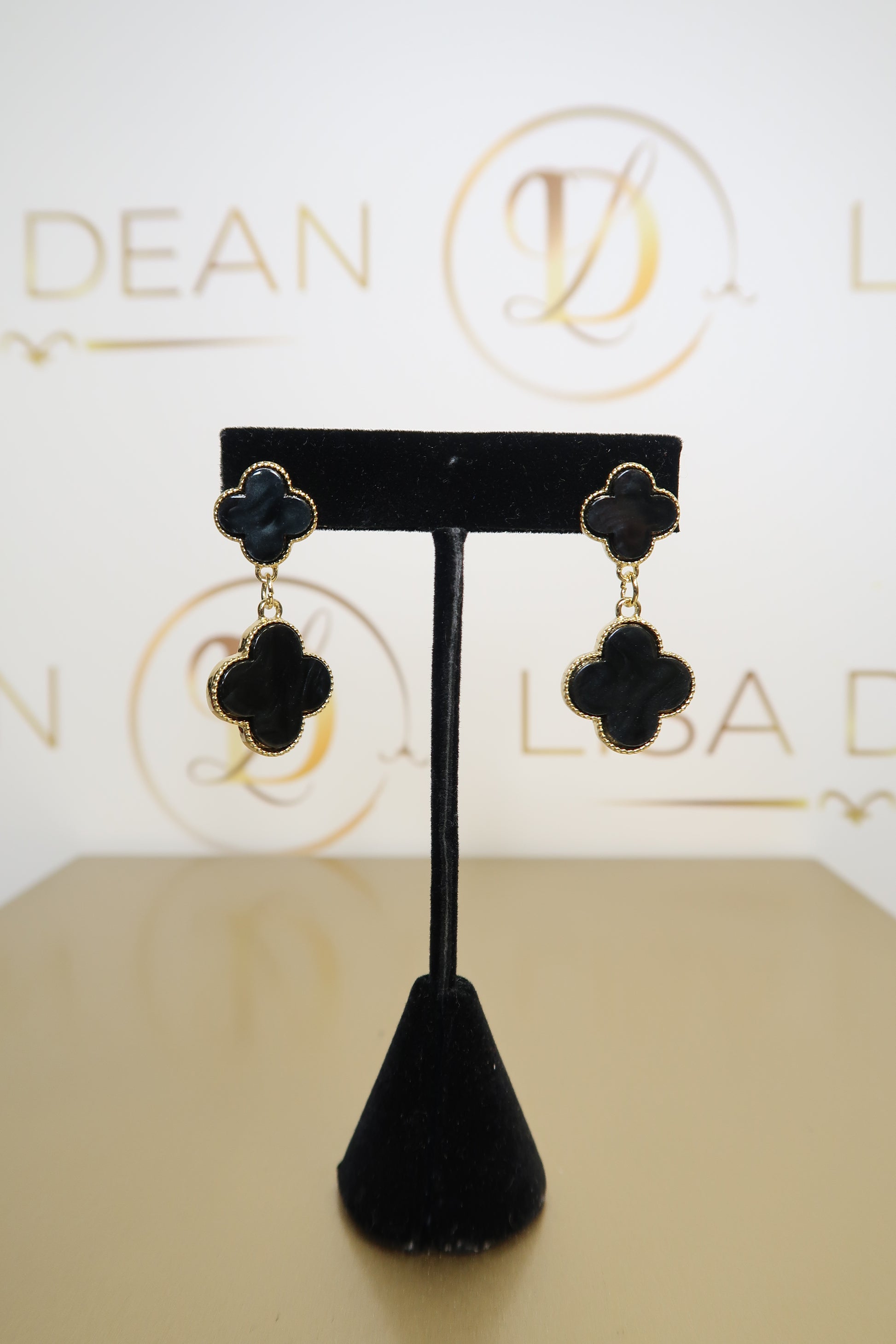 The Clover Drop Earrings are a Mother of Pearl inspired stud on a post back with a drop charm. Available In Black/Gold and Red/Gold.