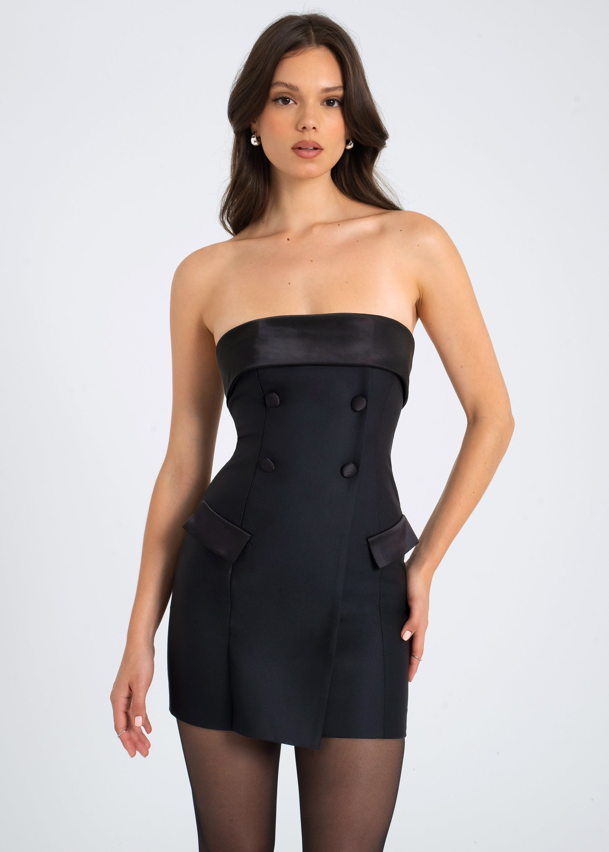 Inspired by a double breasted tuxedo jacket, the Della boasts built-in boning to provide a structured and flattering fit, while the faux pocket decorations add a touch of playful detail. An invisible zipper at the middle back ensures a seamless finish. Perfect for any occasion, this mini dress seamlessly combines timeless elegance with modern charm.