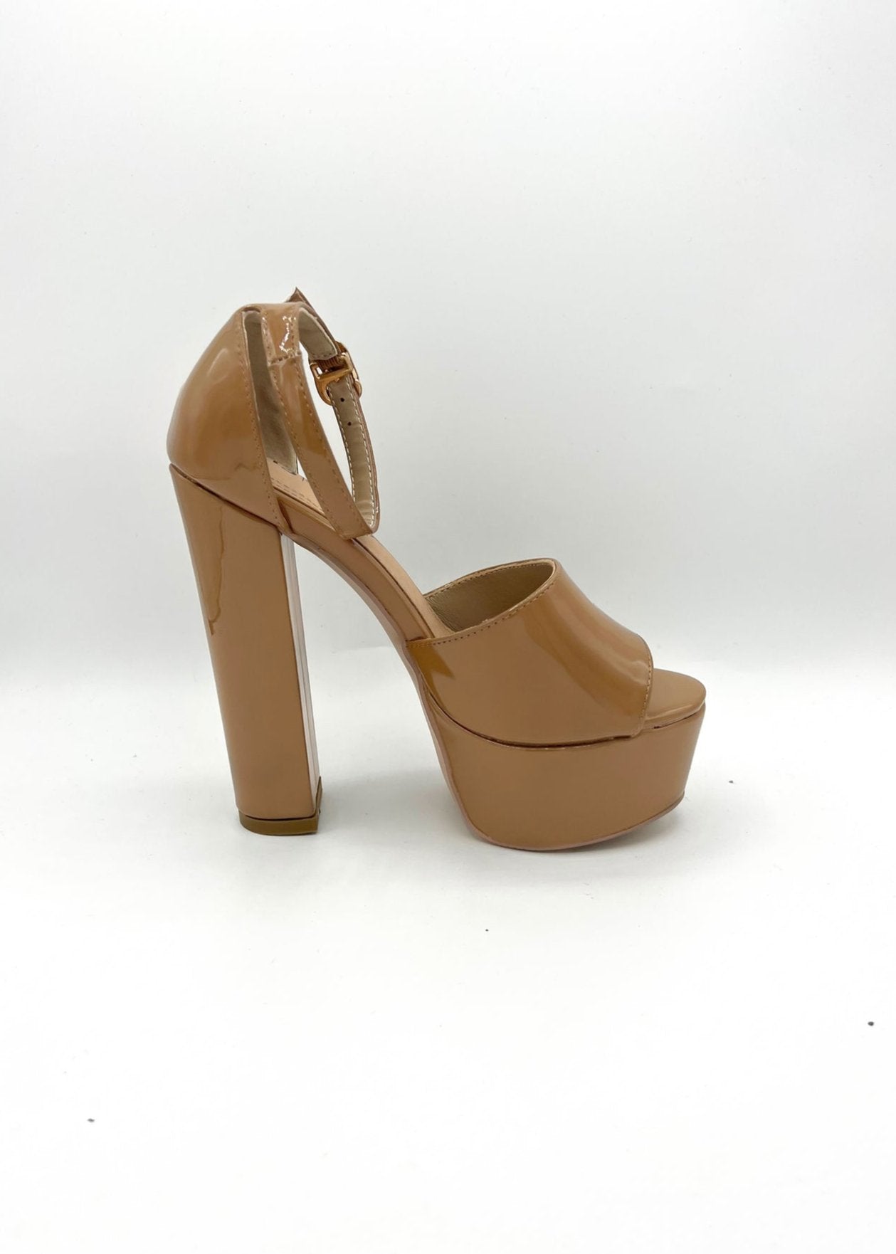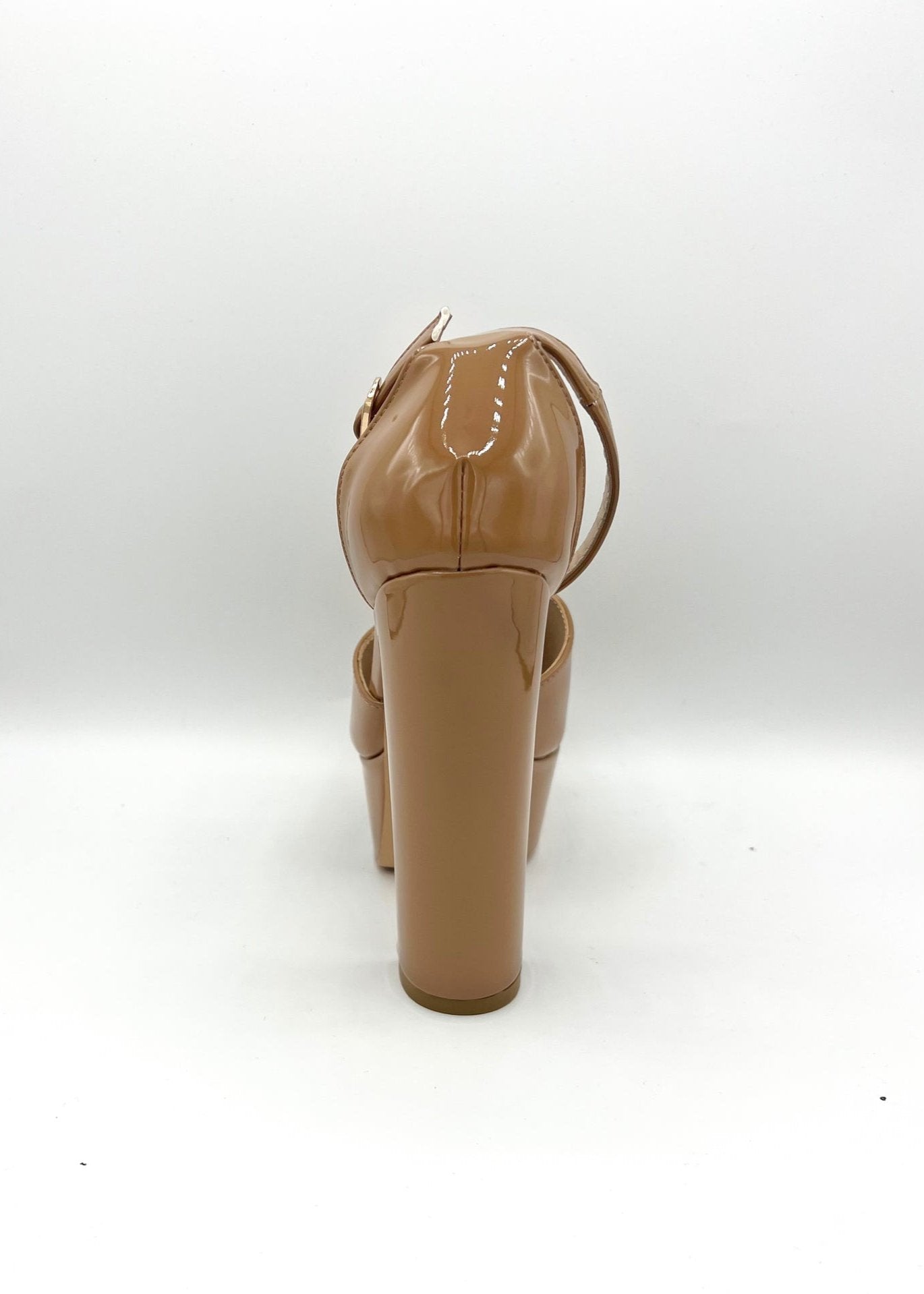 Patent Leather in medium nude (tan and olive skin tones), oatmeal. Wide heel with 1 1/2 inch platform, shoe is 6 1/2 inch in height, and cushioned to feel like walking on pillows. Runs true to size.