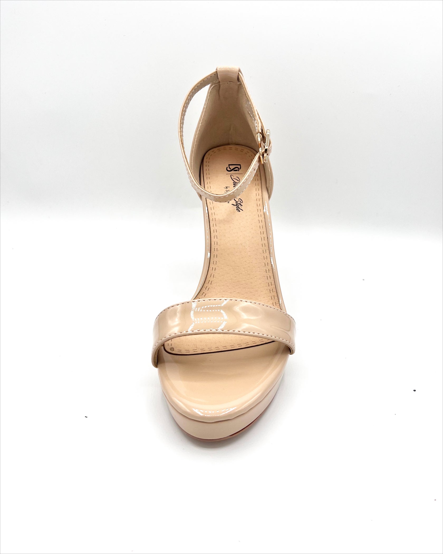 Light nude genuine patent leather - matches lighter skin tones, 4 1/2 inches in height with a wide heel, gold faux buckle on ankle strap - extra cushion for comfort to endure hours of standing- True to size