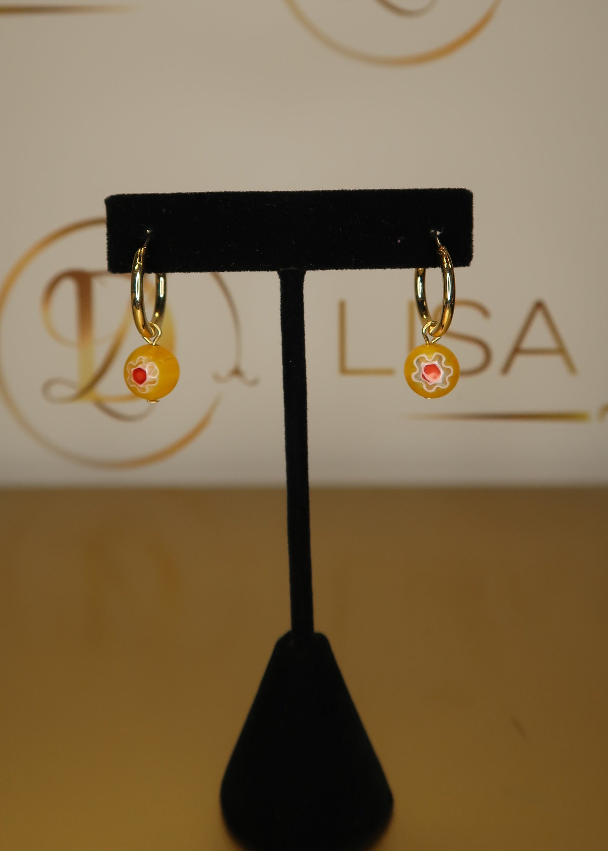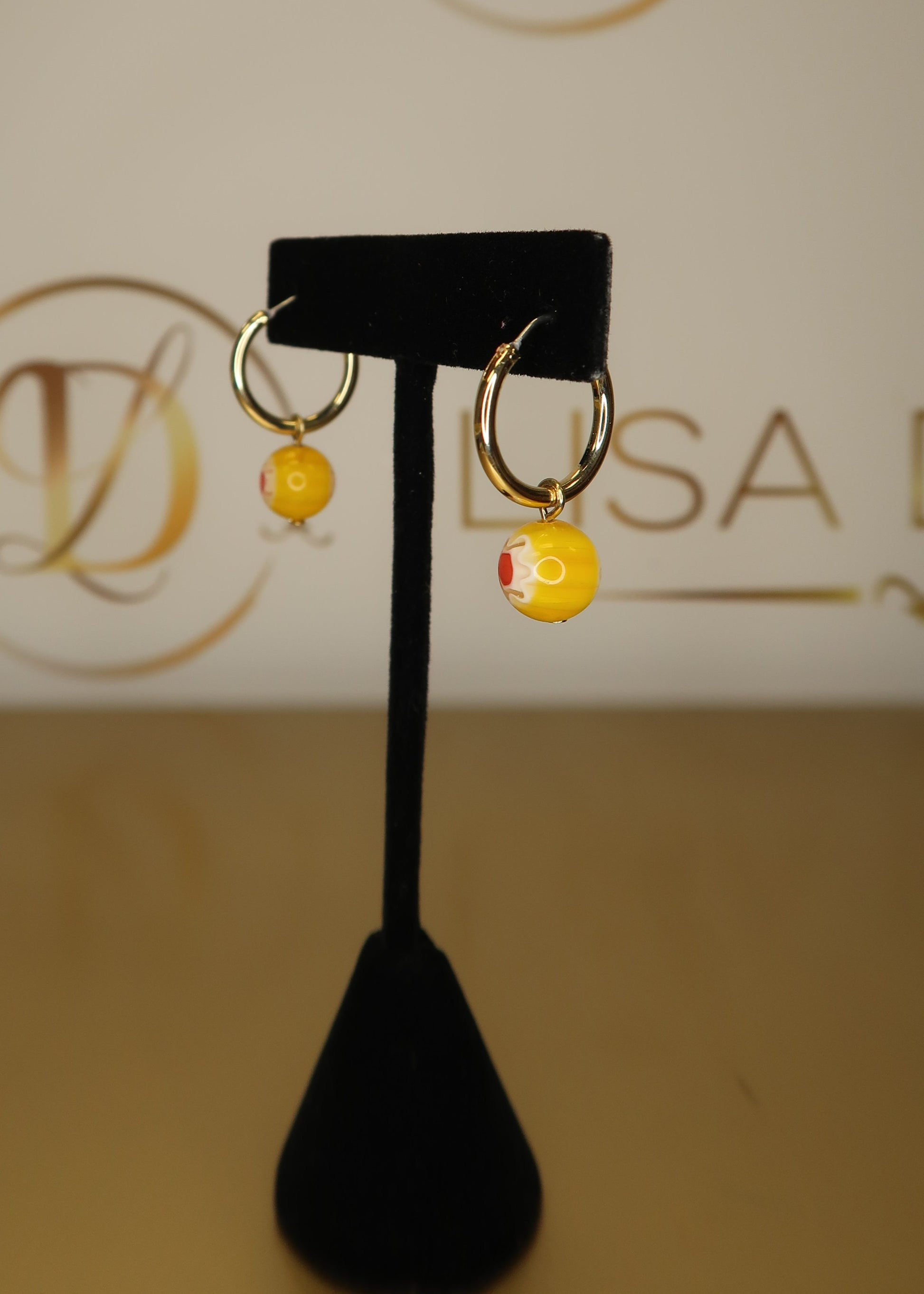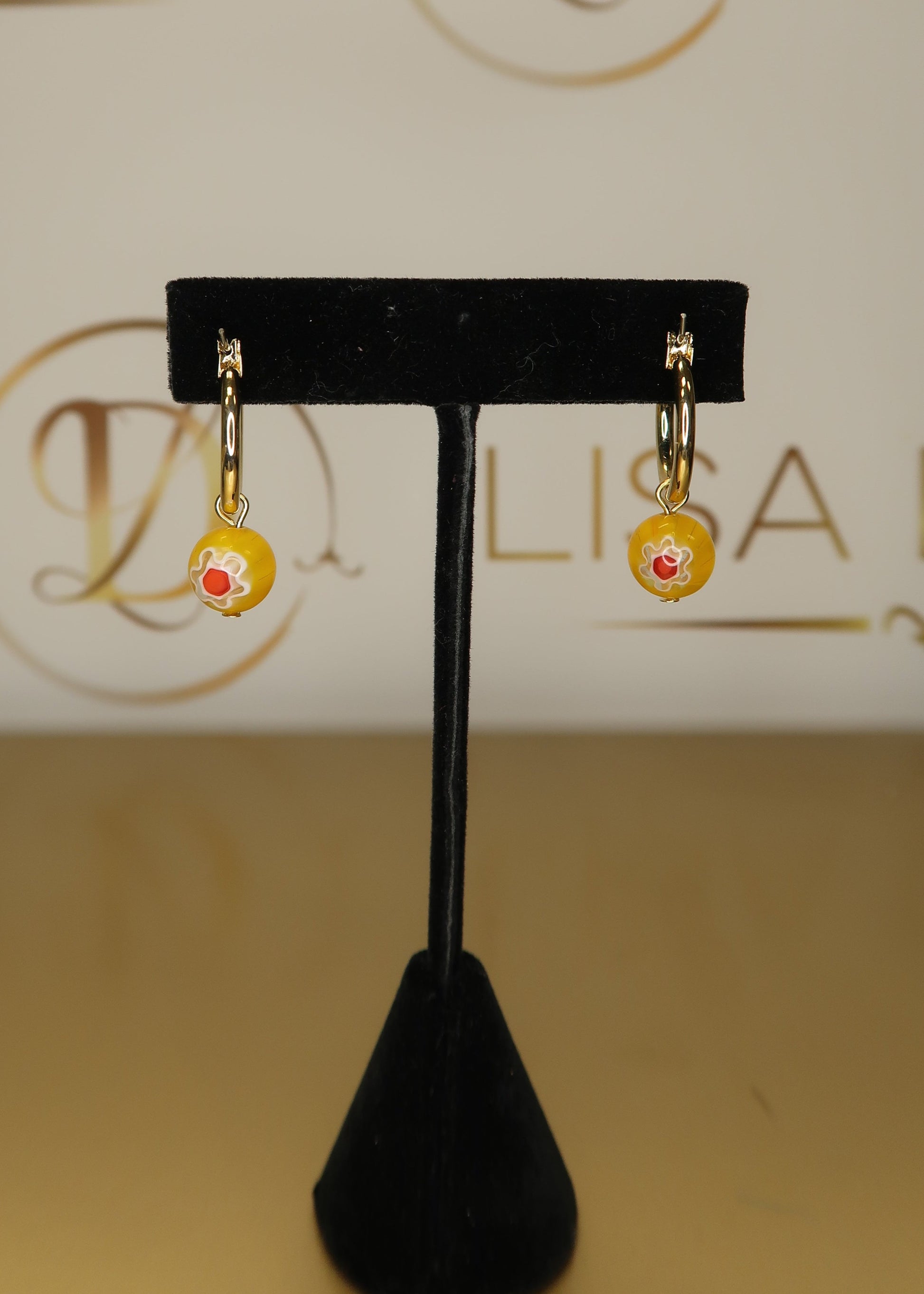 Dainty gold hoops with a latch closure featuring a yellow glass bead charm with floral motif. Can be worn with or without the bead charm. Approx. 1" in length with bead.