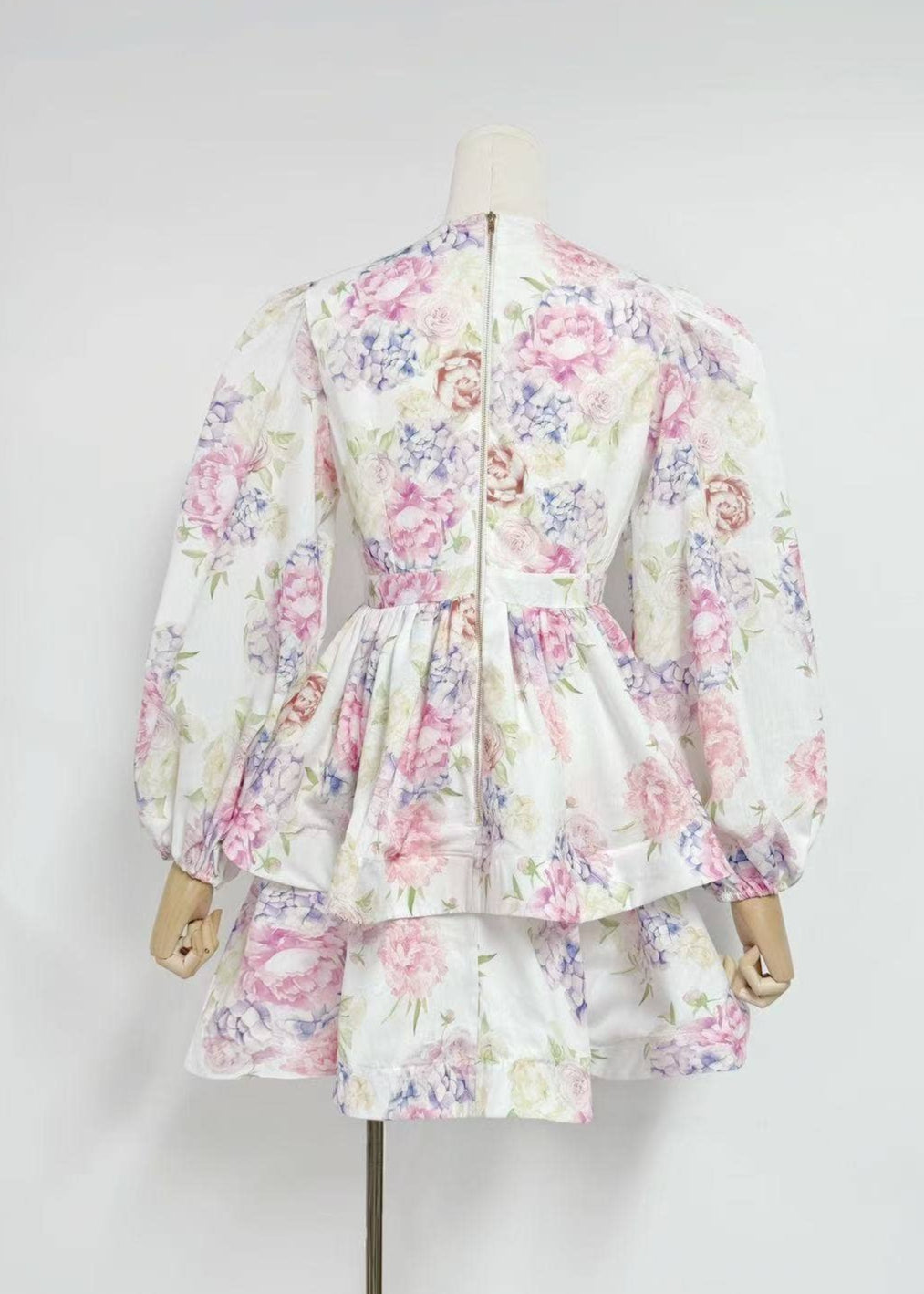 The Hydrangea Mini features elegant lantern sleeves, plunging v-neck, and a voluminous tiered skirt! Adorned with a pastel floral print it exudes feminine charm and sophistication. The horsehair hem adds a touch of whimsy, while the lightweight fabric ensures comfort and breathability. Pair it with heels for a formal event or sandals for a breezy summer outing.