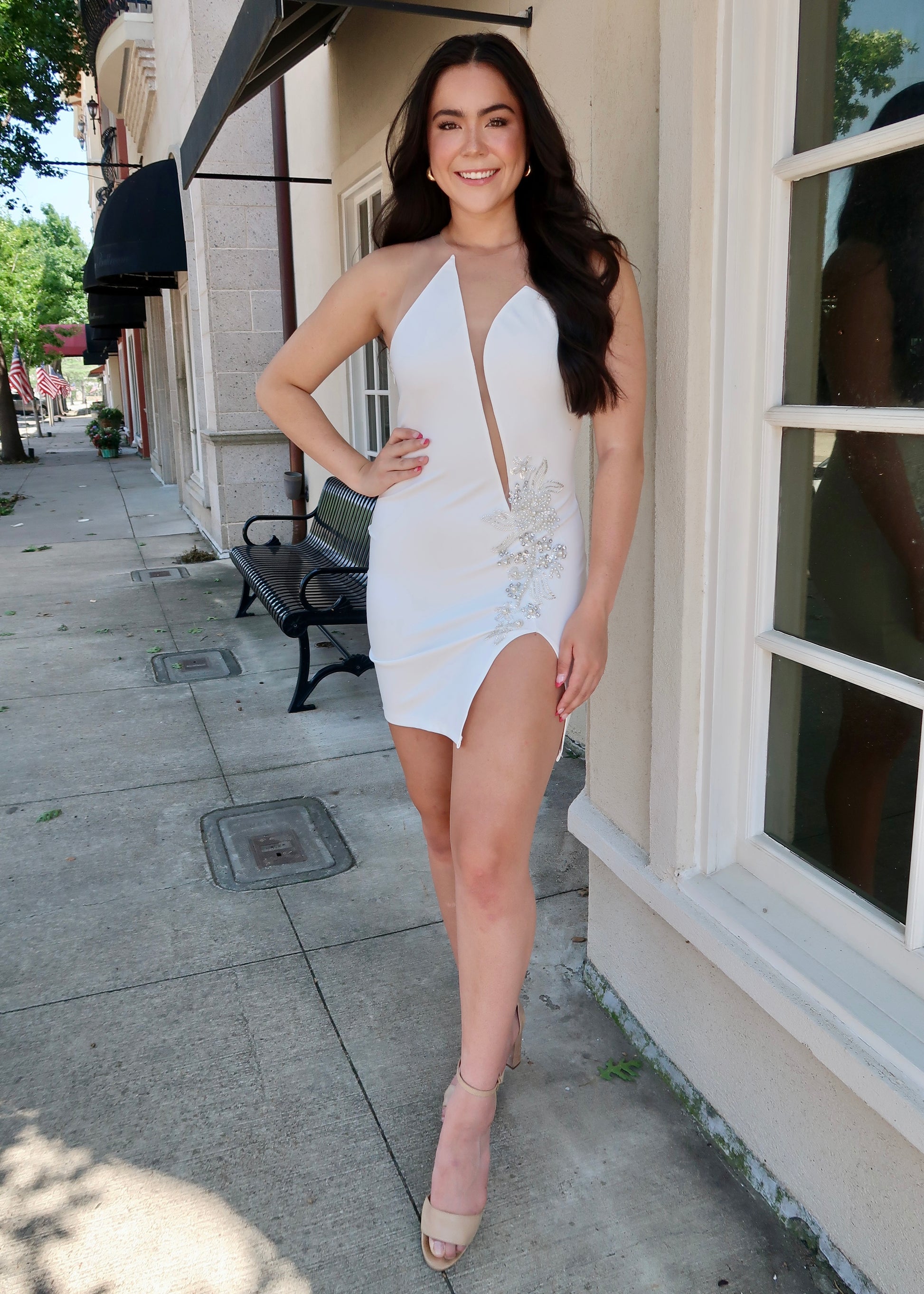 This classy and sophisticated dress is form fitting with front slit, beaded appliqué, and nude mesh!