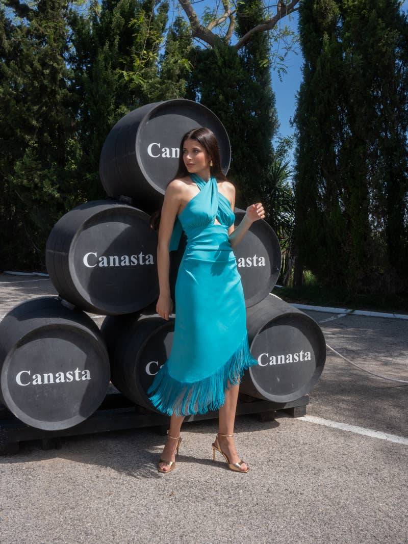 Wedding and event guest dress in satin fabric. Neckline tied around the neck with cut-out detail. Fringes in low tone. Invisible zipper on the back. It has an inner lining.