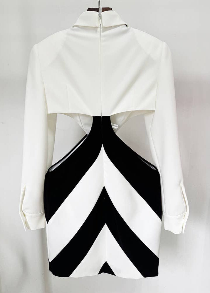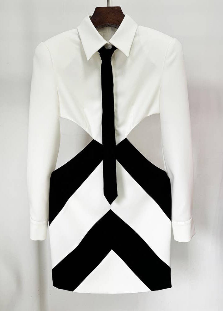 Unveil an aura of sophistication with this chic cut-out, long sleeve mini dress! This black and white piece boasts a striking contrast color design that accentuates the silhouette. The tie feature offers an adjustable fit while adding an element of elegance to the overall look. Side cut-outs provide a daring glimpse of skin, making it an ideal choice for those who dare to stand out. This dress pairs seamlessly with statement accessories for an ensemble that speaks volumes of your impeccable taste in fashion.