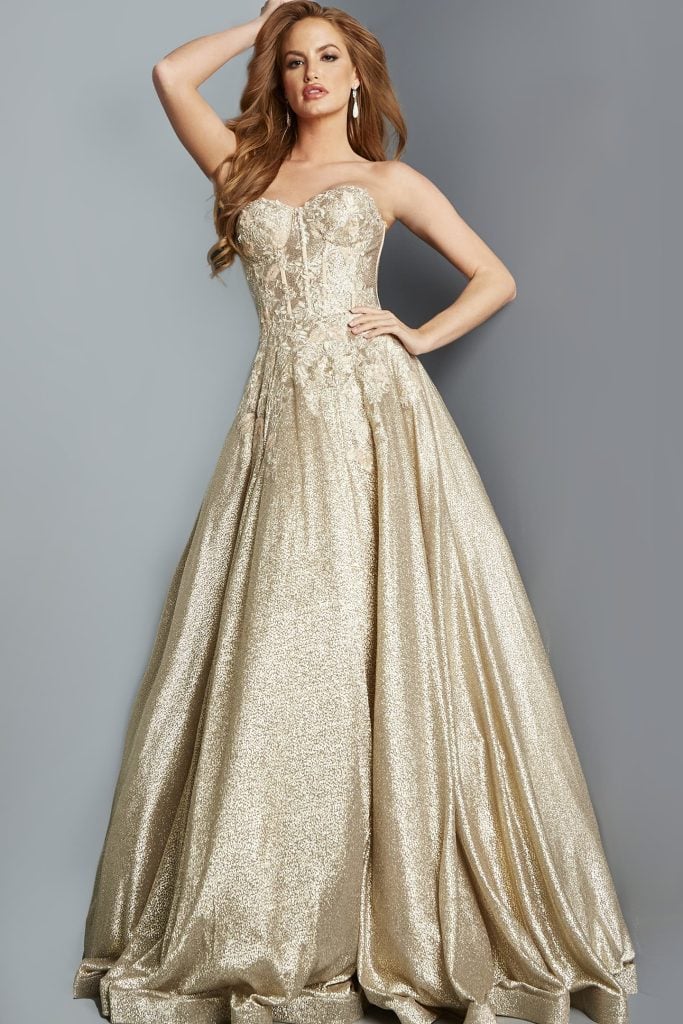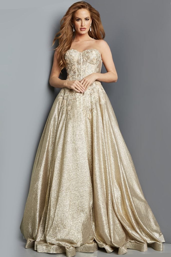 This magnificent ballgown features a captivating corset bodice adorned with exquisite gold lace, enhancing the natural beauty of the gown. The sweetheart neckline and sleeveless design add a touch of romantic charm. This floor-length ballgown crafted from shimmering lace fabric is perfect for any formal event. The beaded detailing and classic ballgown silhouette create a sense of timeless glamour, making it a choice to impress.