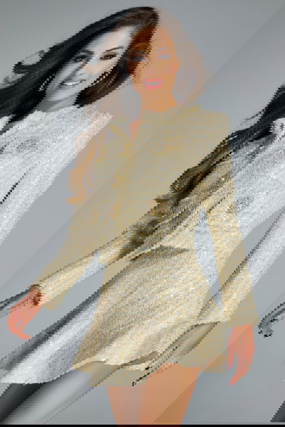 Jovani 40713. Skirt and Jacket sold together. Available in Champagne, Blush, and Ivory in sizes 00-24. This stunning mini dress is actually a set! Features a flattering A-line silhouette and elegant long sleeves and round neckline. Enhanced by intricate sequin embellishments that add a touch of glamour. The tweed fabric gives an upscale texture, while decorative floral buttons bring a charming detail to the ensemble. The short length is designed to accentuate the legs, making it an ideal choice for both day and evening wear.