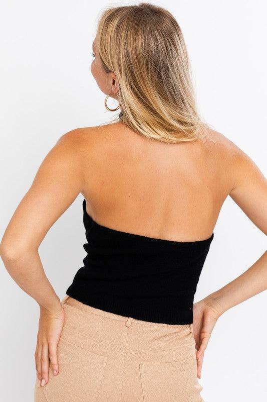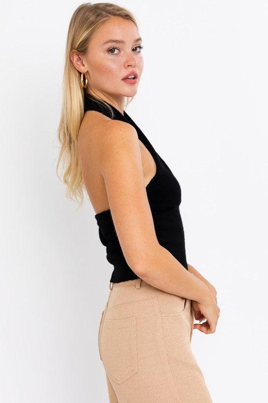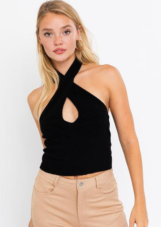 This halter tank has a center key-hole crossover design. It is knit sweater like fabric so it has some stretch to it. This top is the perfect basic!