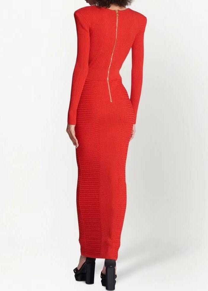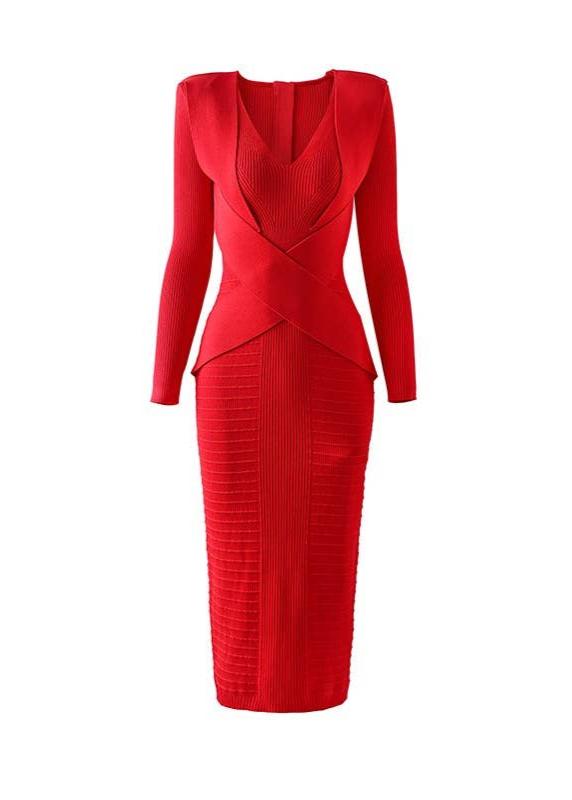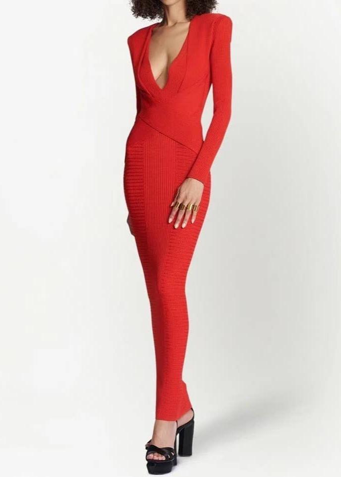A Lisa Dean Exclusive || The Kristin Bandage Maxi Dress has a slim fit design that accentuates the figure, with subtle shoulder pads and deep V-neckline. The long sleeves provide warmth and style, while the knit bandage fabric ensures comfort and support. Pair it with high heels for a chic and sophisticated look. The vibrant red color is sure to make a statement and turn heads wherever you go.