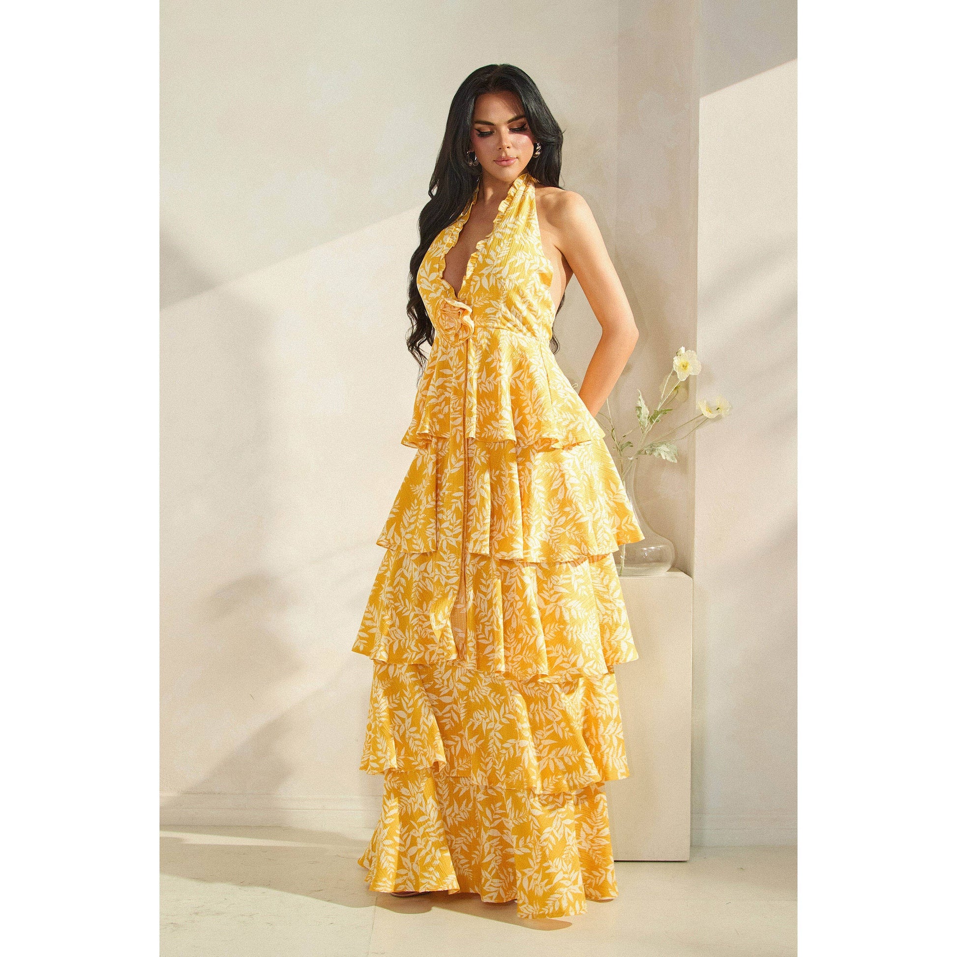 Combine feminine allure with your flirty & fun side with the Lillian Halter Maxi! This tie neck halter forms into a v-neck with subtle ruffles on the bust line. The baby blue and cream ivy print accents the tiered skirt and rosette detail. Open back with hook-and-eye invisible zipper.