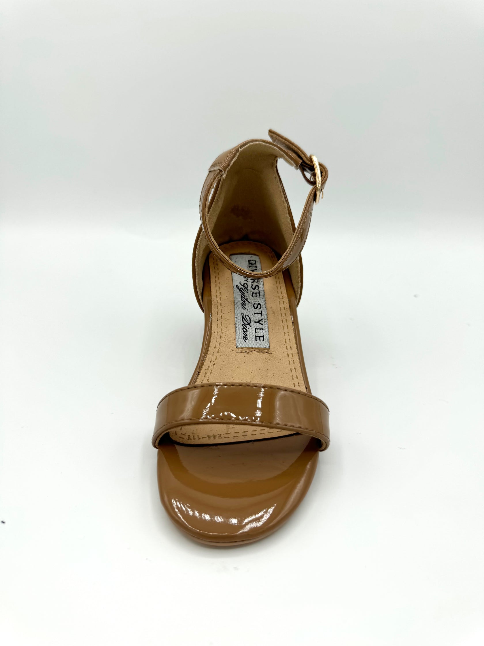 Genuine patent leather, matches medium skin tones, 2.25" block heel, extra cushion for comfort. True to size.