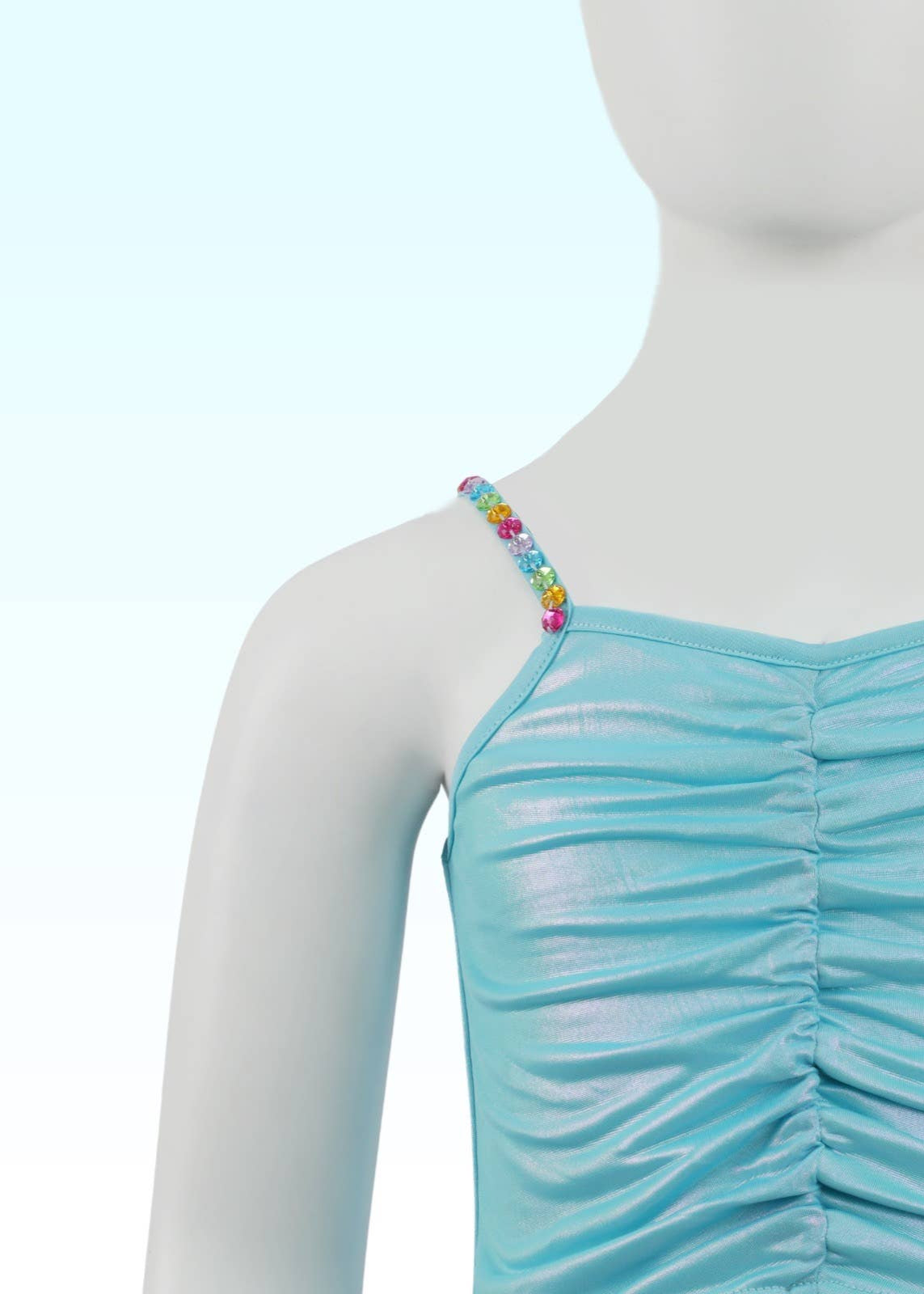 This fun skirt set ignites our Little Mermaid dreams! The straps are adorned with gems sewn into them to give an extra playful eye catching look. Two tiered skirt creates a fun ruffle hem and has a paper bag style elastic waistband and the paired spaghetti strap tank has a center ruche detail.