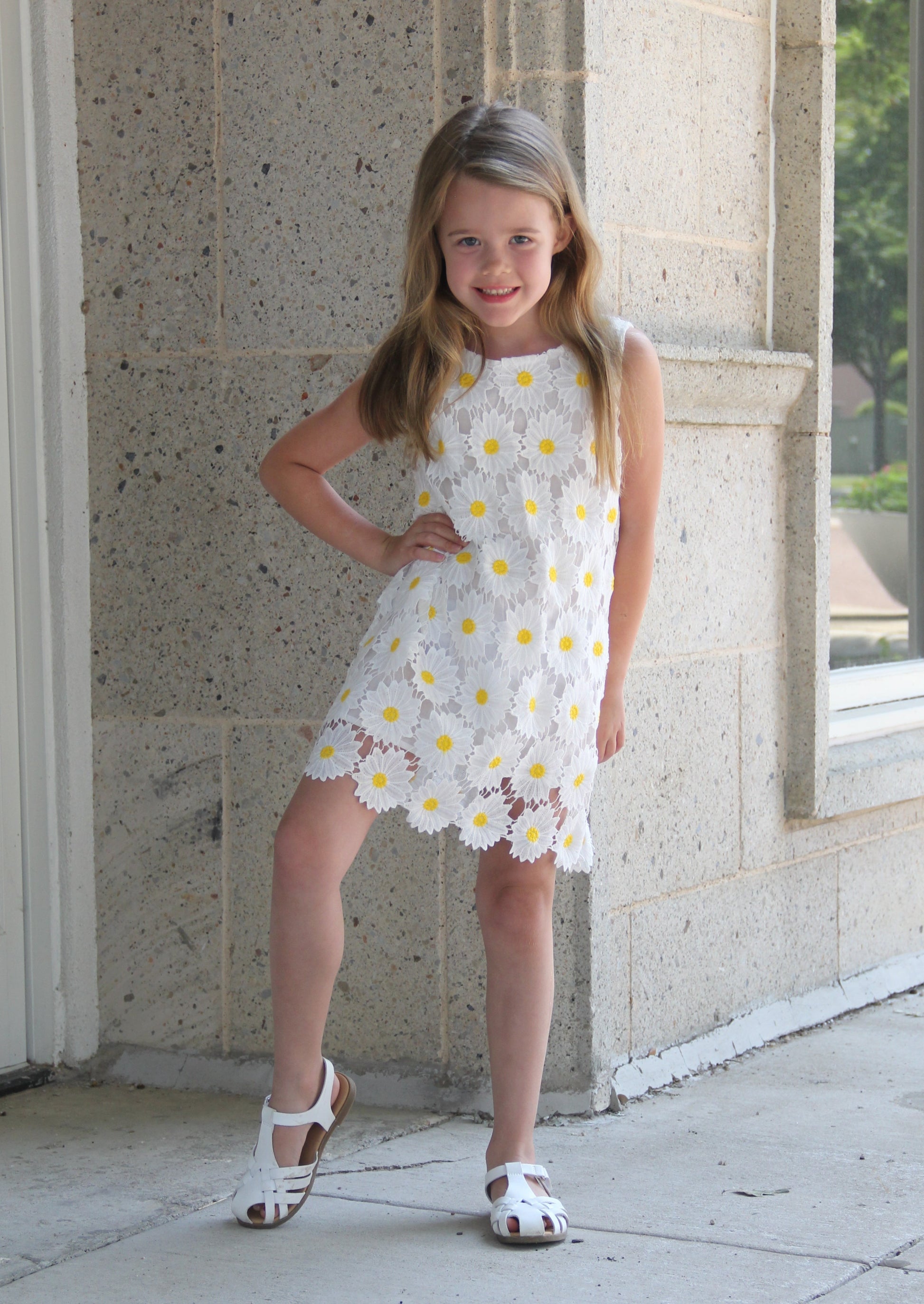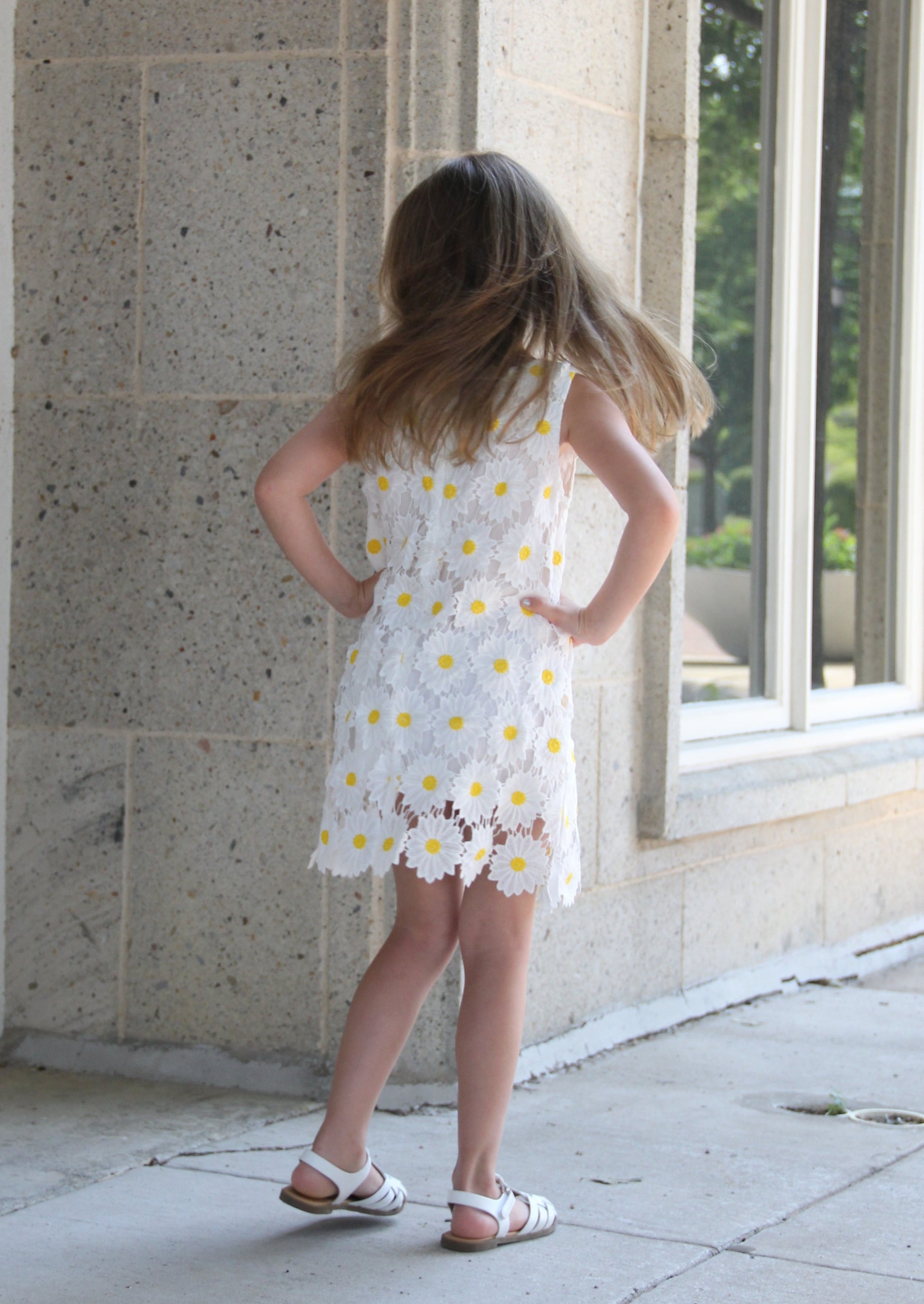 The Daisy Shift Dress is the perfect summer dress! A lace daisy motif is layered over a cotton/poly blend lining. Invisible zipper closure at back.