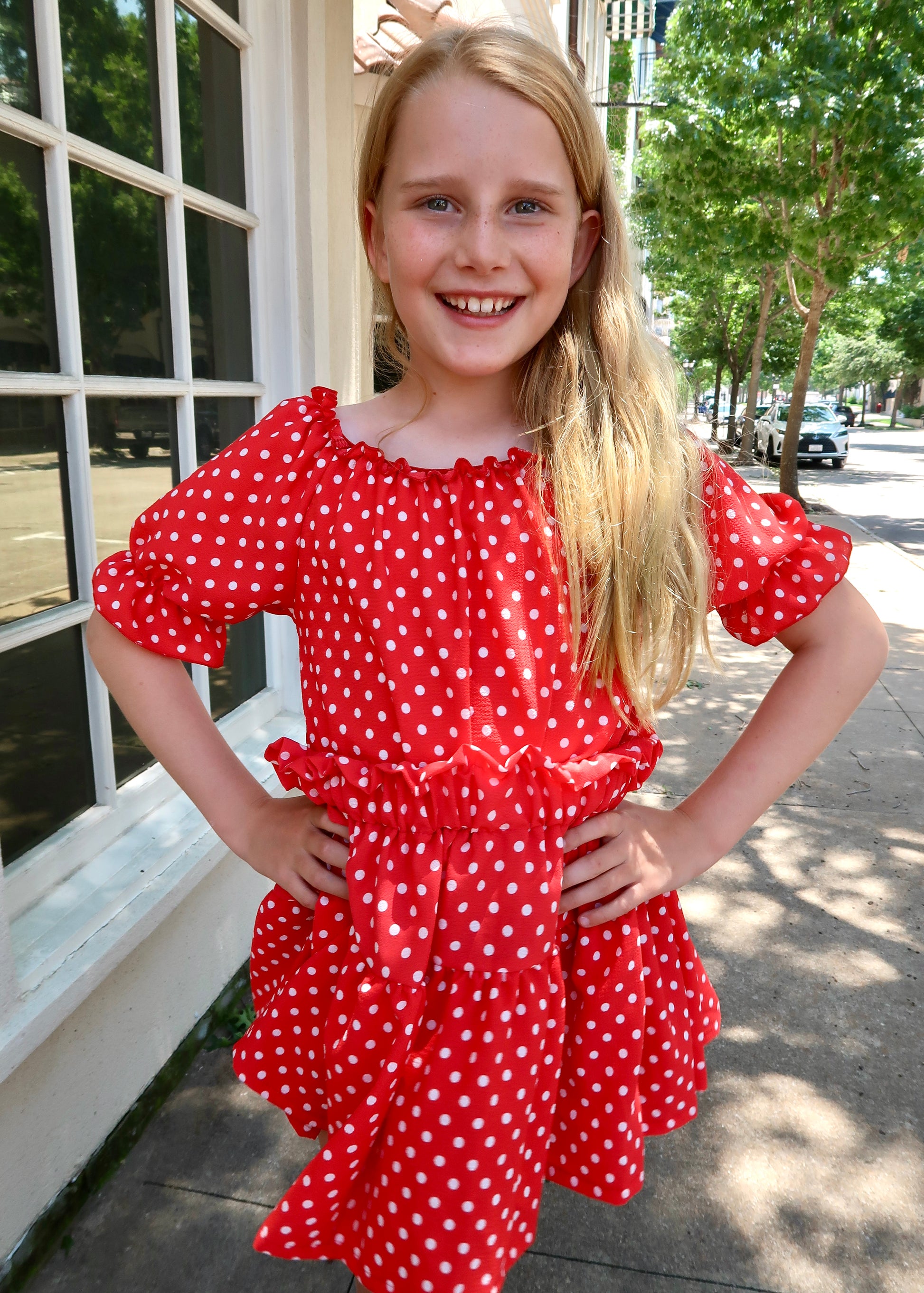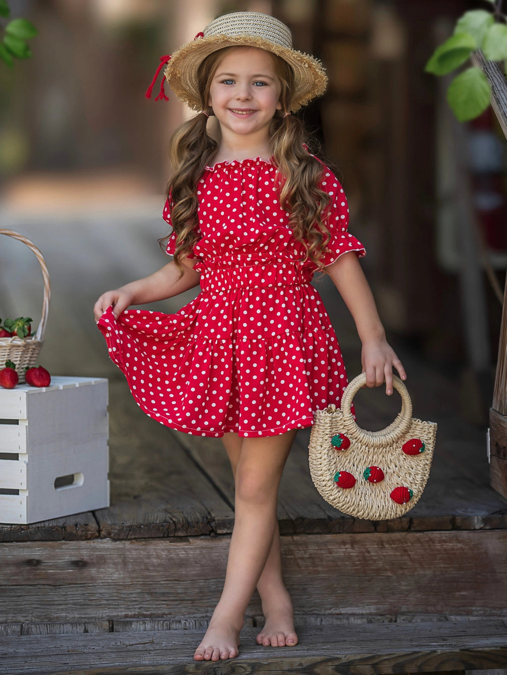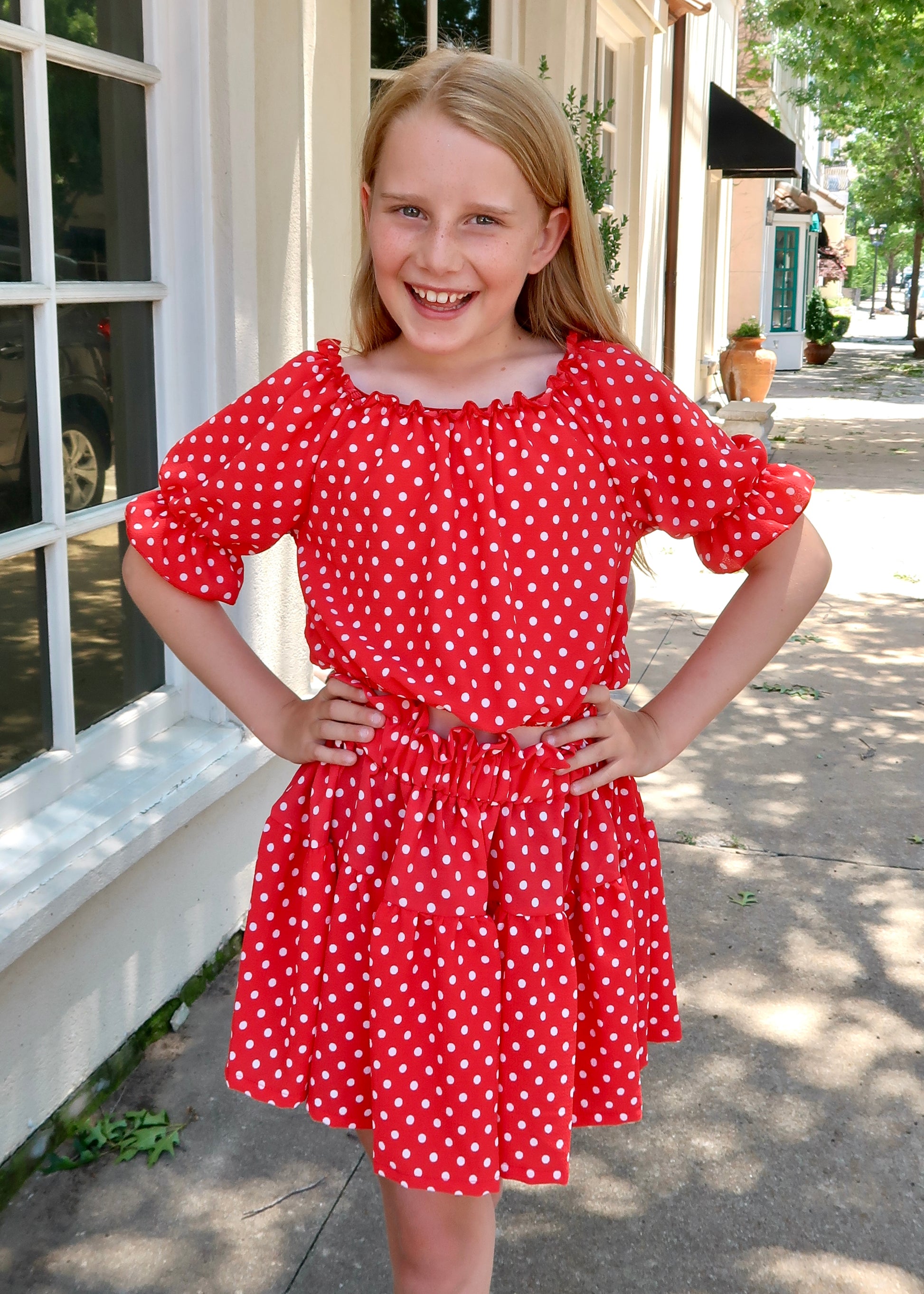 The Little's Delilah Skirt set is a chiffon polka dot tiered skirt set, detailed with neckline and waistline ruffles and puff sleeves. This set features an elastic waistband on the top and skirt.