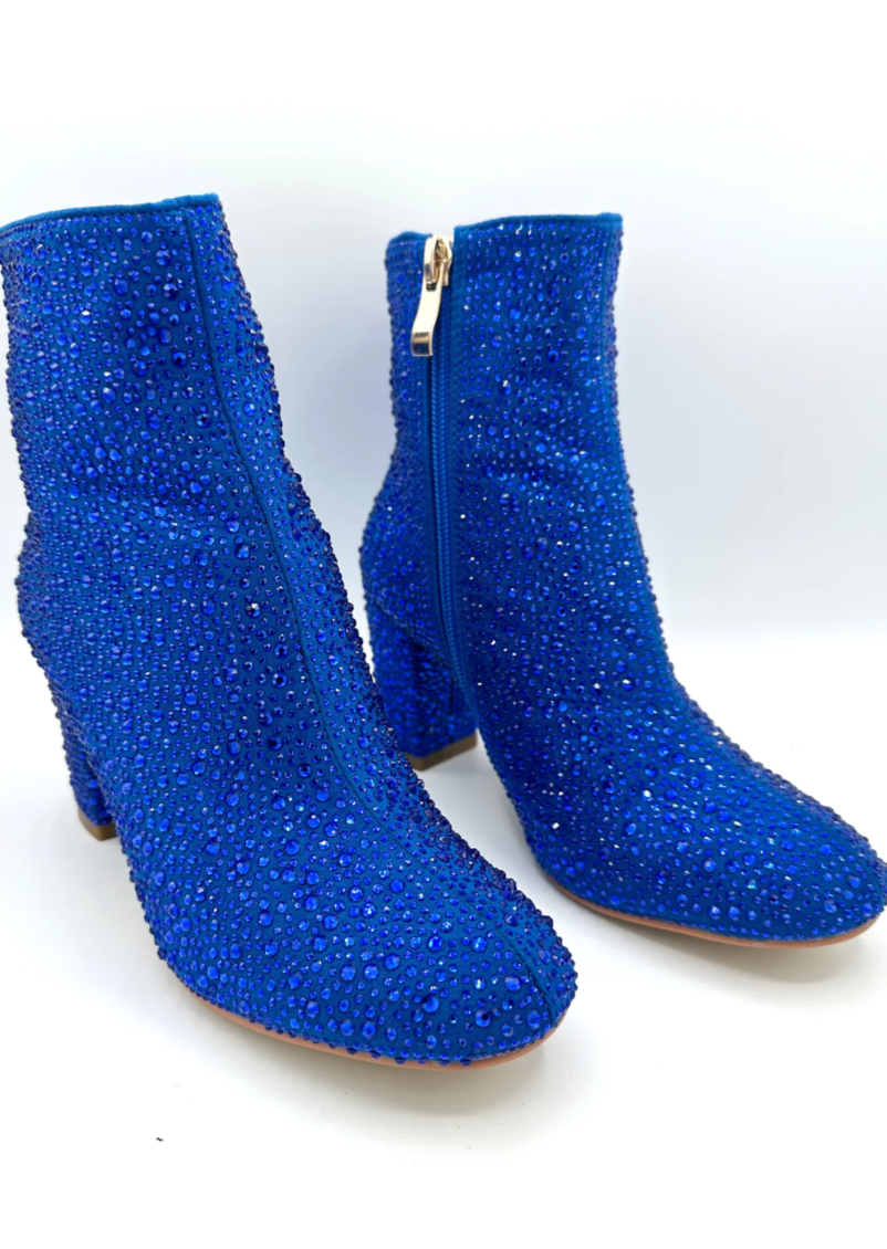 Made of blue suede material with individual blue stones placed all over, extra cushion for comfort to endure hours of standing, 2 1/2 inch heels - run small, we recommend to size up