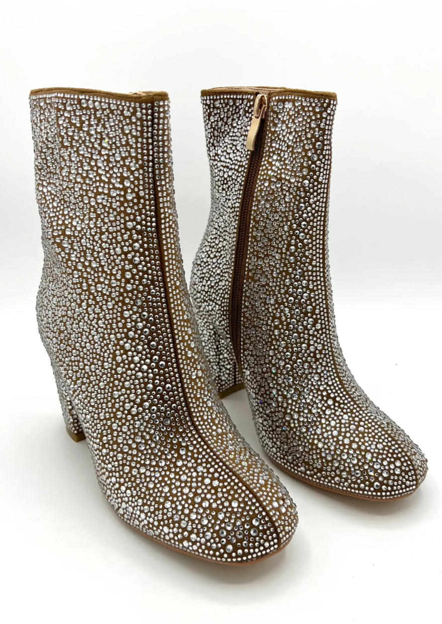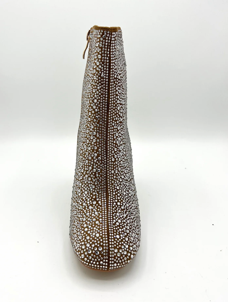 Made of tan suede material with silver individual stones placed all over, extra cushion for comfort to endure hours of standing, 2 1/2 inch heels, run small, we recommend to size up.
