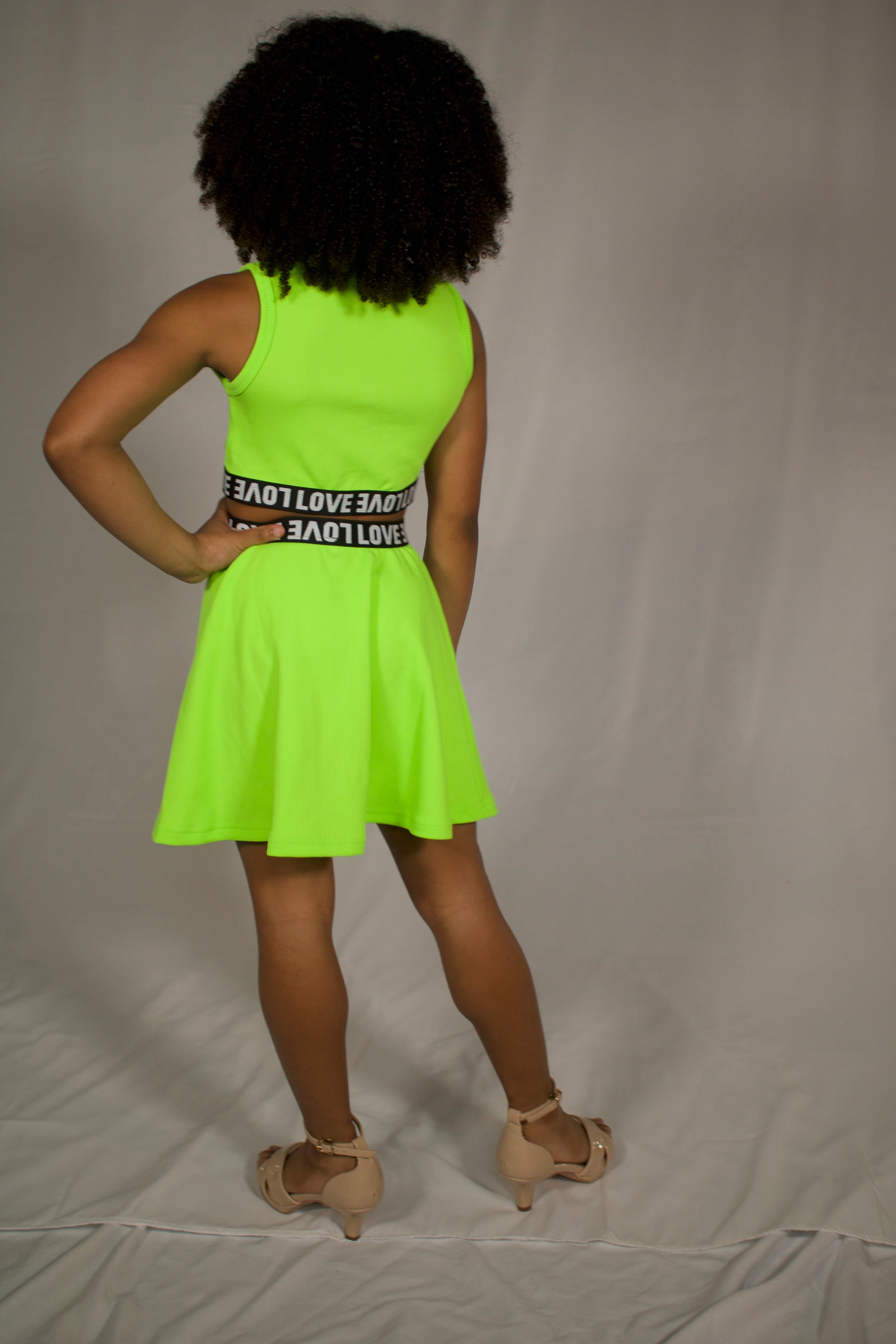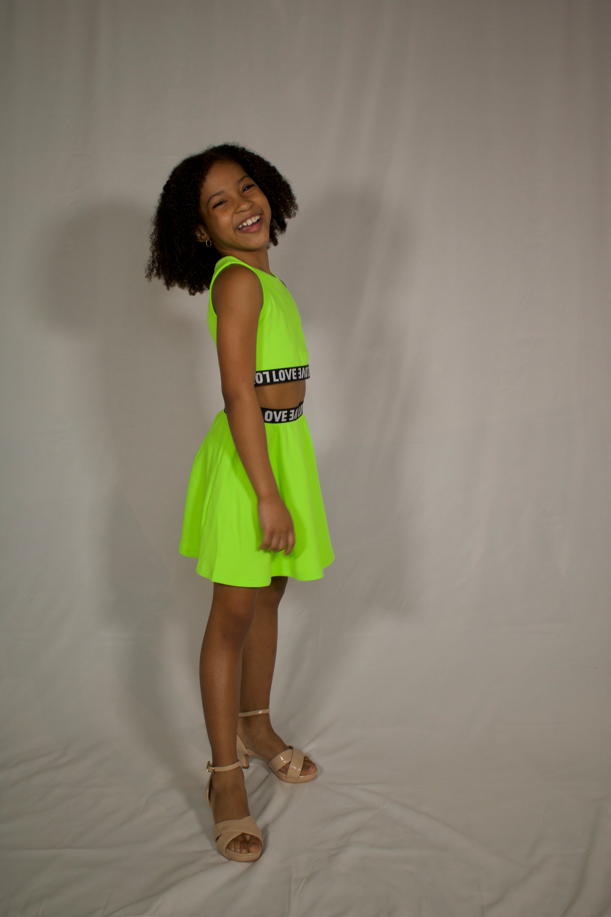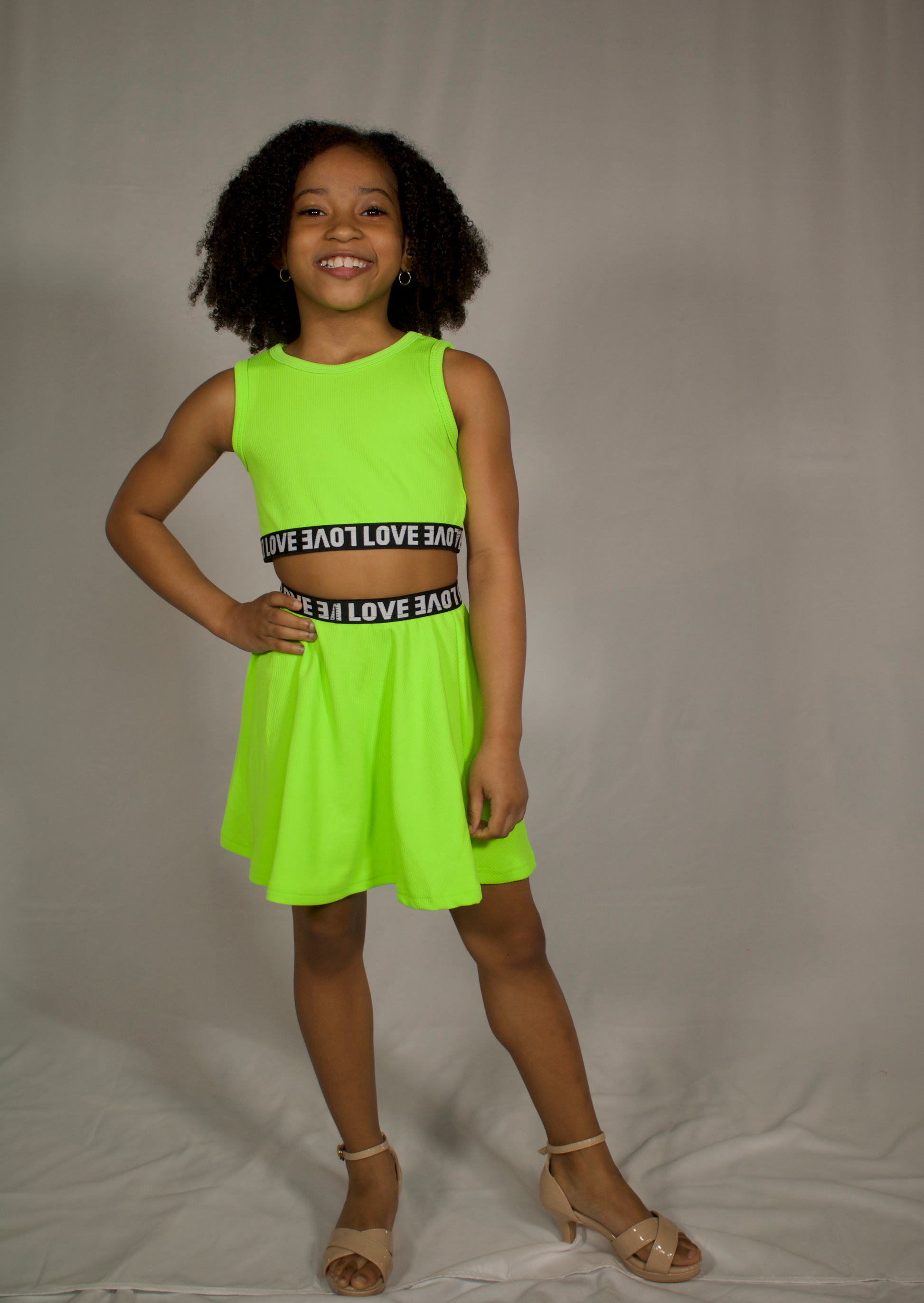 This set is the perfect athleisure outfit! This set has a crop tank top and a matching high-waisted skater skirt. This outfit has a love wording detailing on the waistband of the top and the skirt. This set comes in green and yellow.
