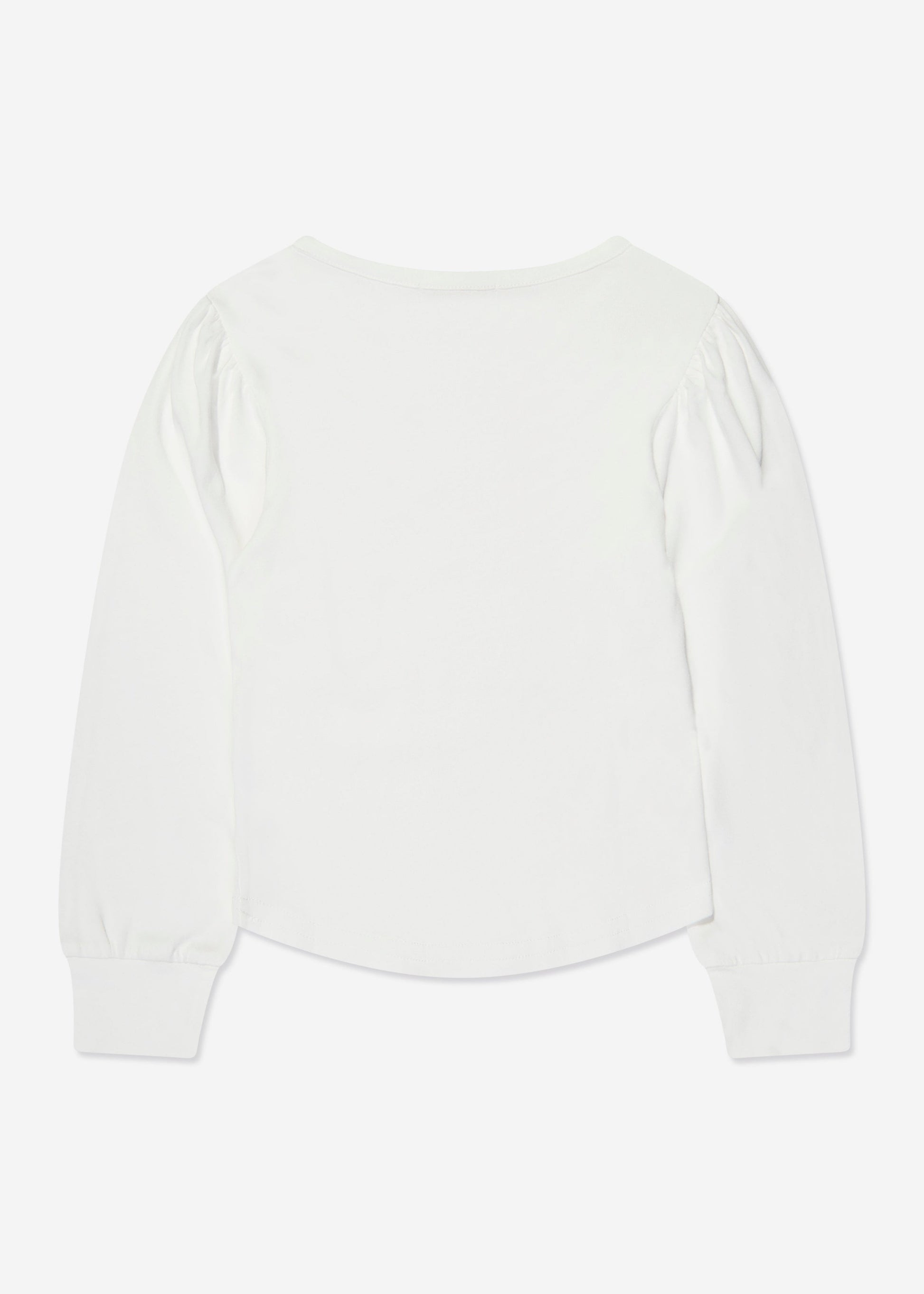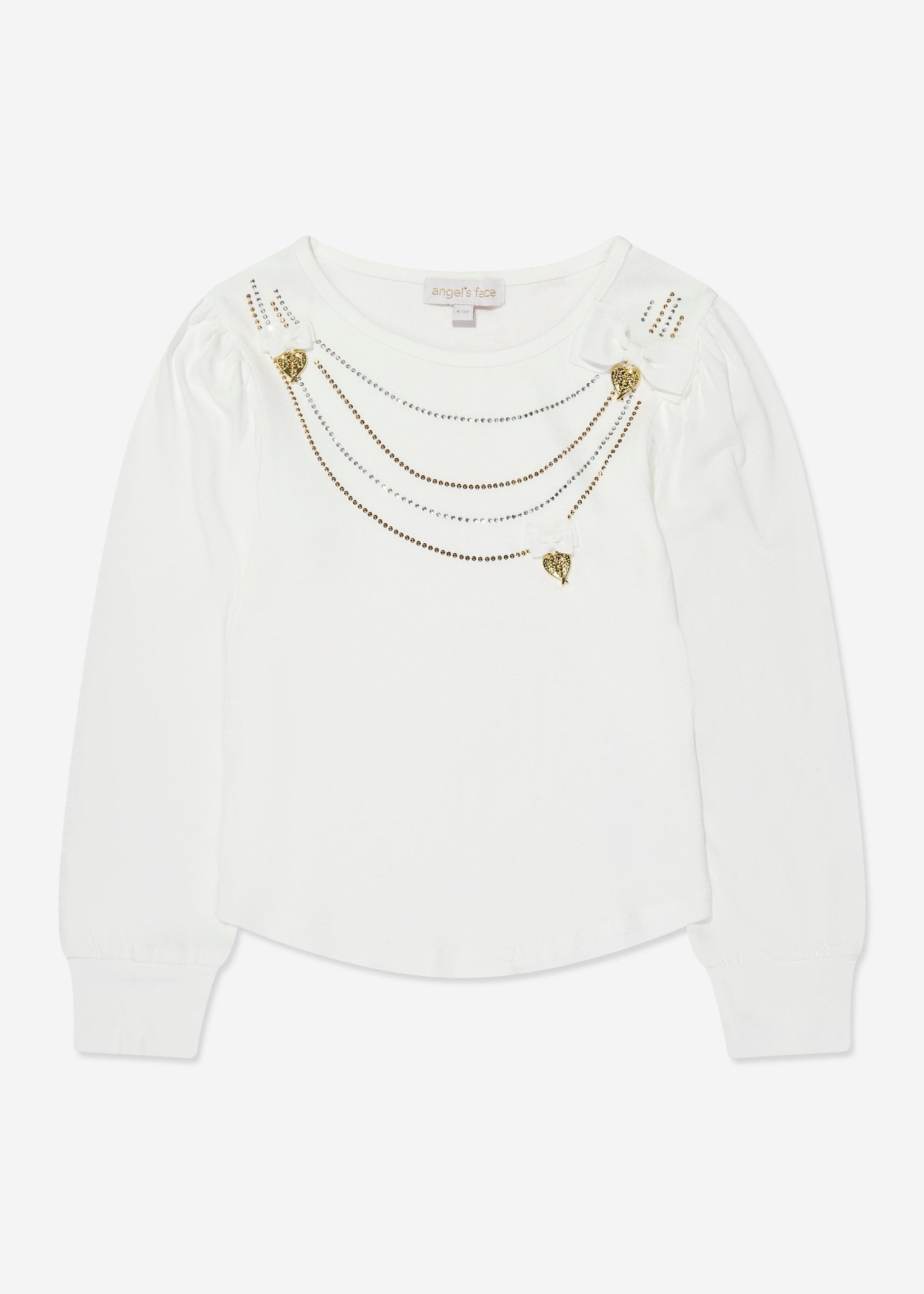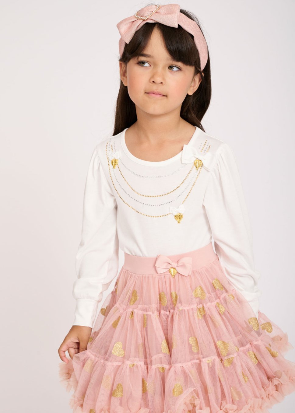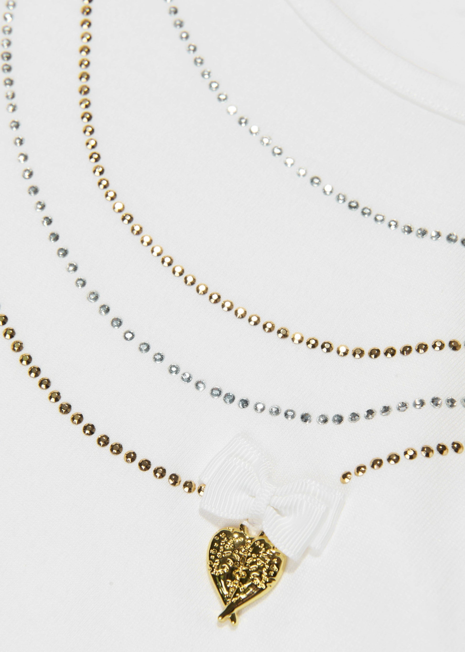 This white long sleeve top is depicted with sophisticated construction and care. Made in a refined sparkling necklace design that features three signature bow and gold heart charms. She will be obsessed!