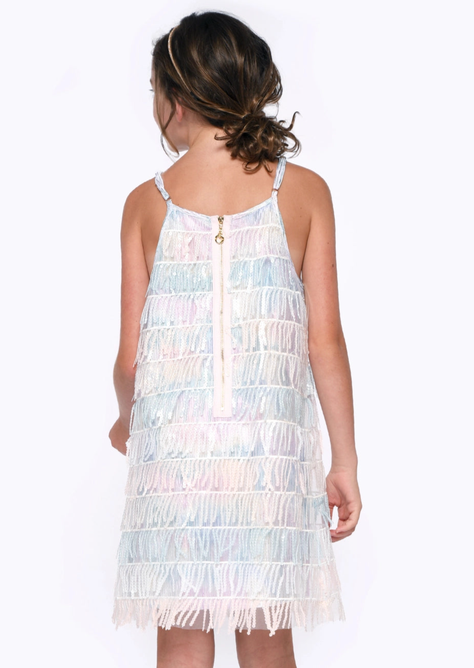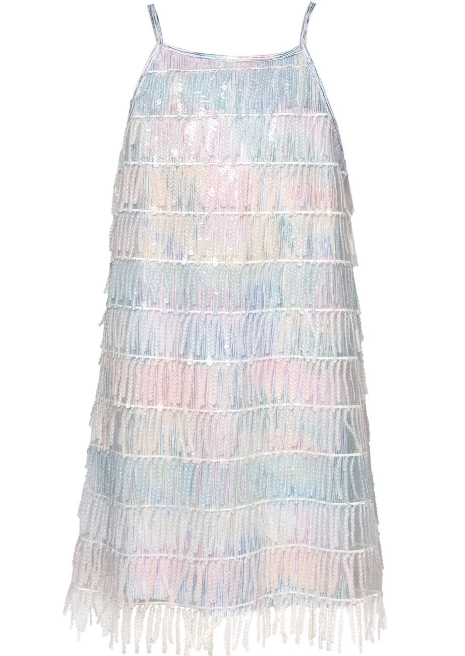 This adorable dress features a rainbow metallic fabric with multi colored sequin fringe. This dress has adjustable straps and a gold zipper for a closure in the center back.