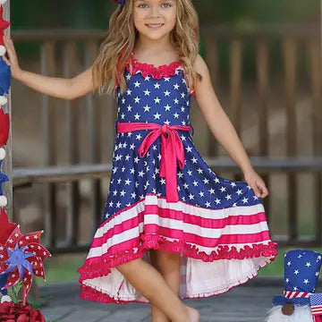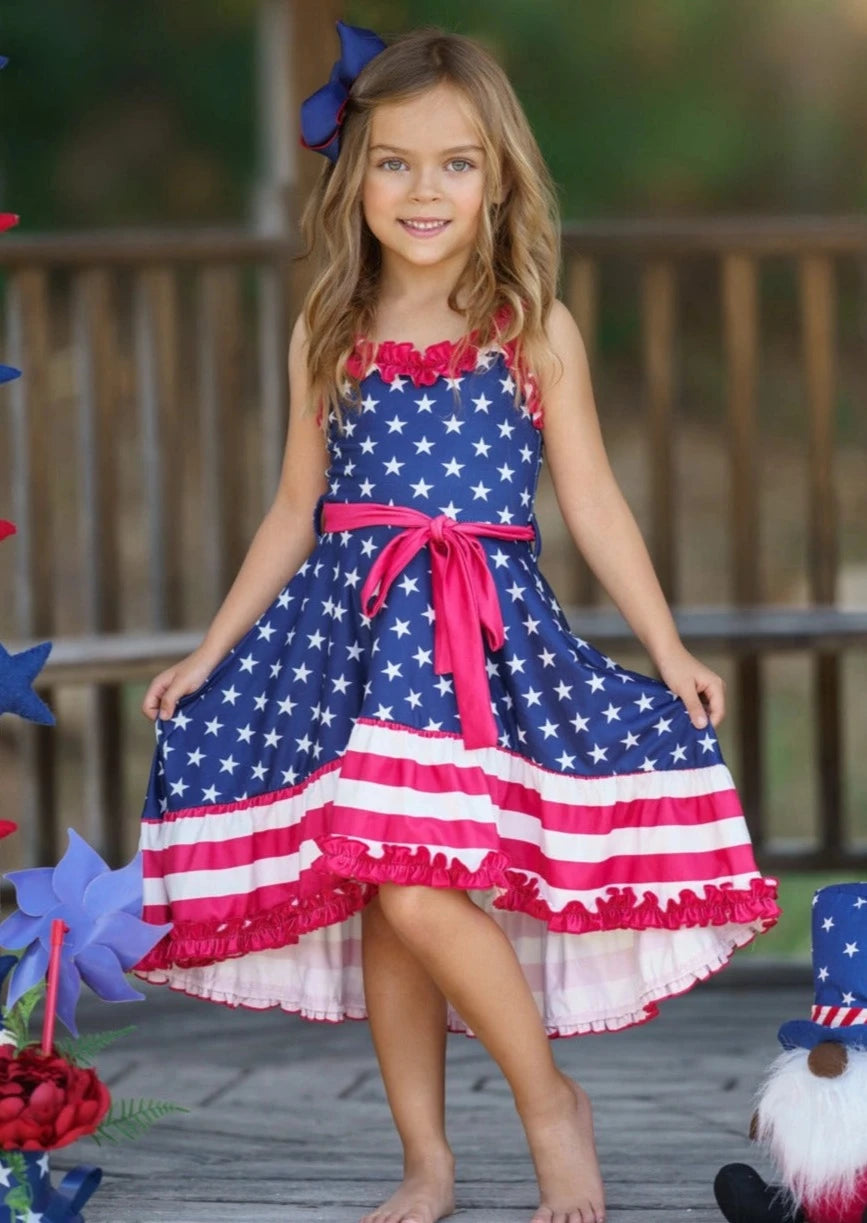 Little's Party in the U.S.A. Dress features a high-low skirt, detailed with ruffle trim. The elastic waistband features a crimson red wrap that ties around the center of the dress. This dress has a stretchy yet soft fabric that flows with movement.