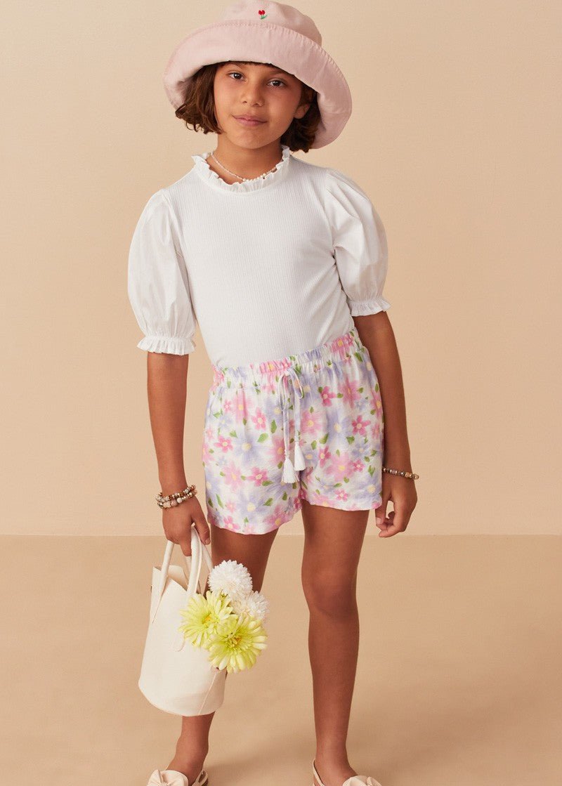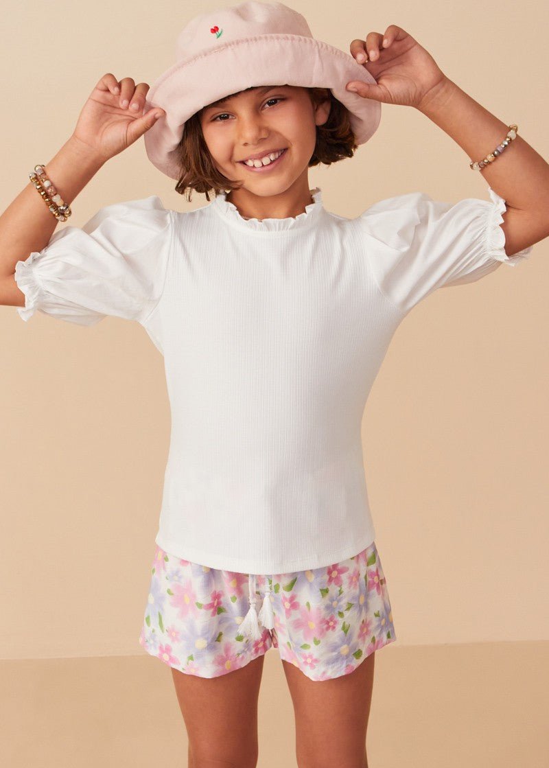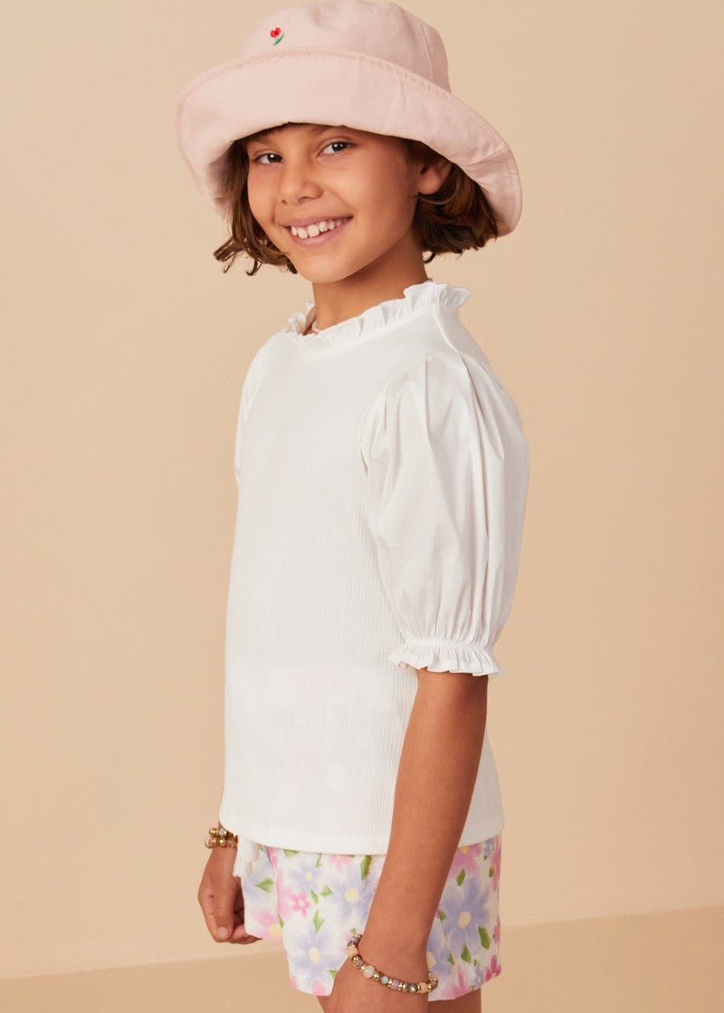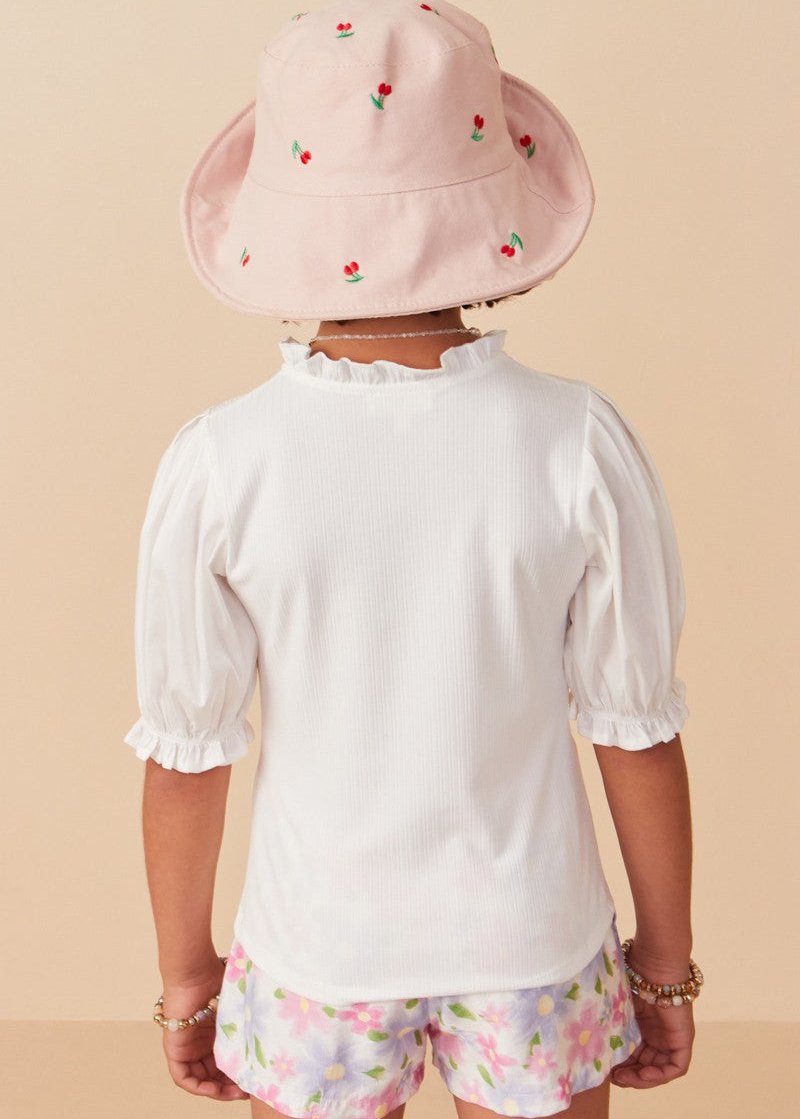 Lightweight Cotton Stretch. Ruffle Neckline. Cinched Puff Sleeves.