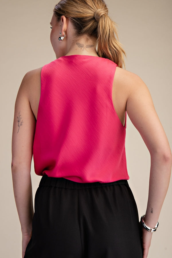 The Lou Draped Sleeveless Top is your go-to piece for effortless style. Featuring a luxurious fuchsia satin fabric with a beautifully draped cowl neckline, this sleeveless top offers both comfort and sophistication.
