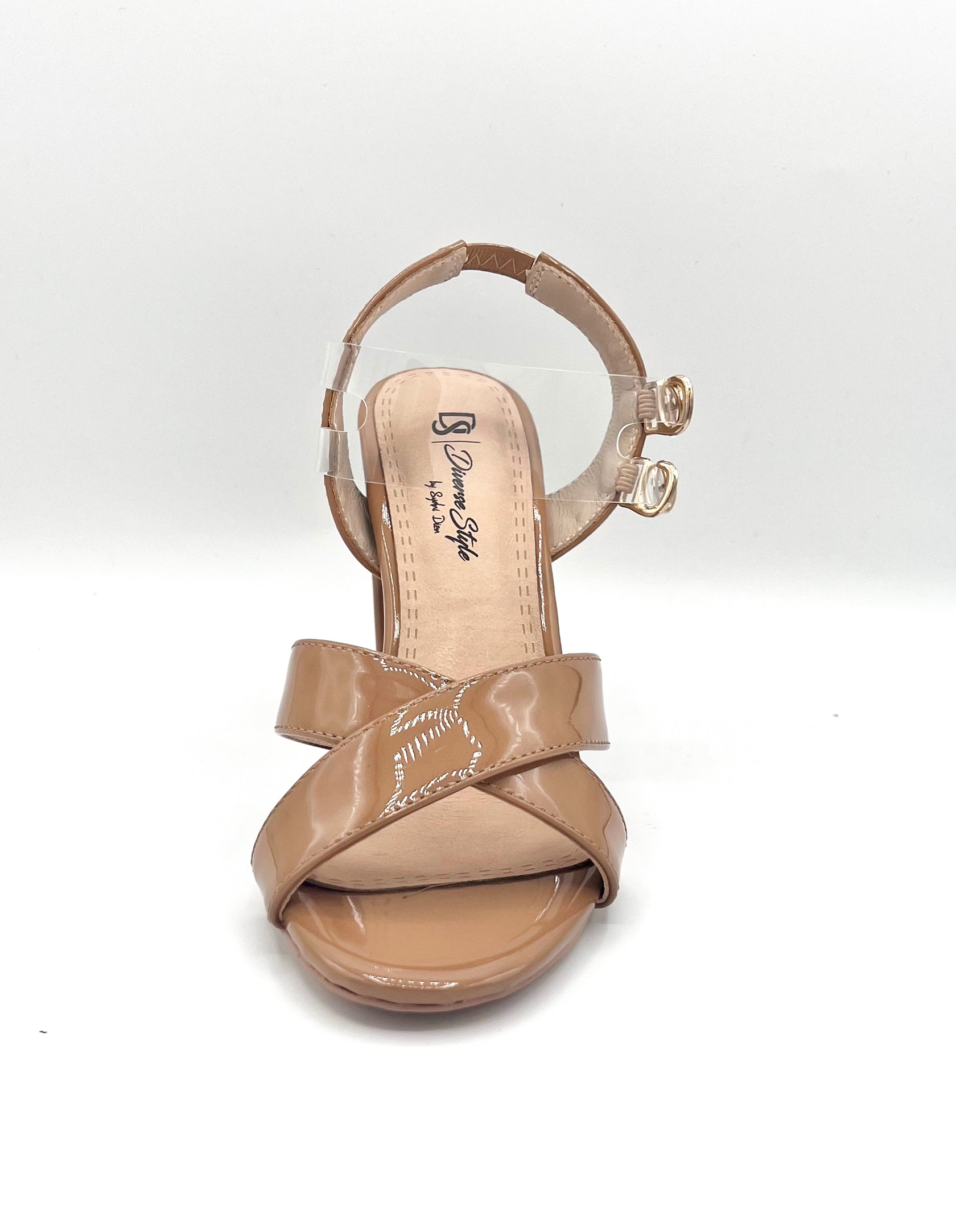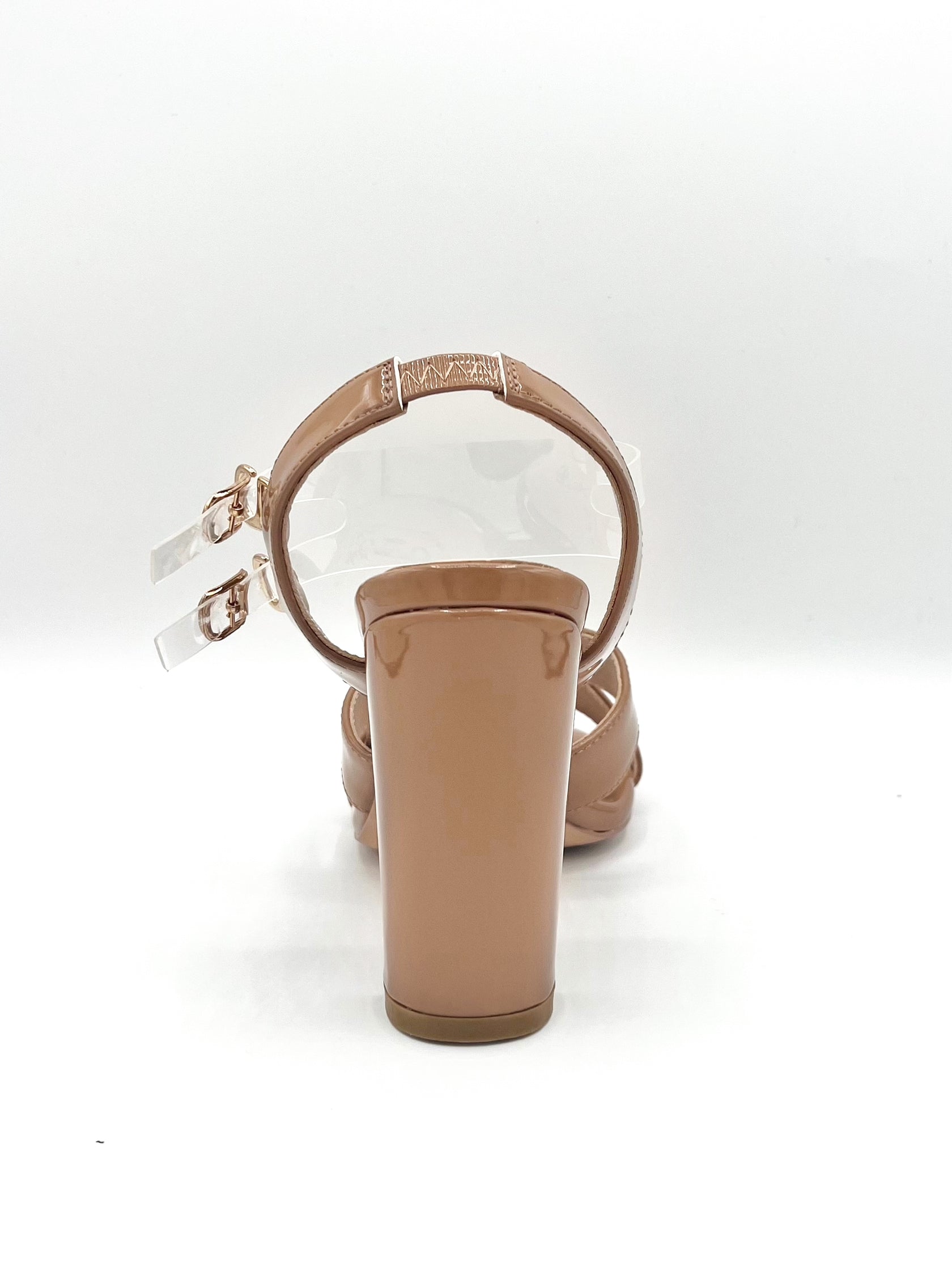 Genuine patent leather, matches medium skin tones, 4-inch heel, lucite ankle strop to the elongate leg. True to size. (Also available in kids with a 3" heel)