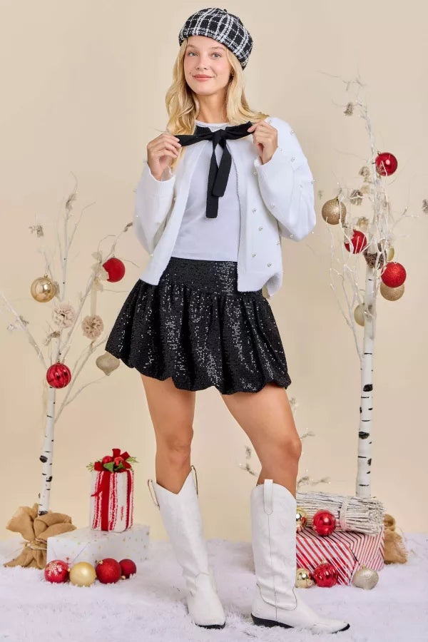 Add timeless elegance to your holiday looks with our Luisa Pearl Embellished Cardigan. Featuring delicate pearl accents and a chic black ribbon tie, this soft knit cardigan makes the perfect layering piece for festive parties, gifting, or elevating any winter outfit.
