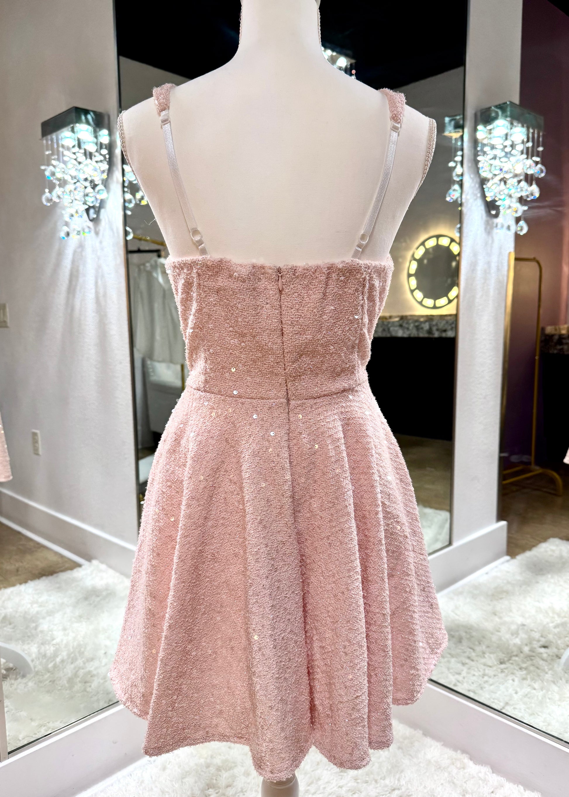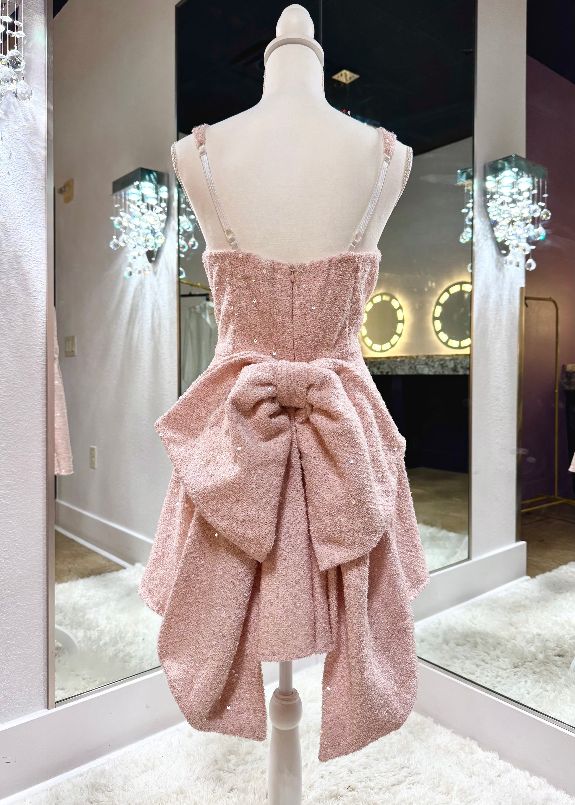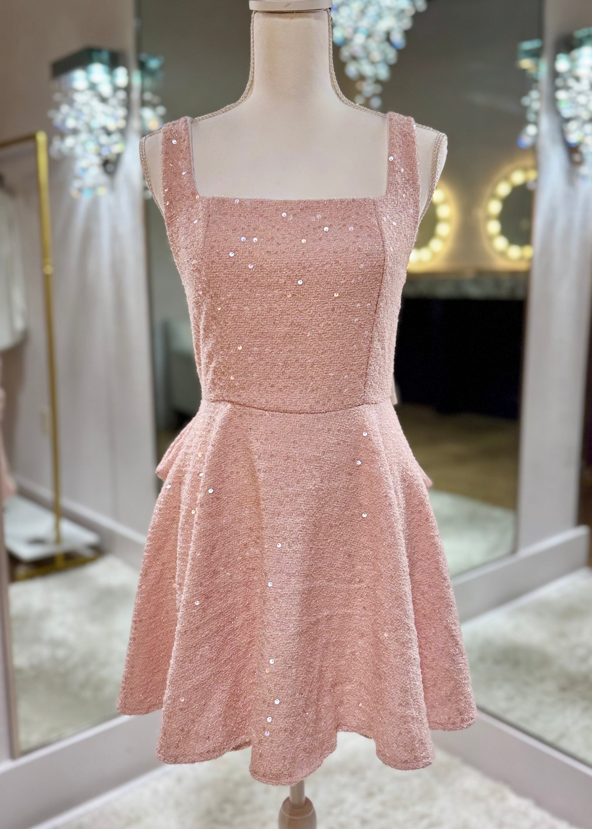 This dazzling square neck dress is crafted from shimmering pink sequined tweed with a detachable oversized bow, allowing you to choose its placement. The circular skirt was made to twirl and this dress was made for you to sparkle!