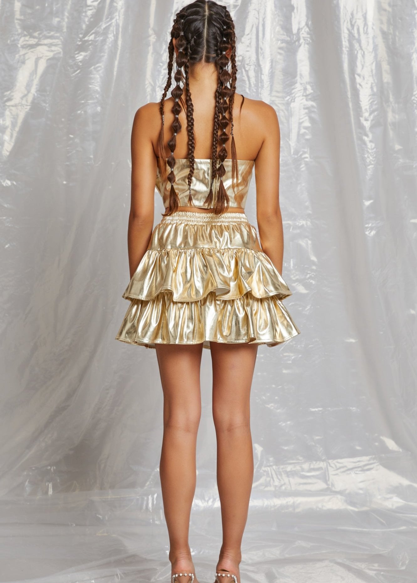 It's always golden hour when you're rocking this golden set! A layered ruffle mini skirt with tie waistband and cropped tube top adorned with an oversized bow complete this set! Finished with a back zipper and elastic on the back of the waistband.